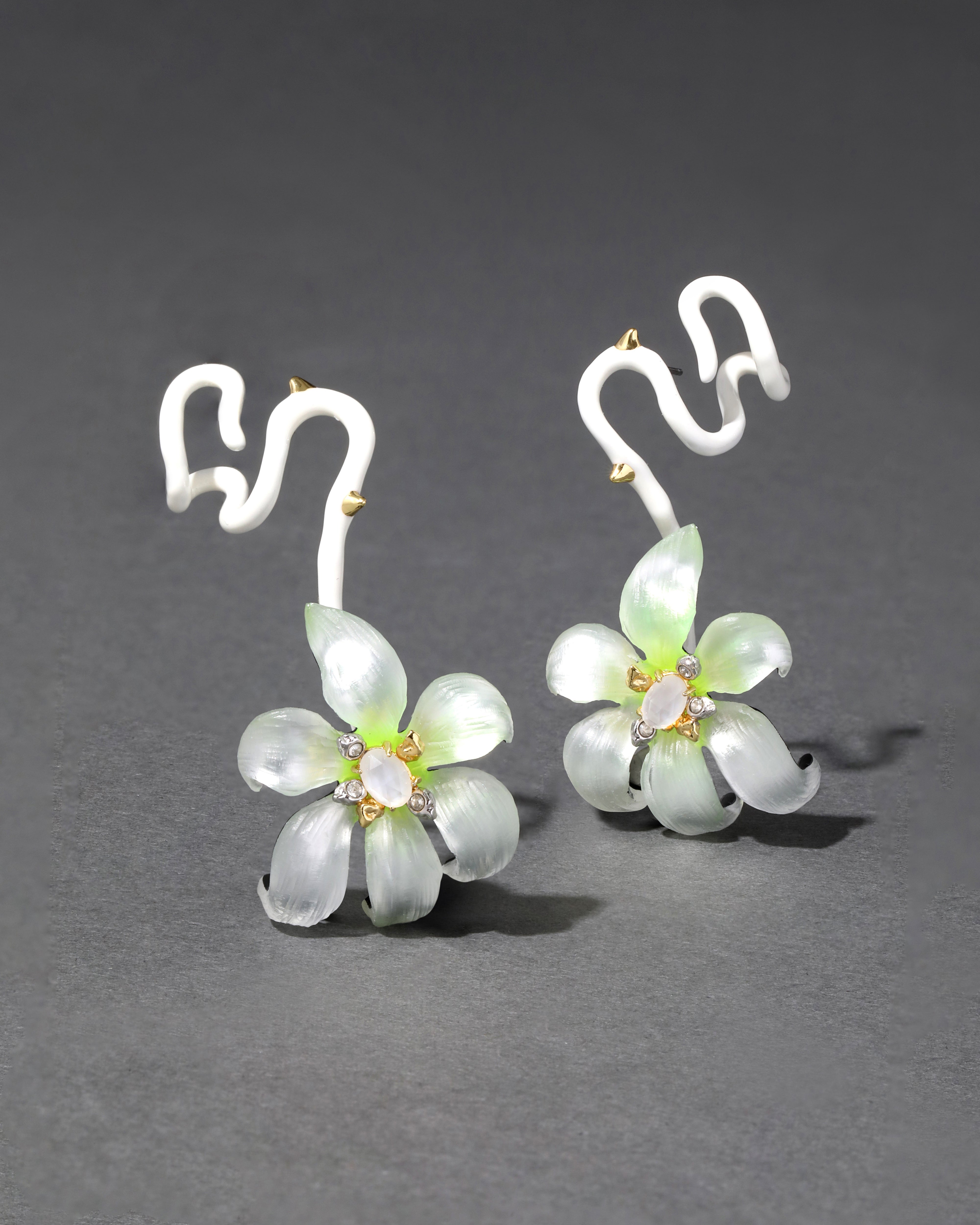 The Lucite that is used in these iridescent white Lucite flower ear climber earrings is a signature material of the Alexis Bittar brand. This acrylic-type material is high quality, and carvable. Making it a desirable jewelry material for customization and hand painting.