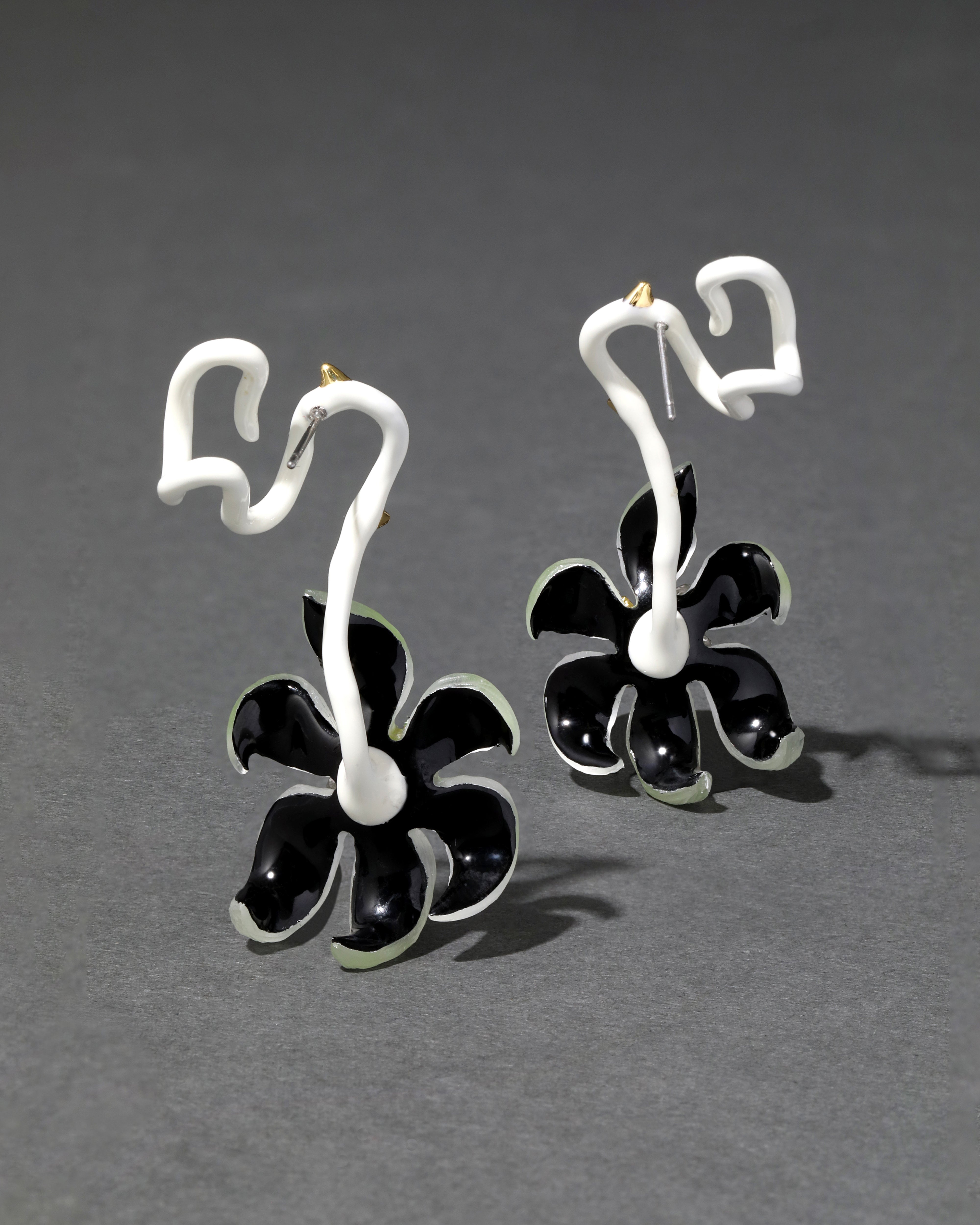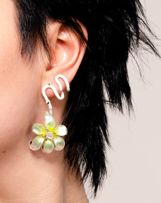 We recommend removing the iridescent white Lucite flower ear climber earrings before showering or swimming.