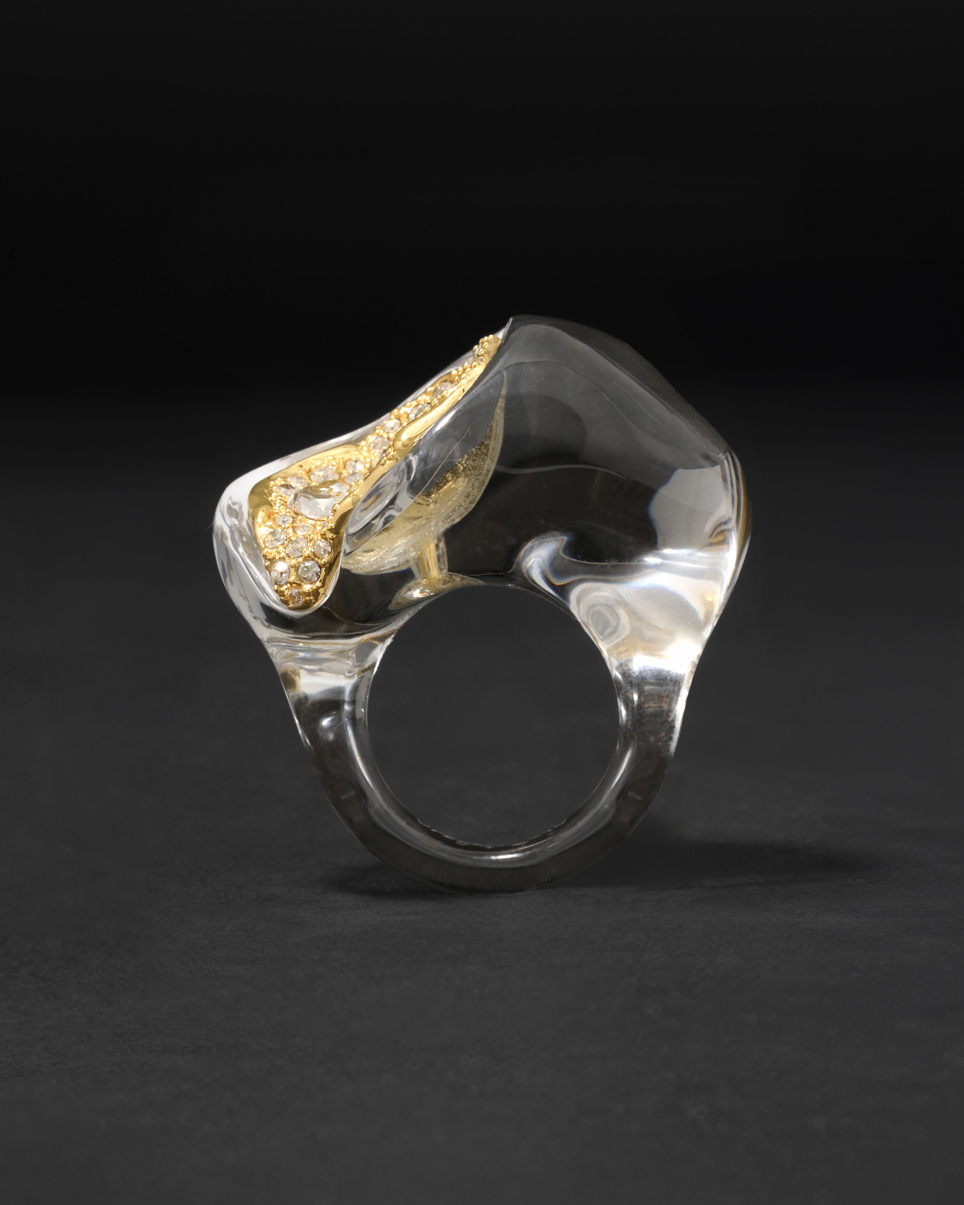 Seamless hand-sculpted Lucite ring is hand-carved in an organic watery silhouette, and hand-polished for a lustrous glacial glow. Inset with a geode inspired cluster of crystal pavé encrusted in molten 14k gold plated metalwork.