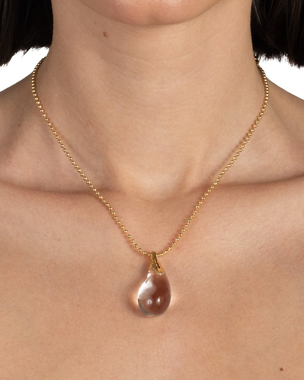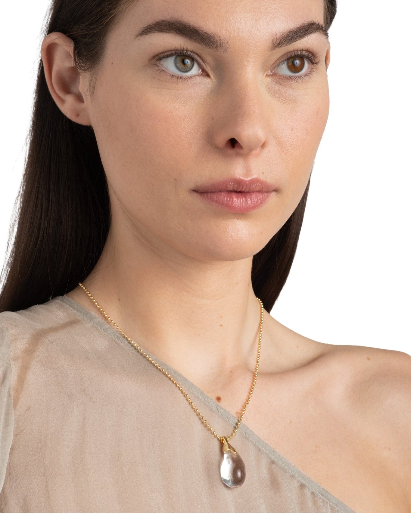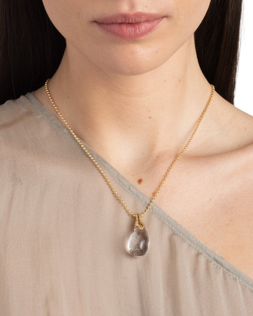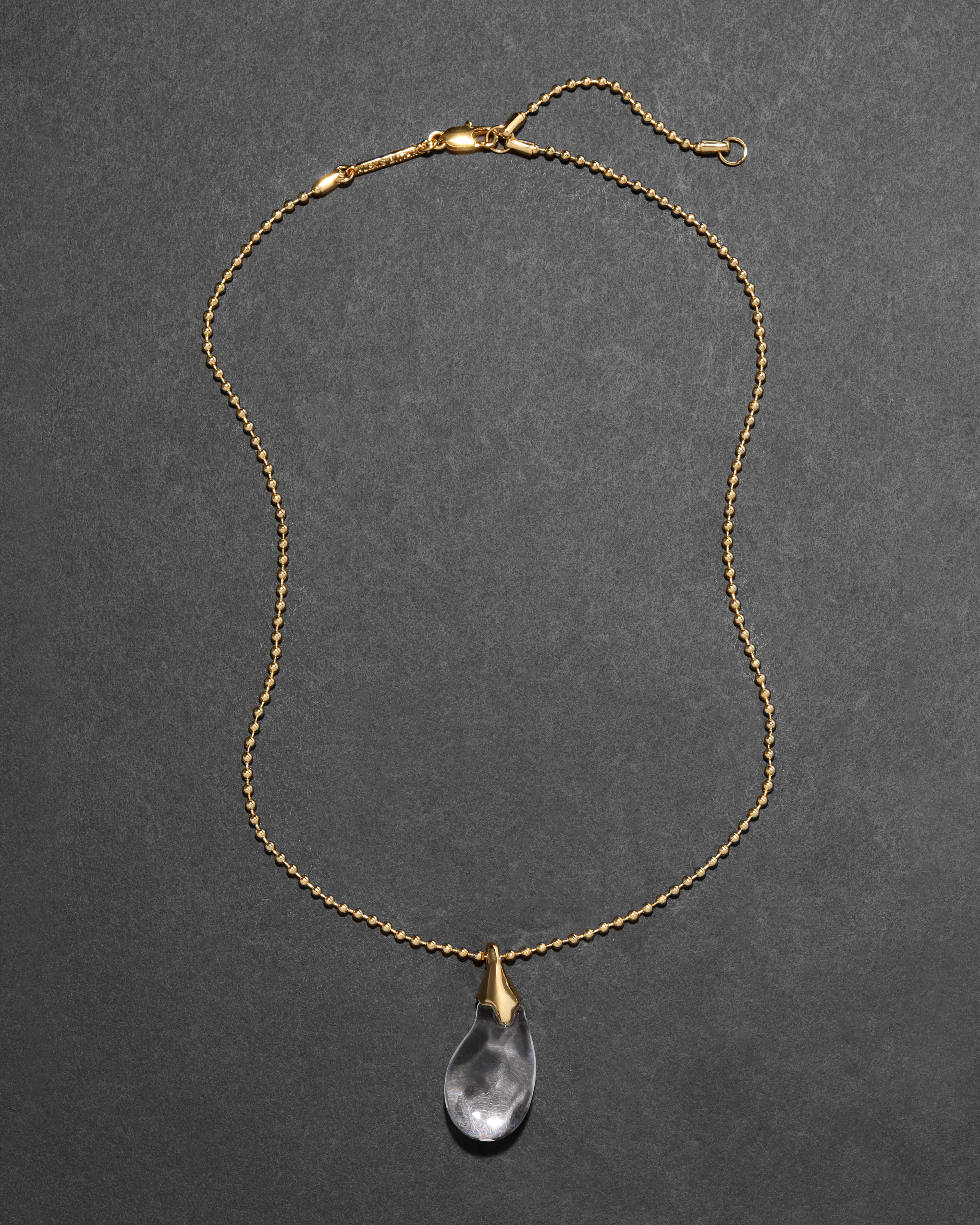 A classic Alexis Bittar silhouette, this teardrop pendant necklace has a brilliant glow from hand-carved and hand-polished watery clear Lucite, capped with 14k gold plated metalwork. This versatile pendant is strung on a 14k gold plated ball chain necklace and is great for layering or alone for a minimalist style.