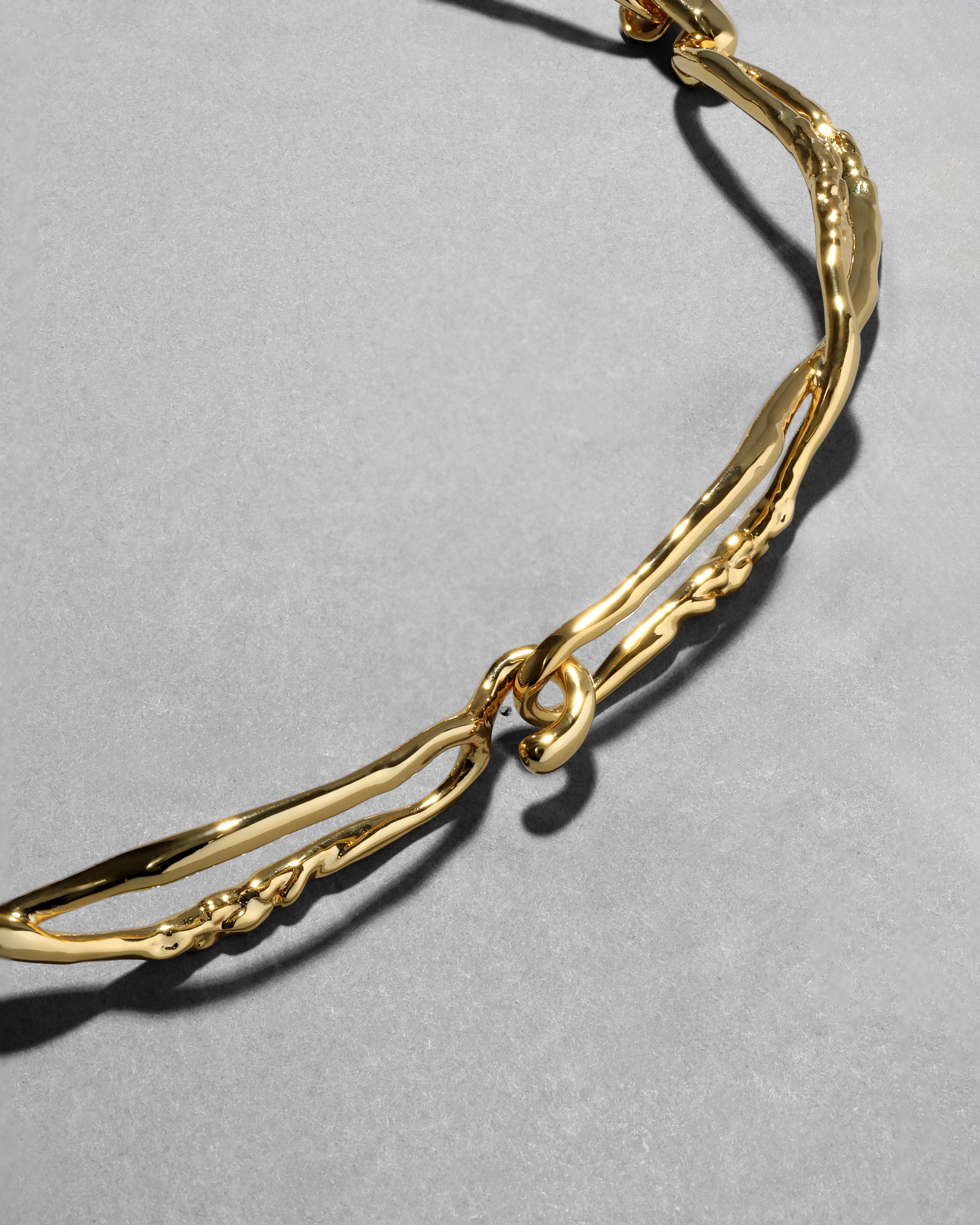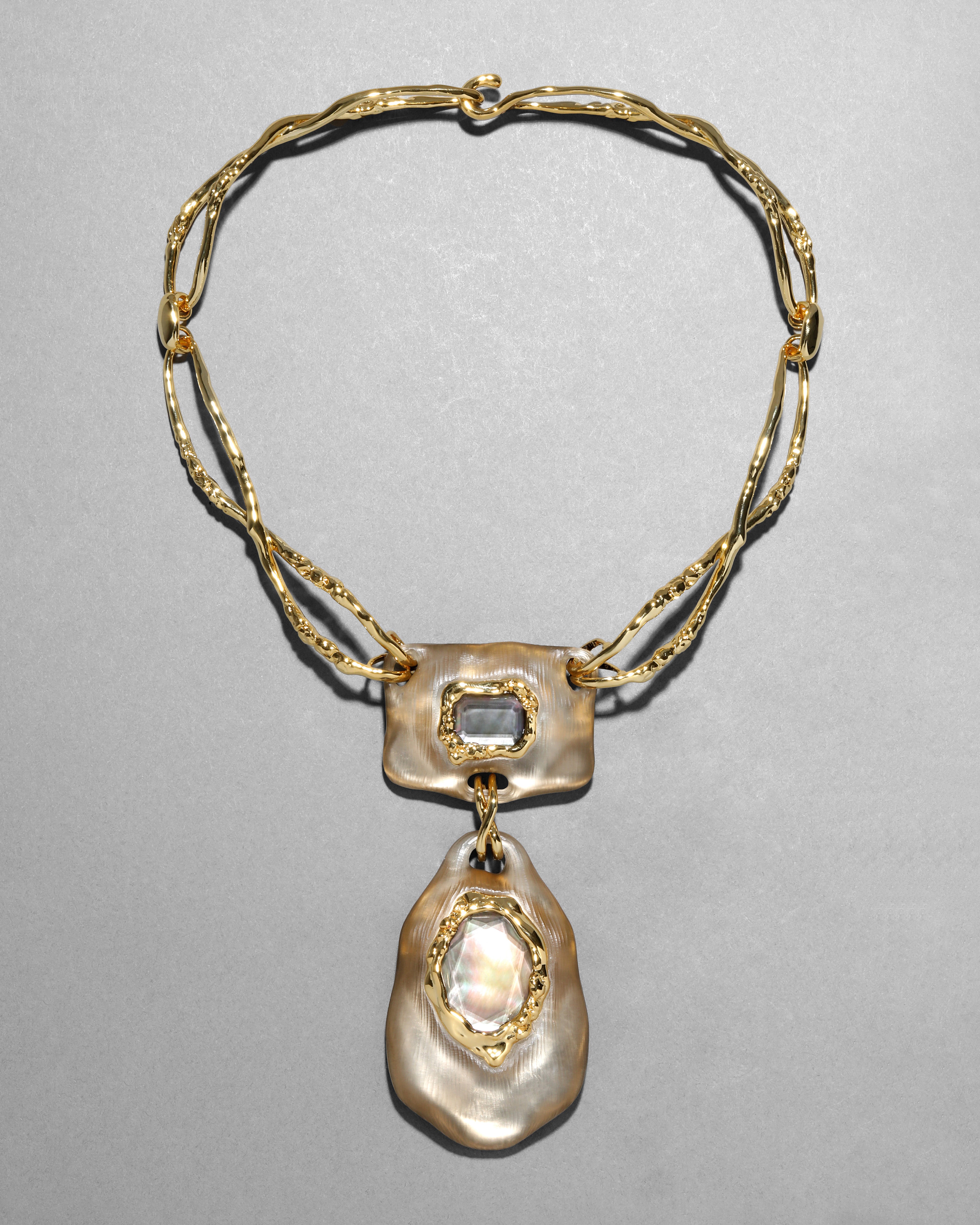 This sculptural 14k gold plated drop necklace features a lustrous hand-sculpted and hand-painted Lucite pendant that frames two opalescent mother of pearl doublets in molten bezel settings. Finished with twisted molten metalwork that elegantly frames the neckline.