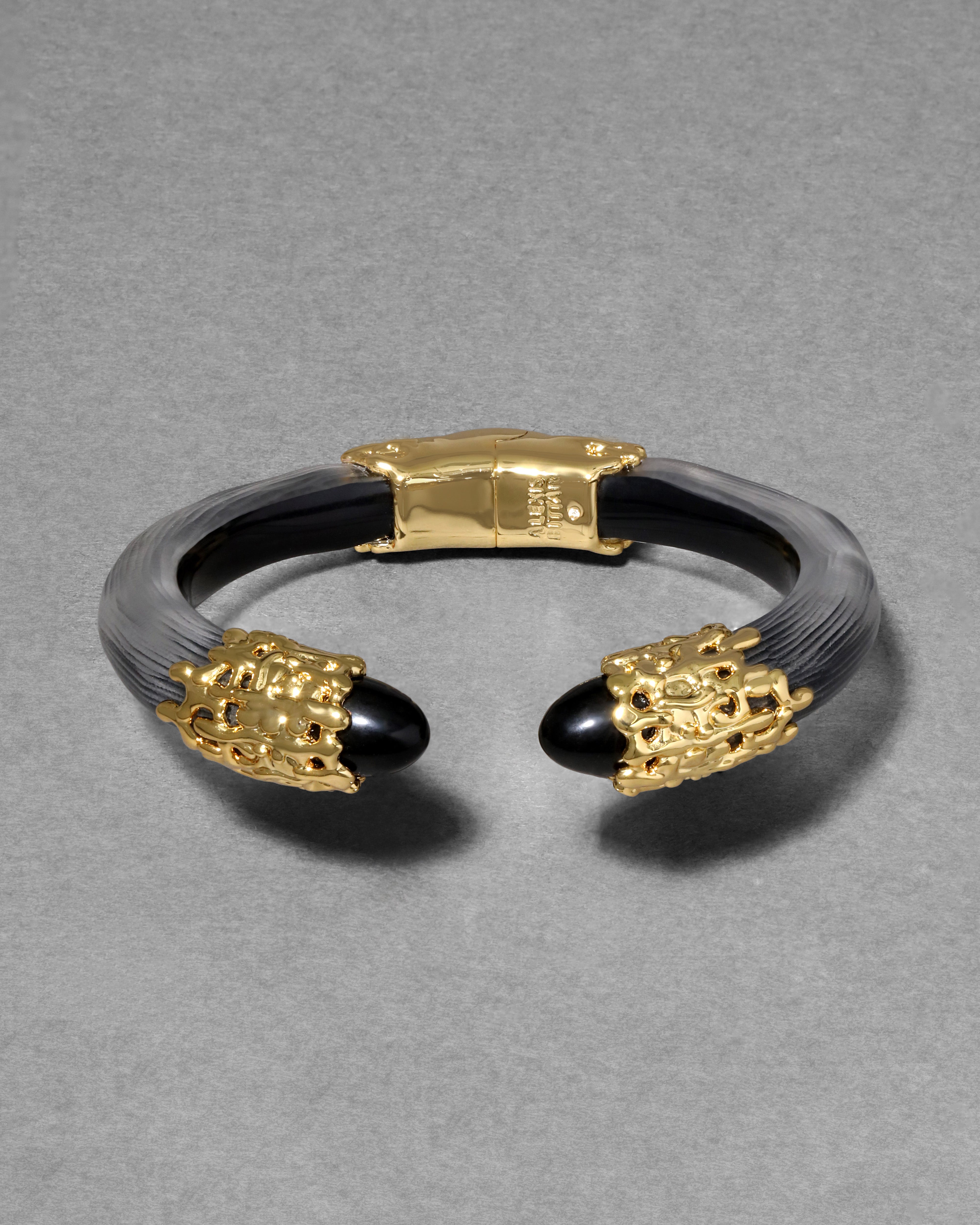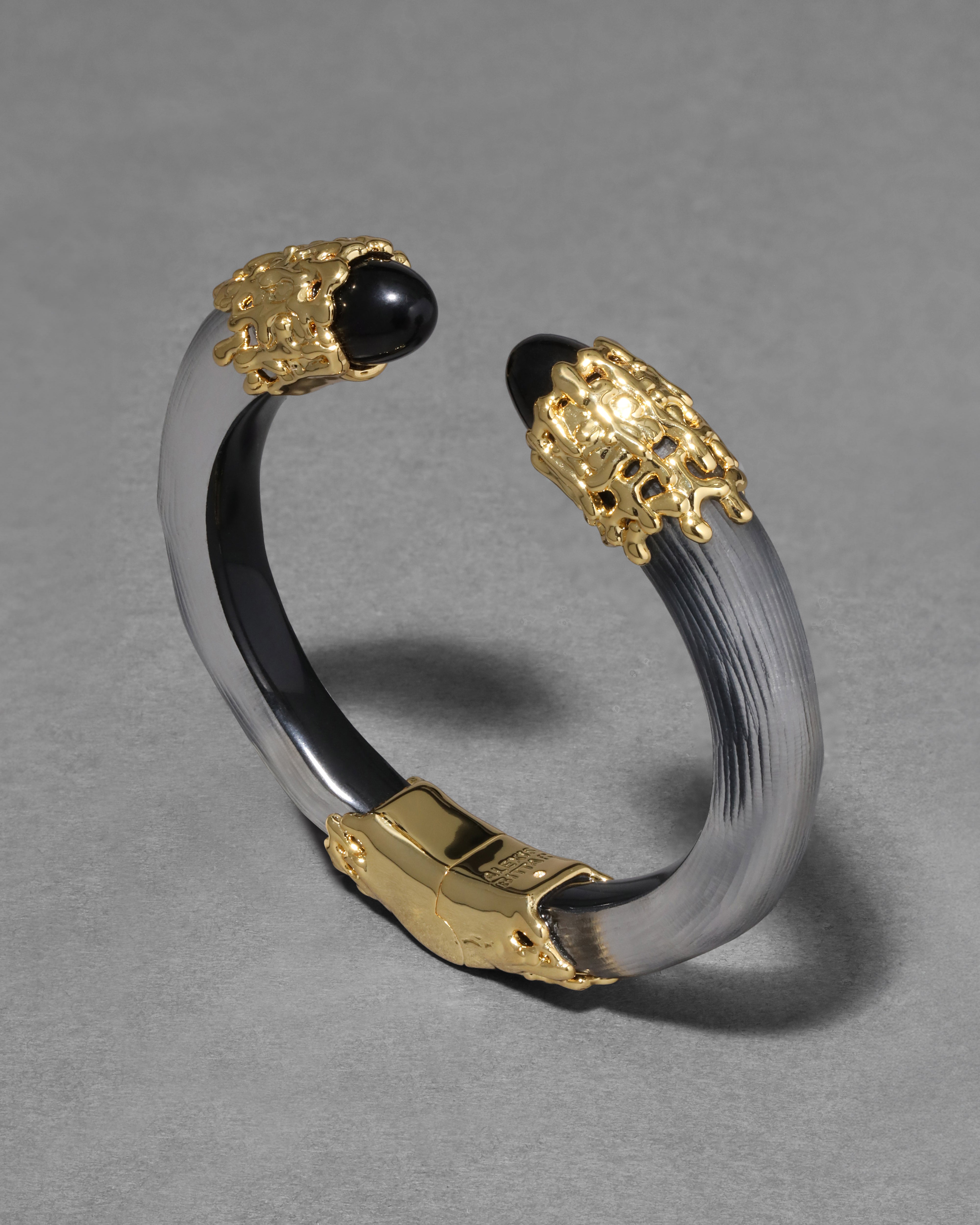 Rich black obsidian cabochons are surrounded by Brutalist-inspired 14k gold plated metalwork on this slim profile, hinged bracelet. The hand-sculpted Lucite is hand-painted in a classic matte black, that seems to glow from within.