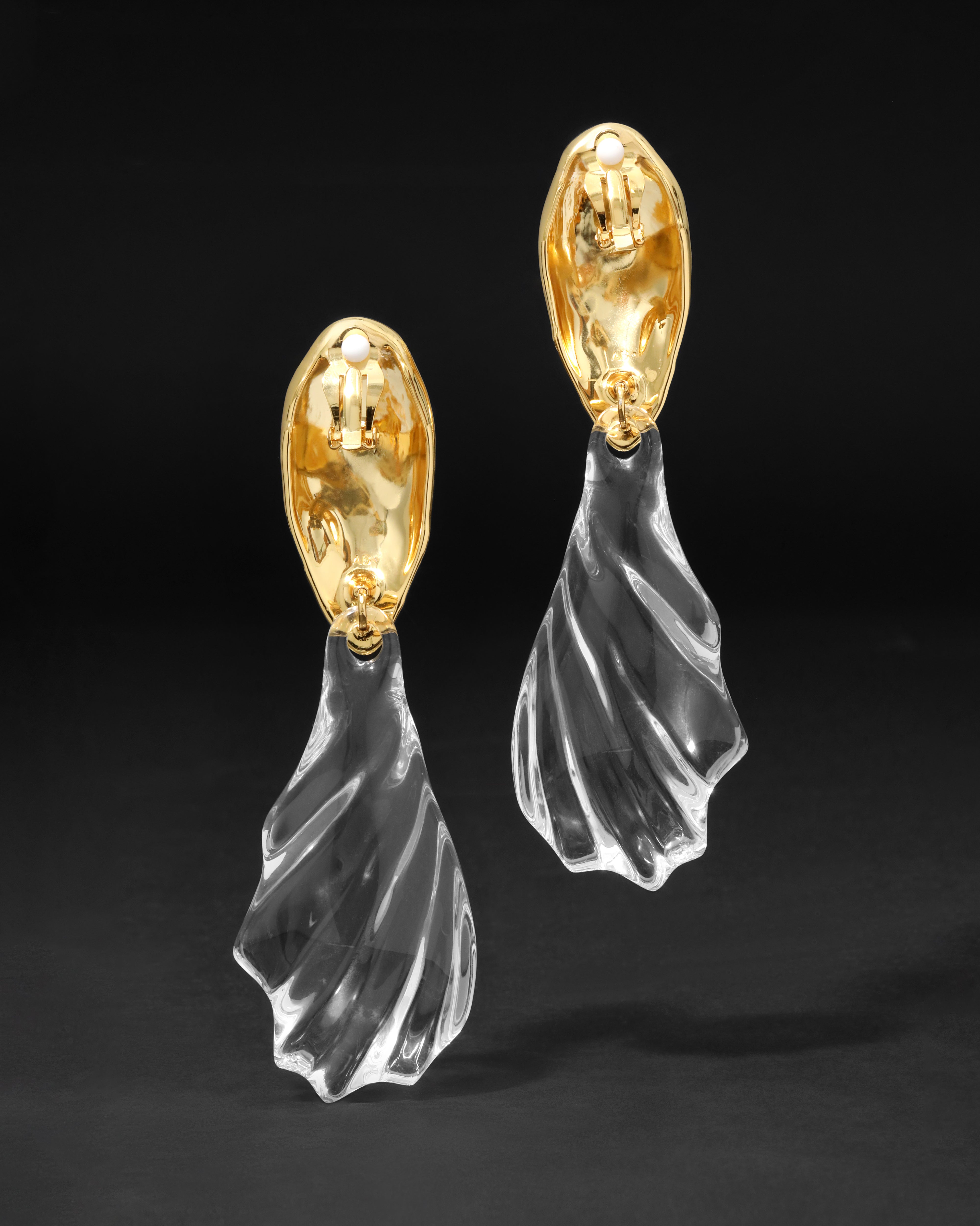 Oversized liquid Lucite clip-on earrings are hand-sculpted with a watery silhouette that catch light from every ripple. Suspended from high-shine 14k gold plated metalwork, hammered for a radiant Brutalist inspired finish.