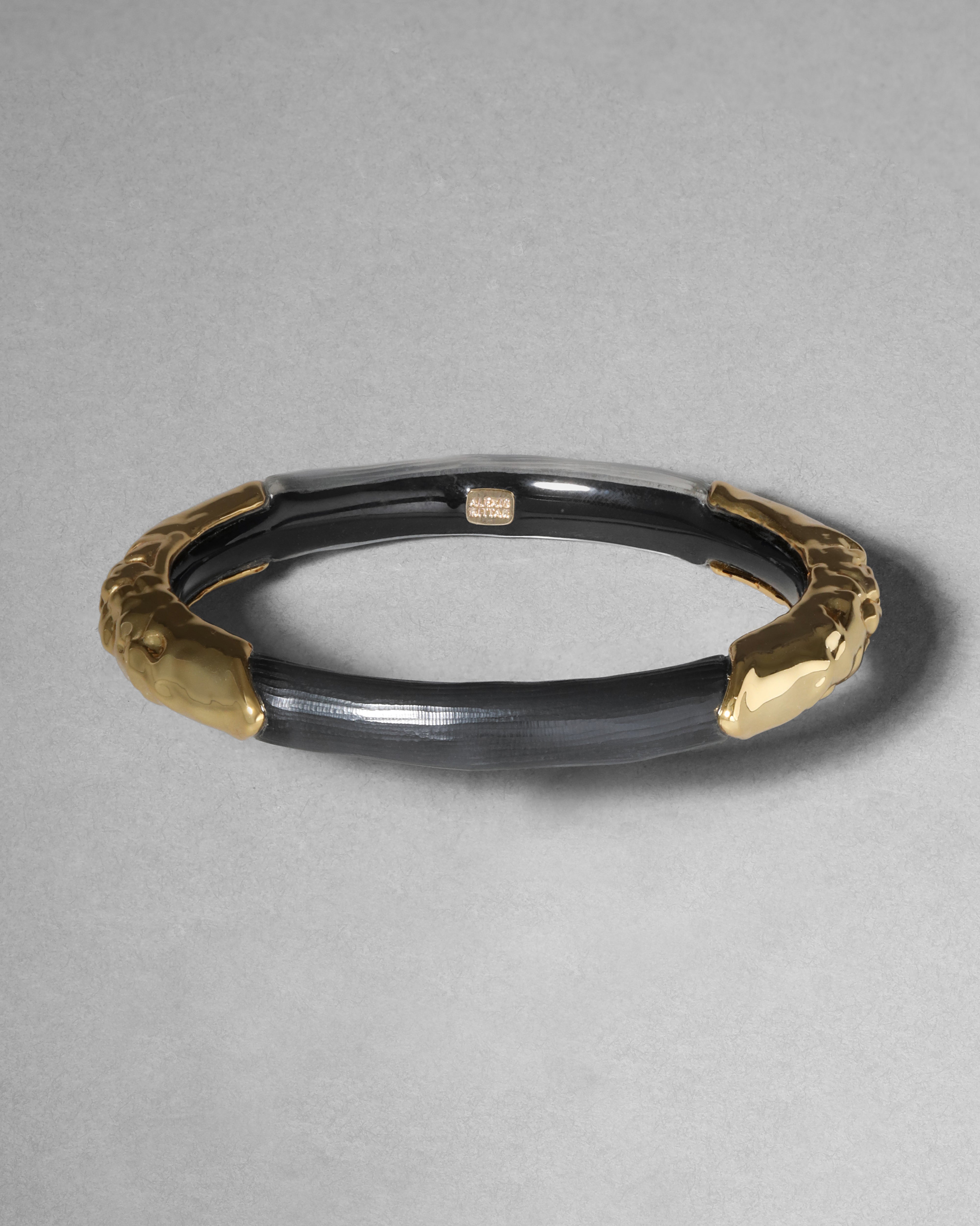 With a 1970s Brutalist inspired design, this hand-sculpted Lucite bangle has a slim silhouette. Hand-painted in classic black and finished with textured 14k gold plated metalwork.