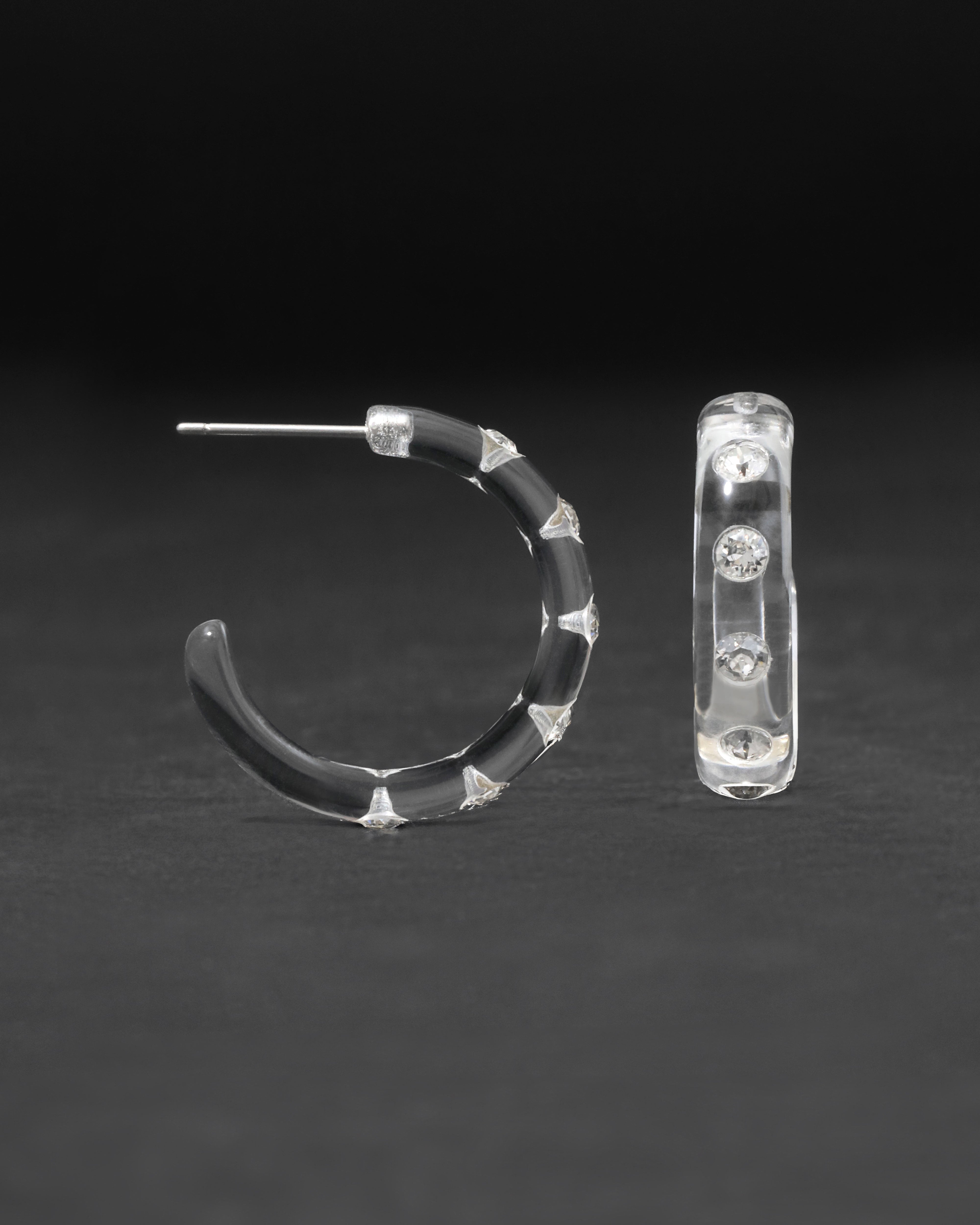 A modern twist to a timeless silhouette, these liquid clear Lucite hoop earrings are hand-sculpted and hand-polished, then studded with glistening clear crystals.