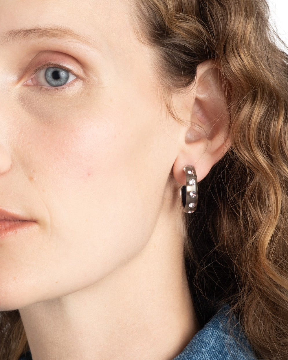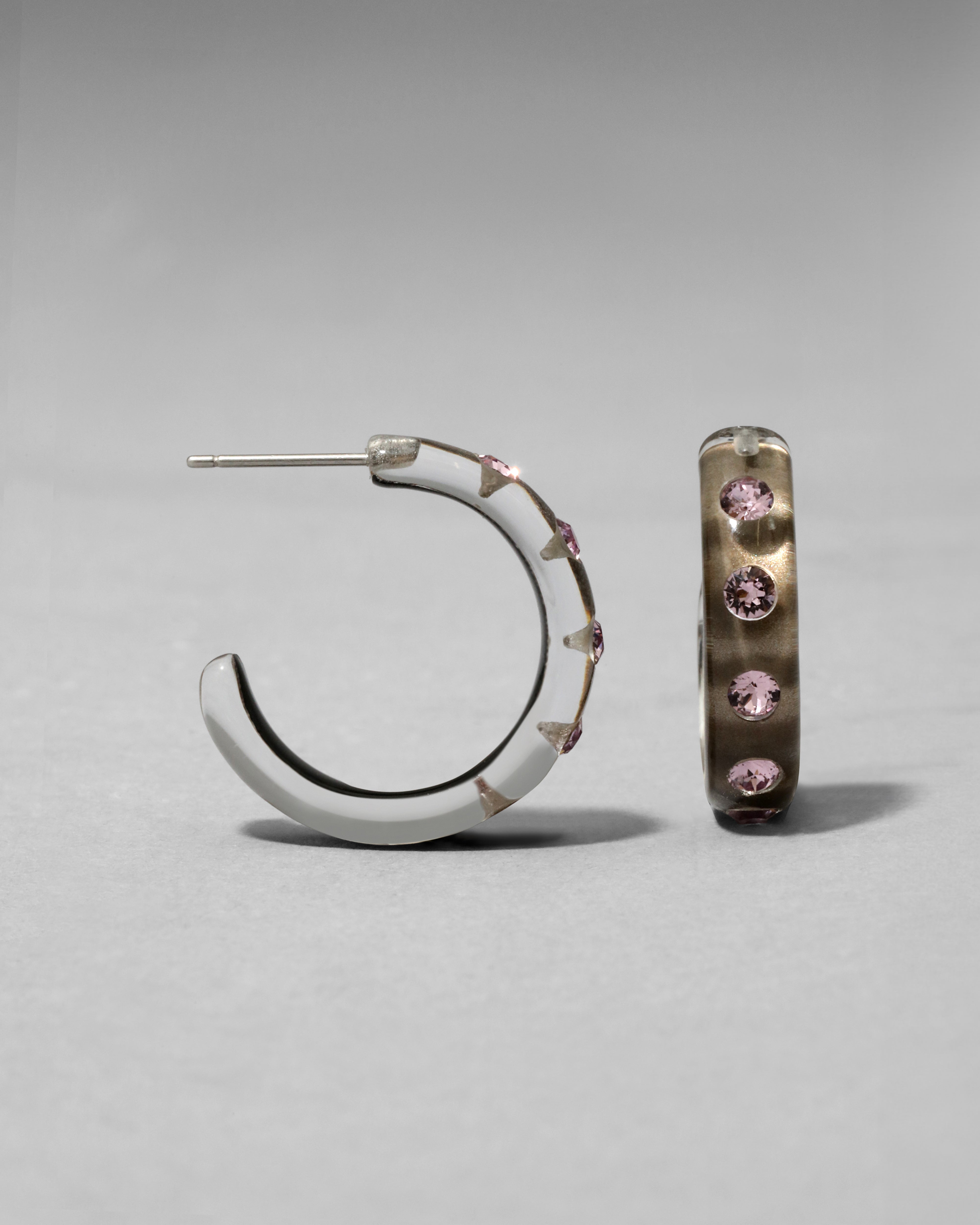 A modern twist to a timeless silhouette. These hand-sculpted luminous Lucite hoop earrings are hand-painted in a sandy dune hue, then studded with glistening dusty rose crystals.