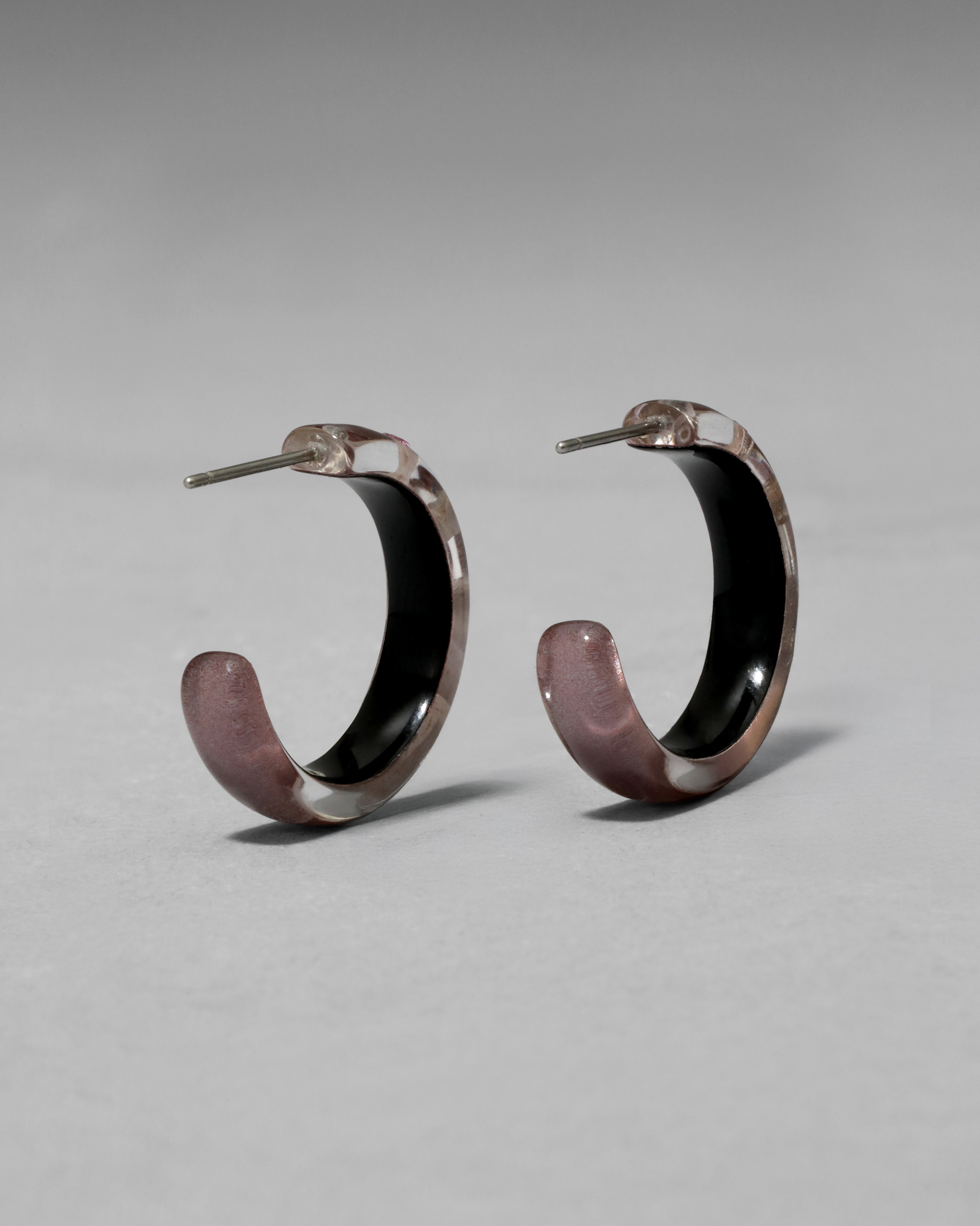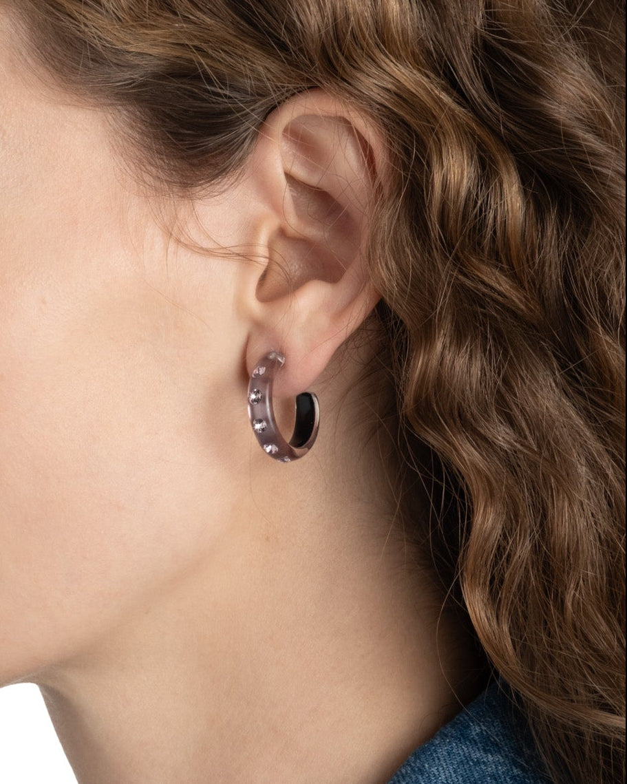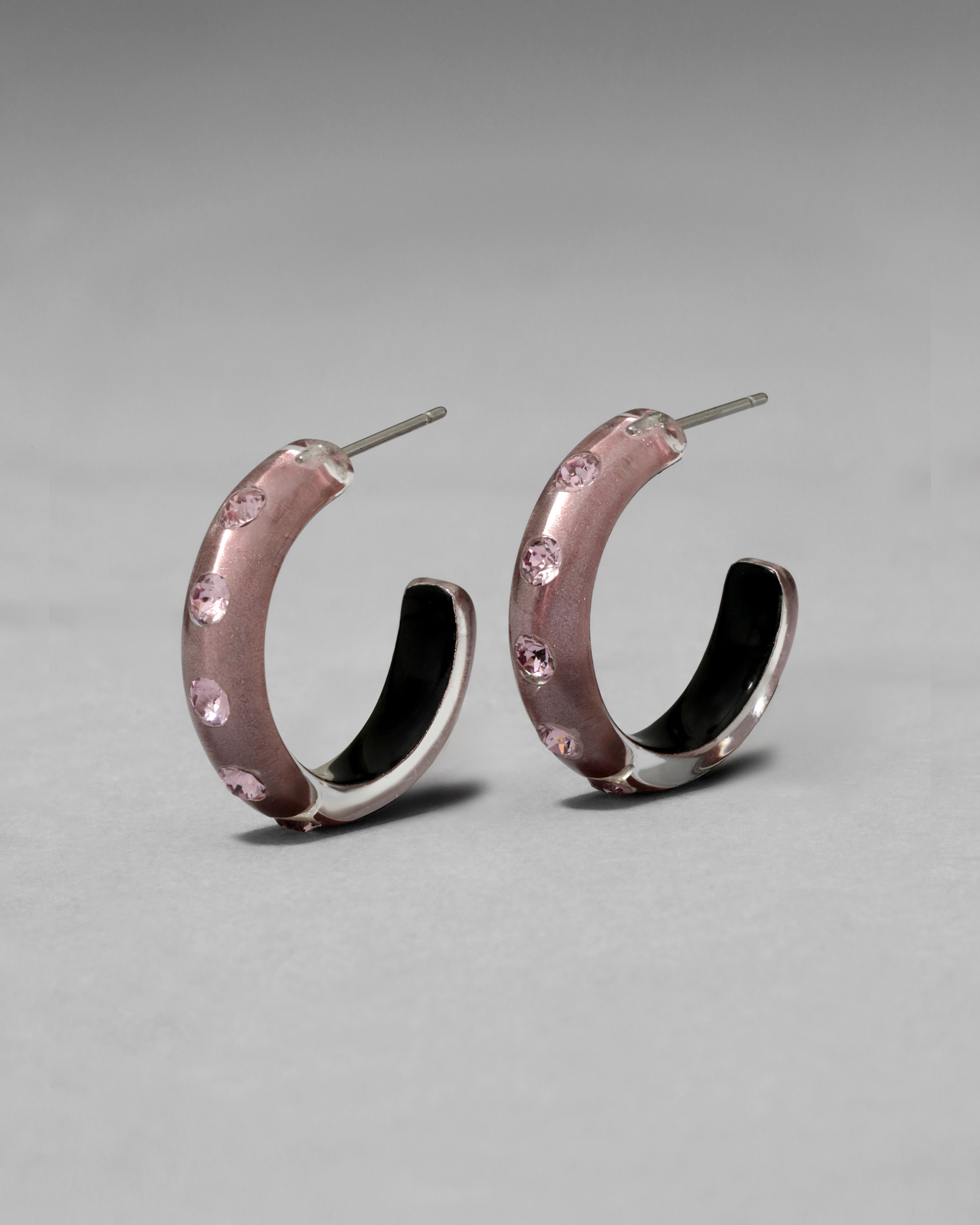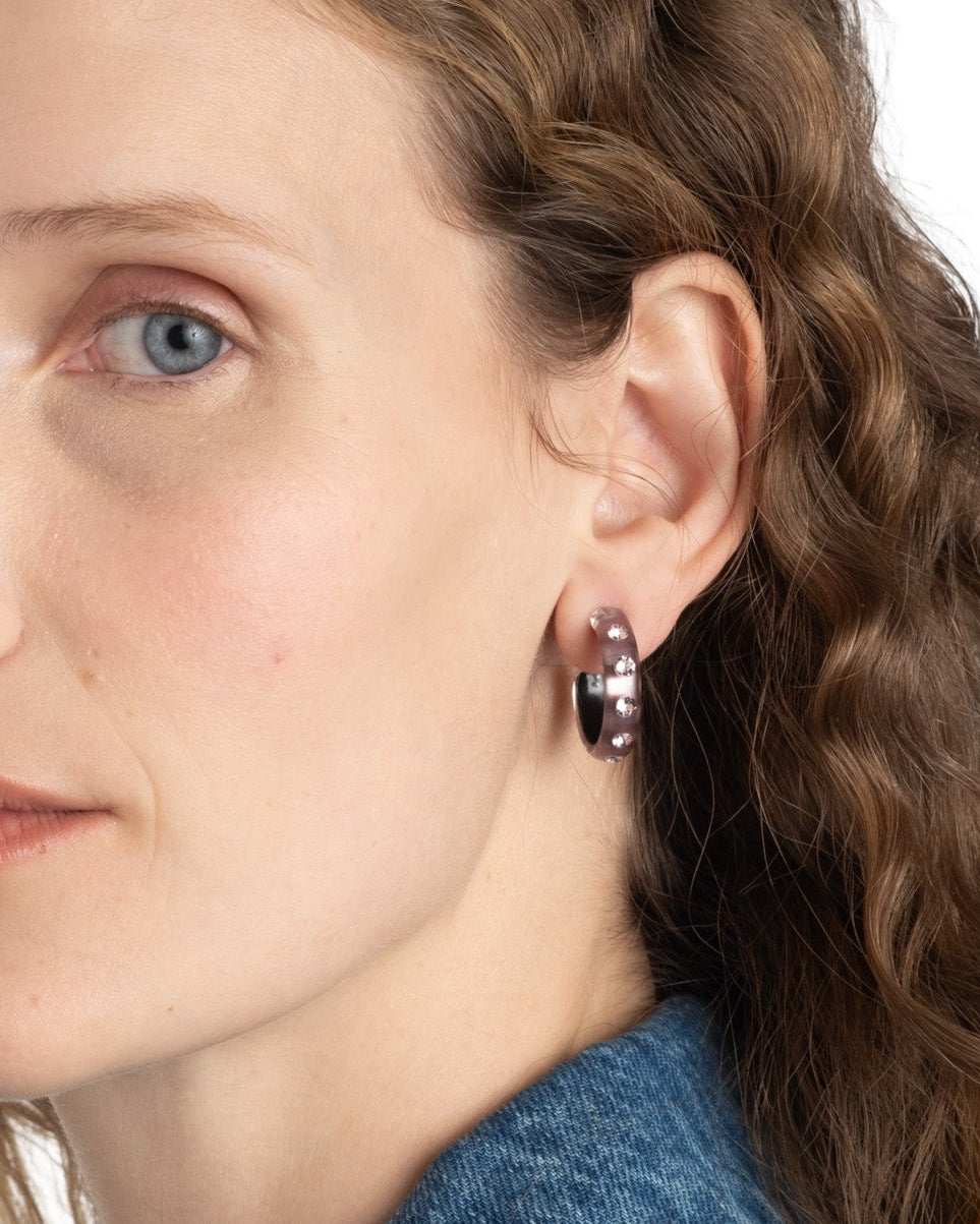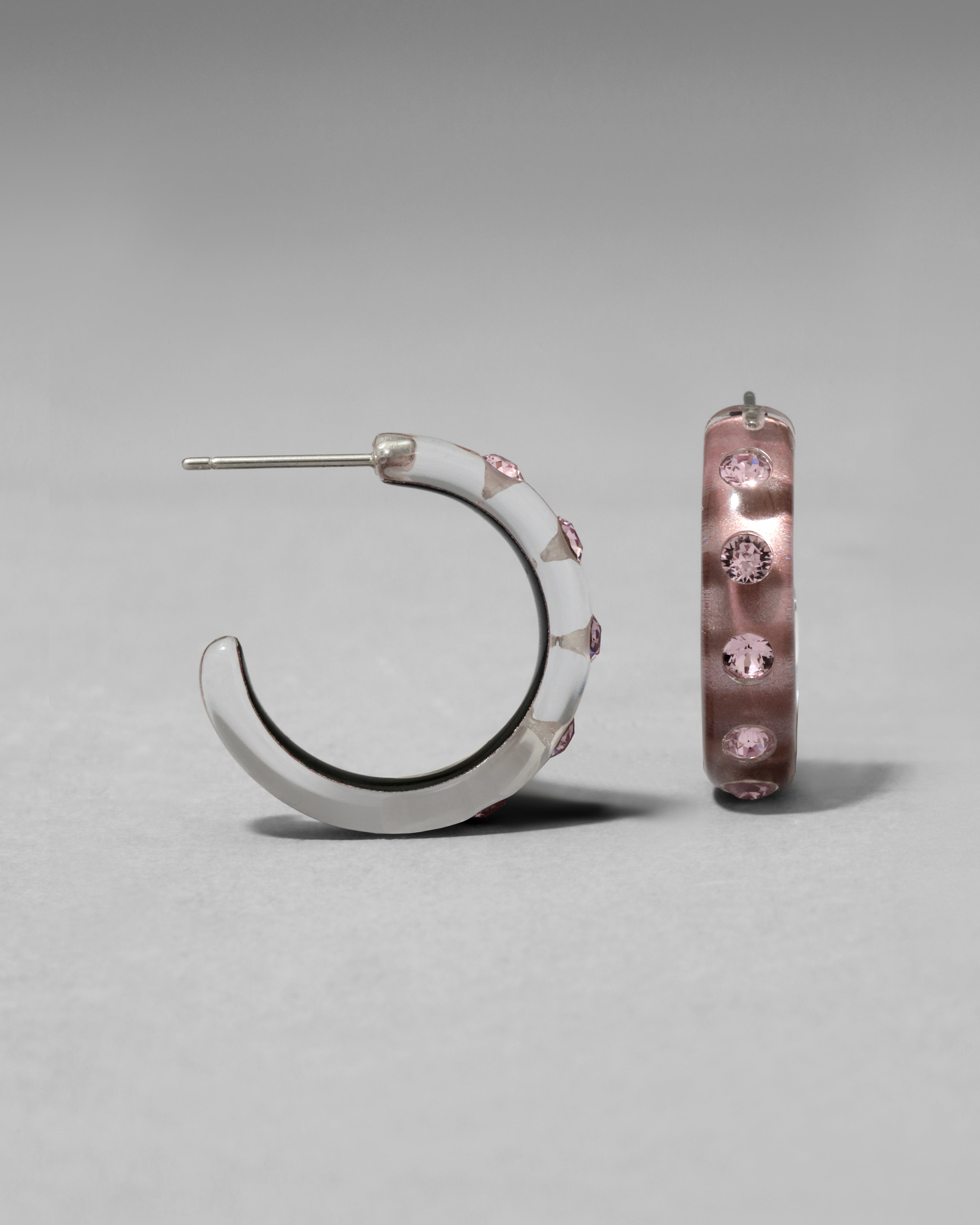 A modern twist to a timeless silhouette. These hand-sculpted luminous Lucite hoop earrings are hand-painted in a dusty rose hue, then studded with glistening tonal crystals.