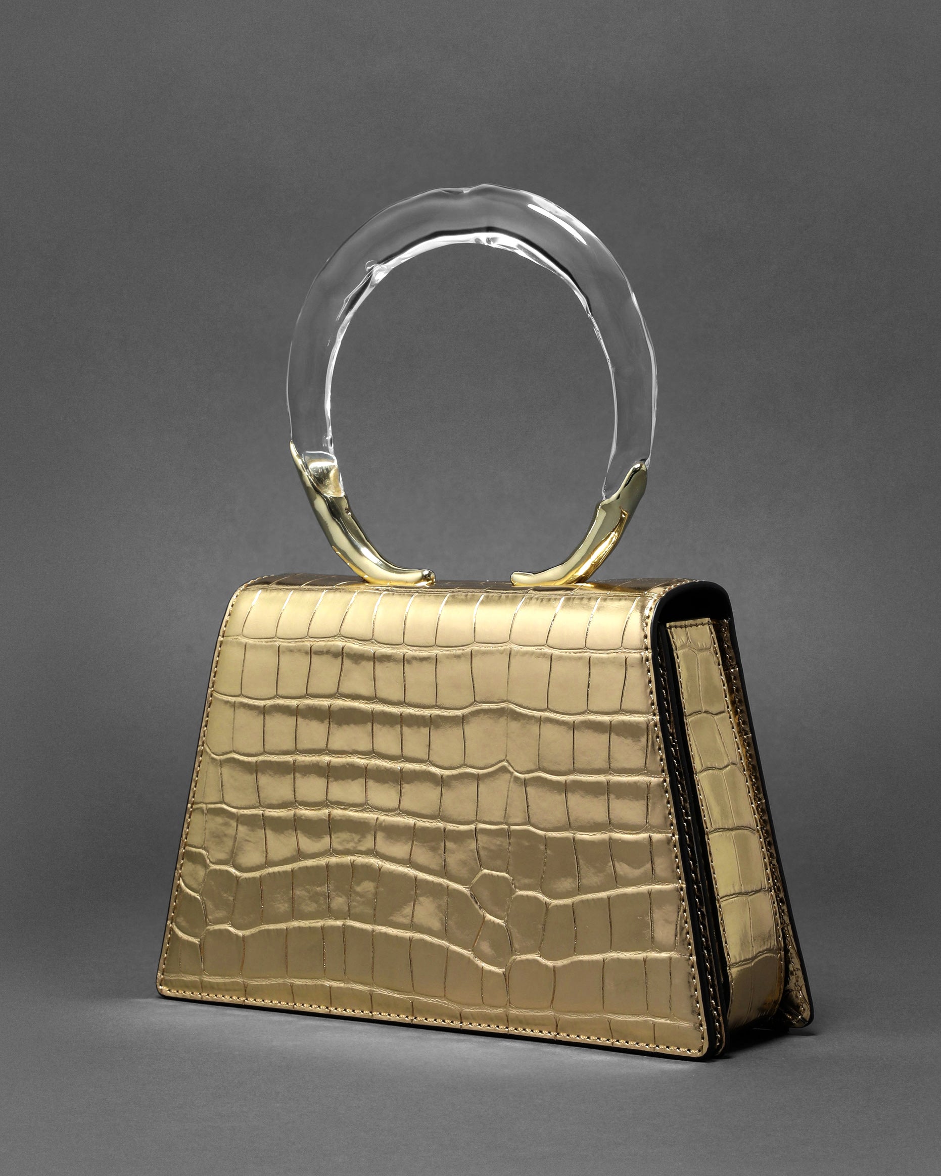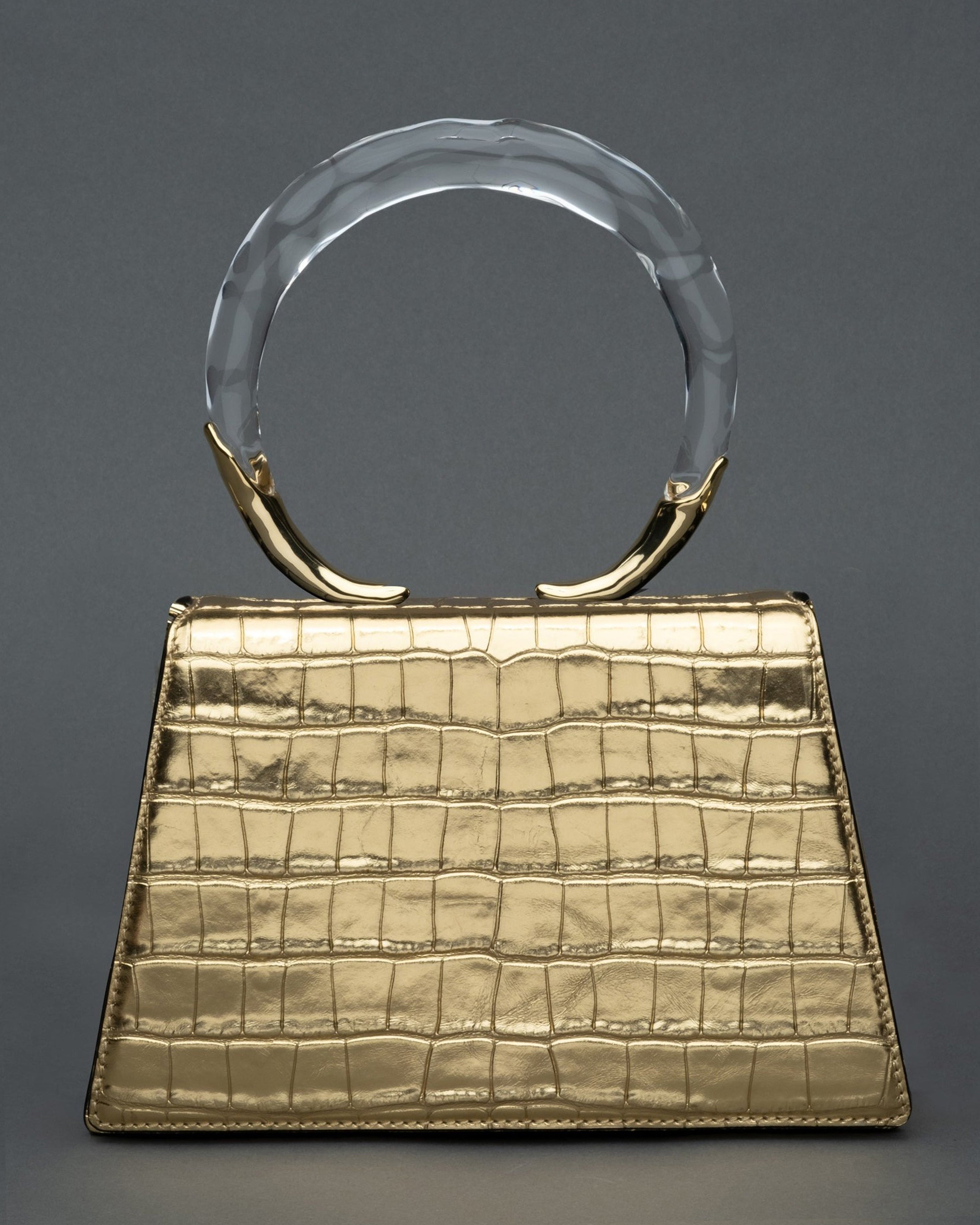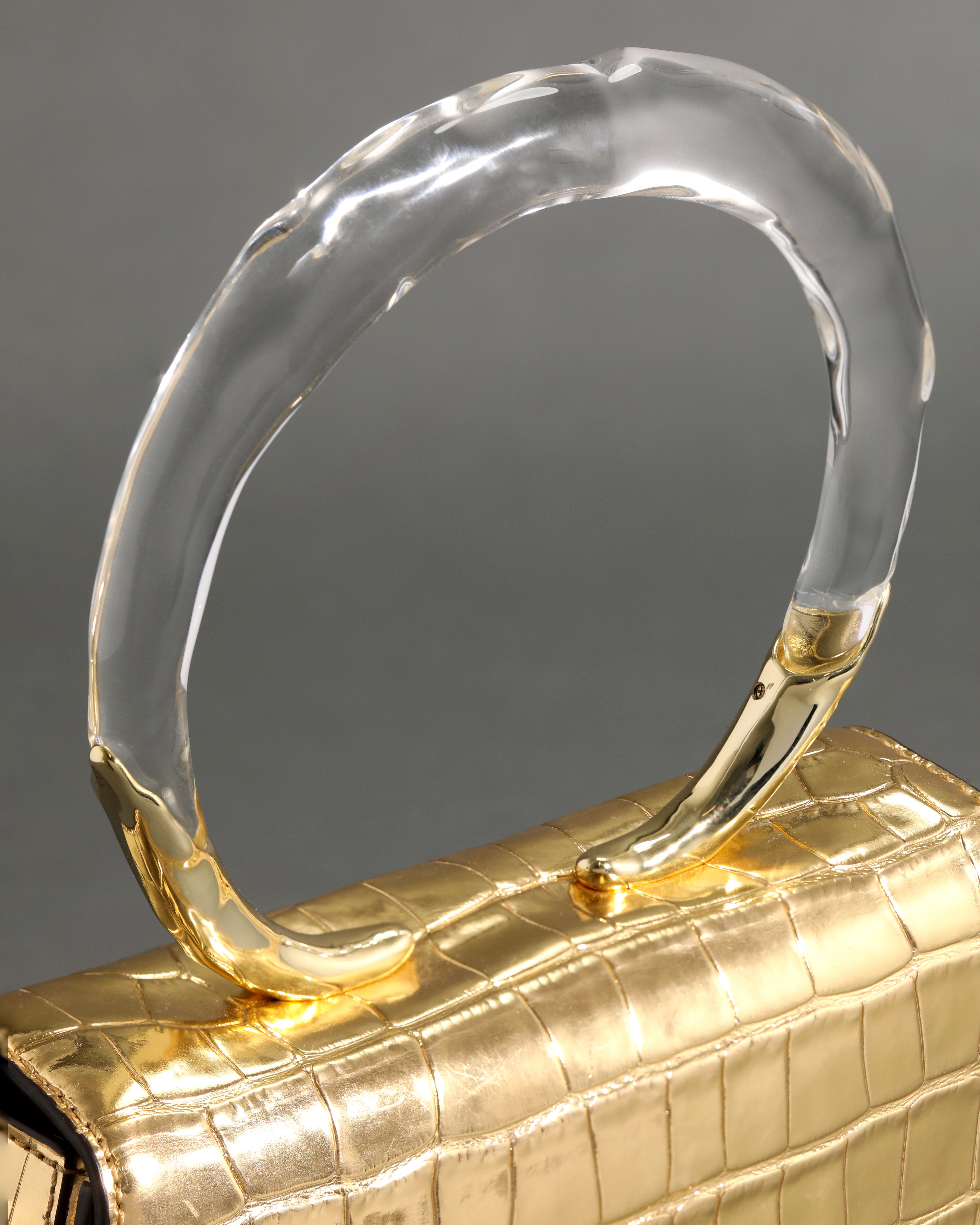 How can this gold crocodile leather purse with a lucite handle be styled?