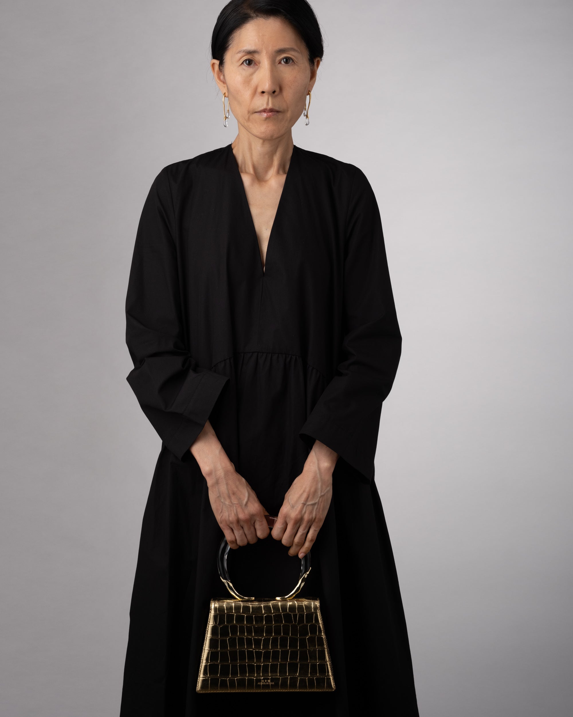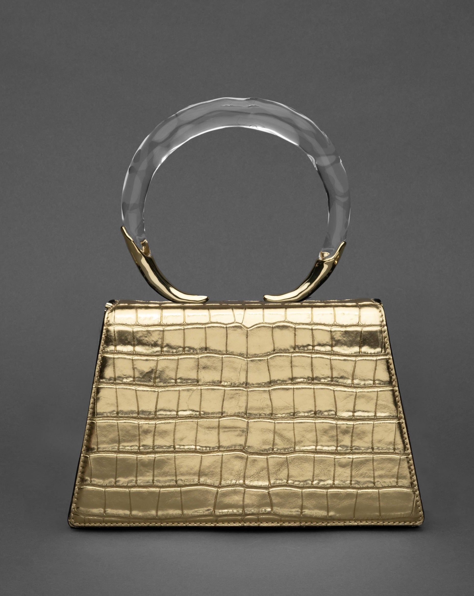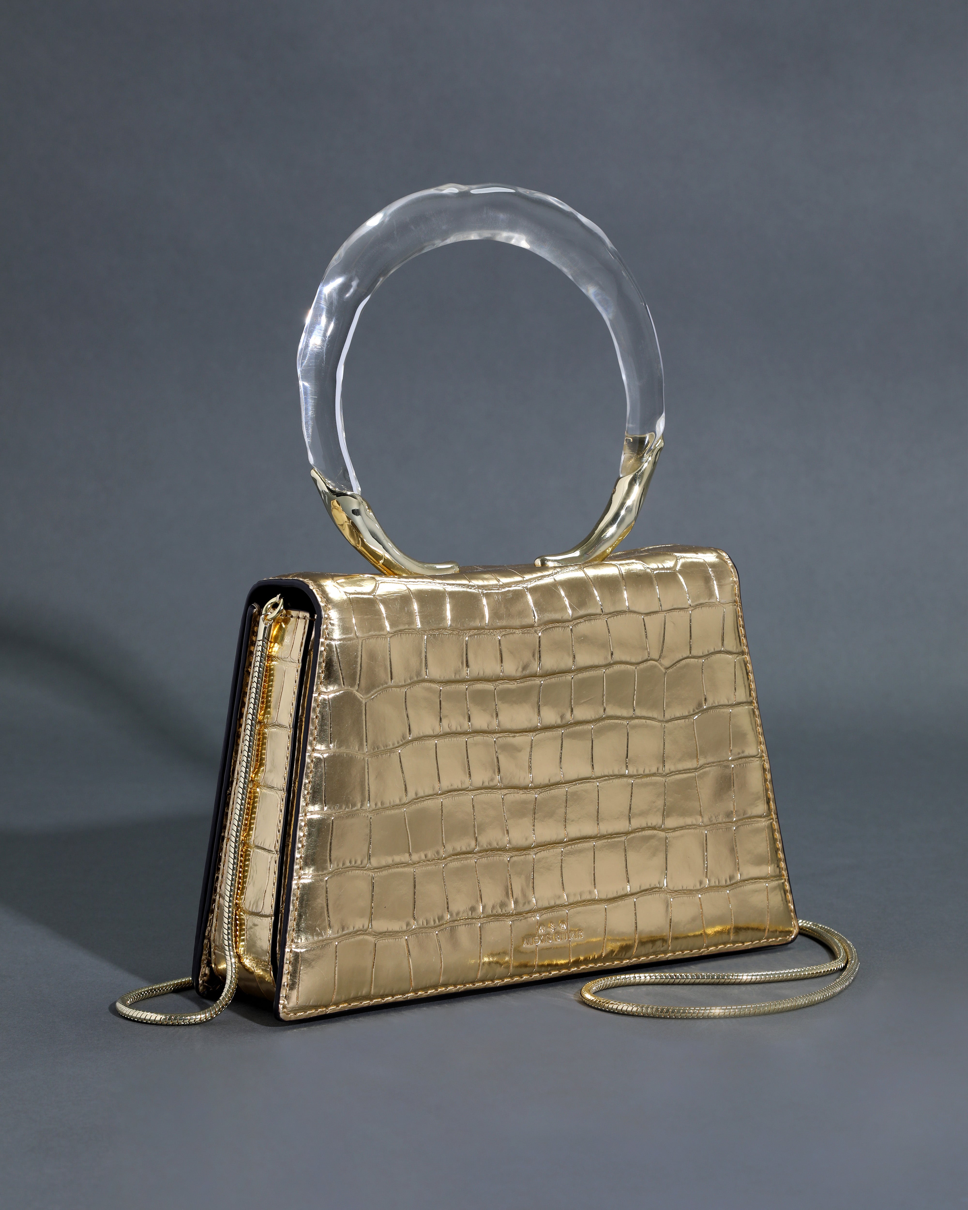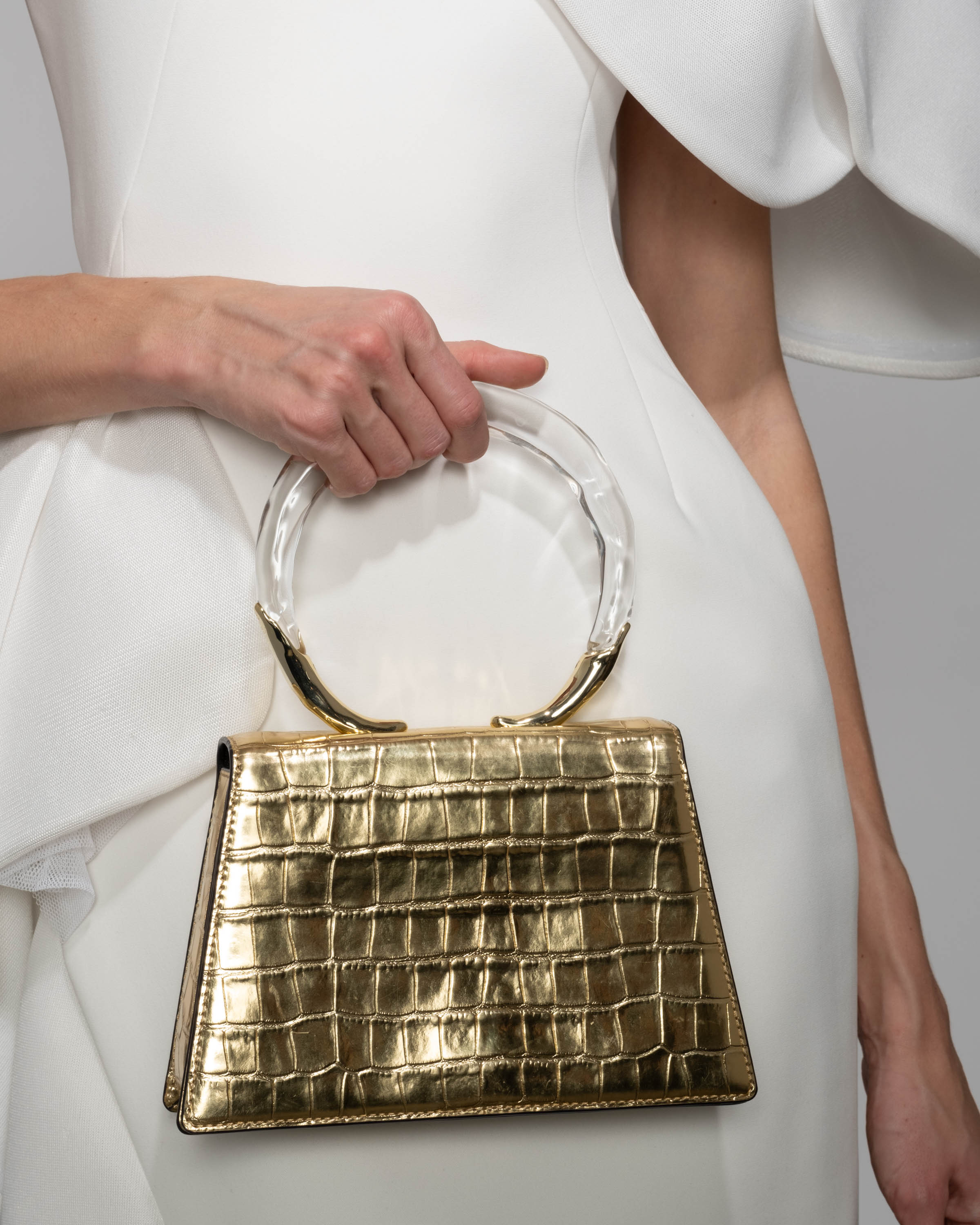 How can this gold crocodile leather purse with a lucite handle be styled?