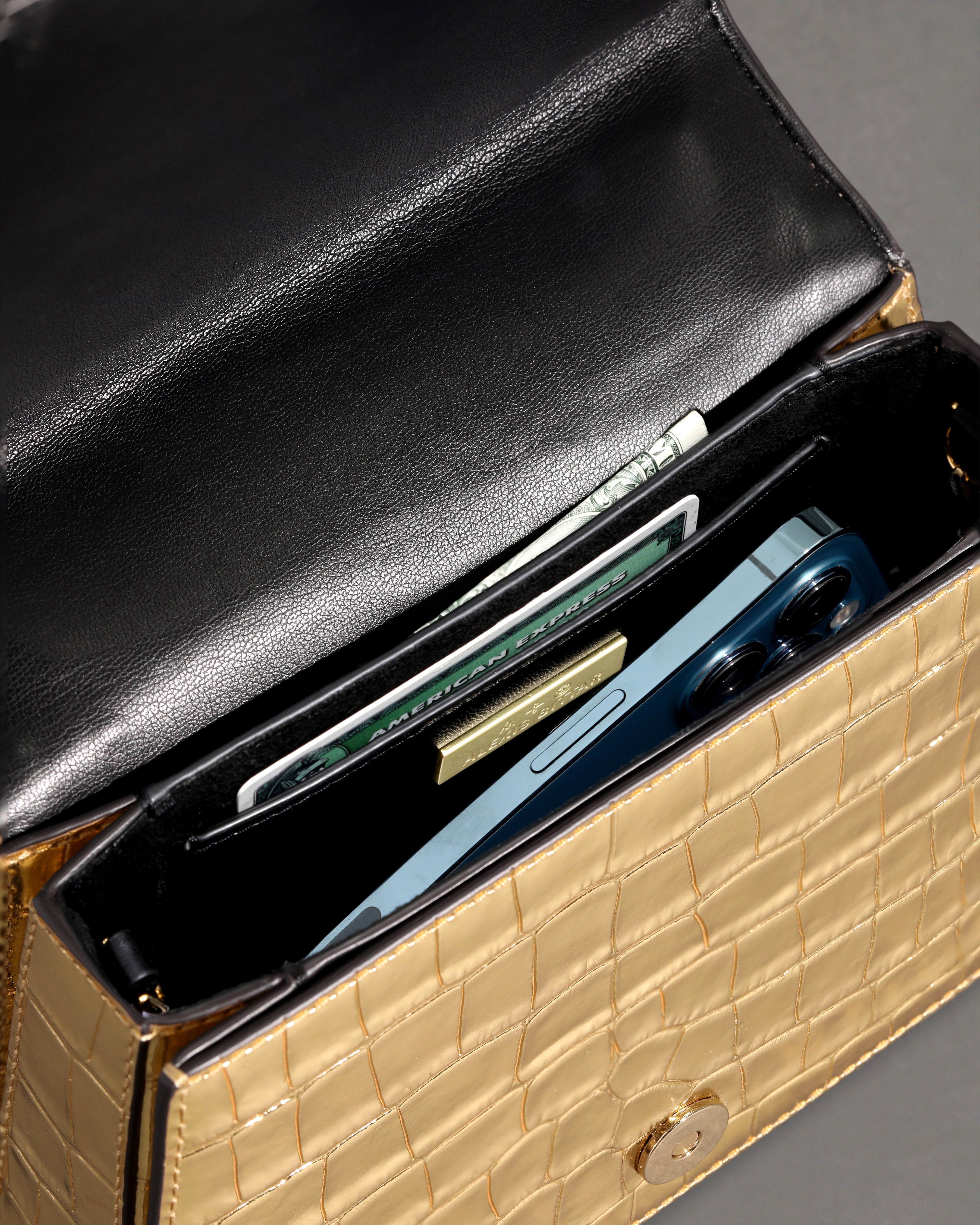 What can I fit in this gold crocodile leather purse with a lucite handle?