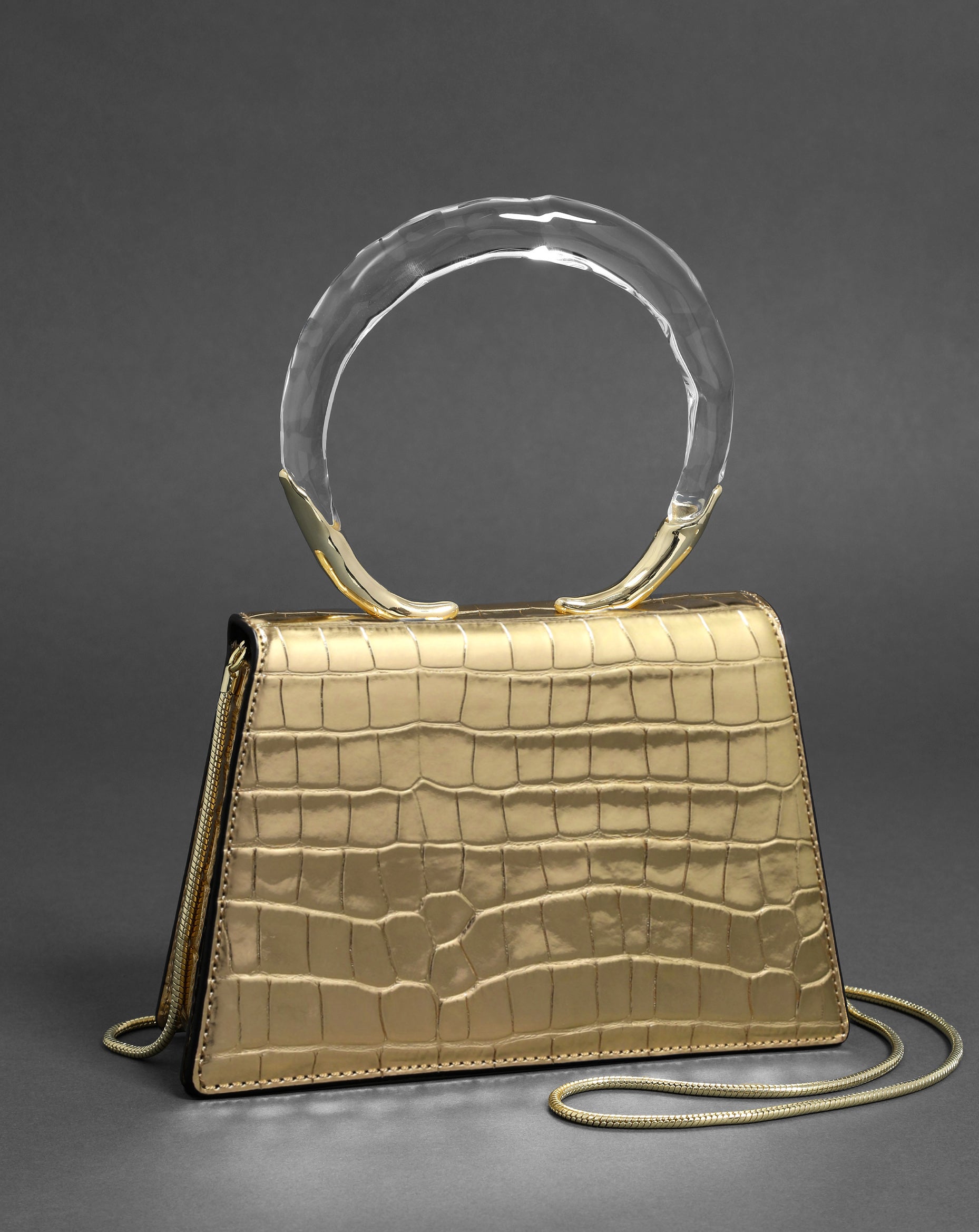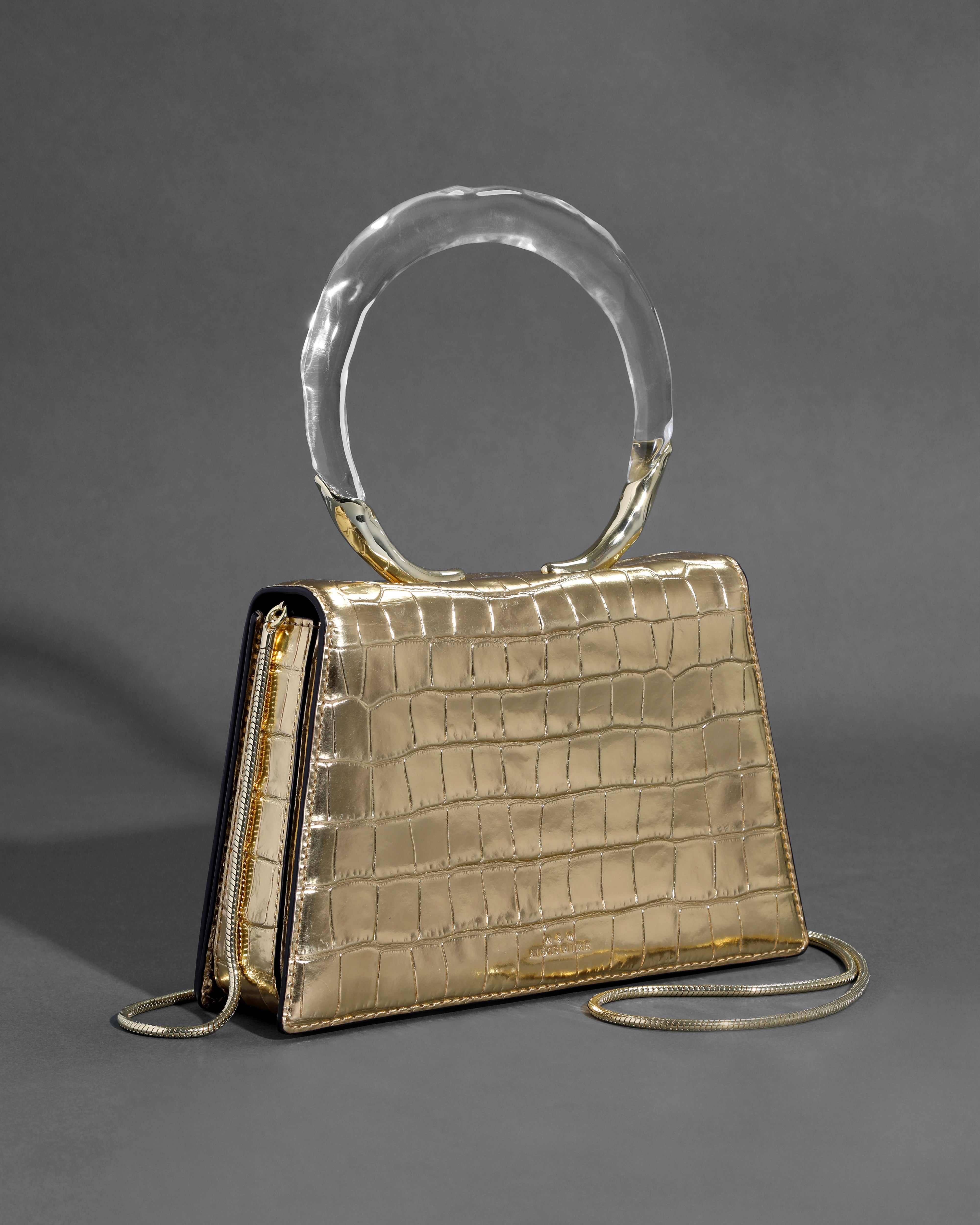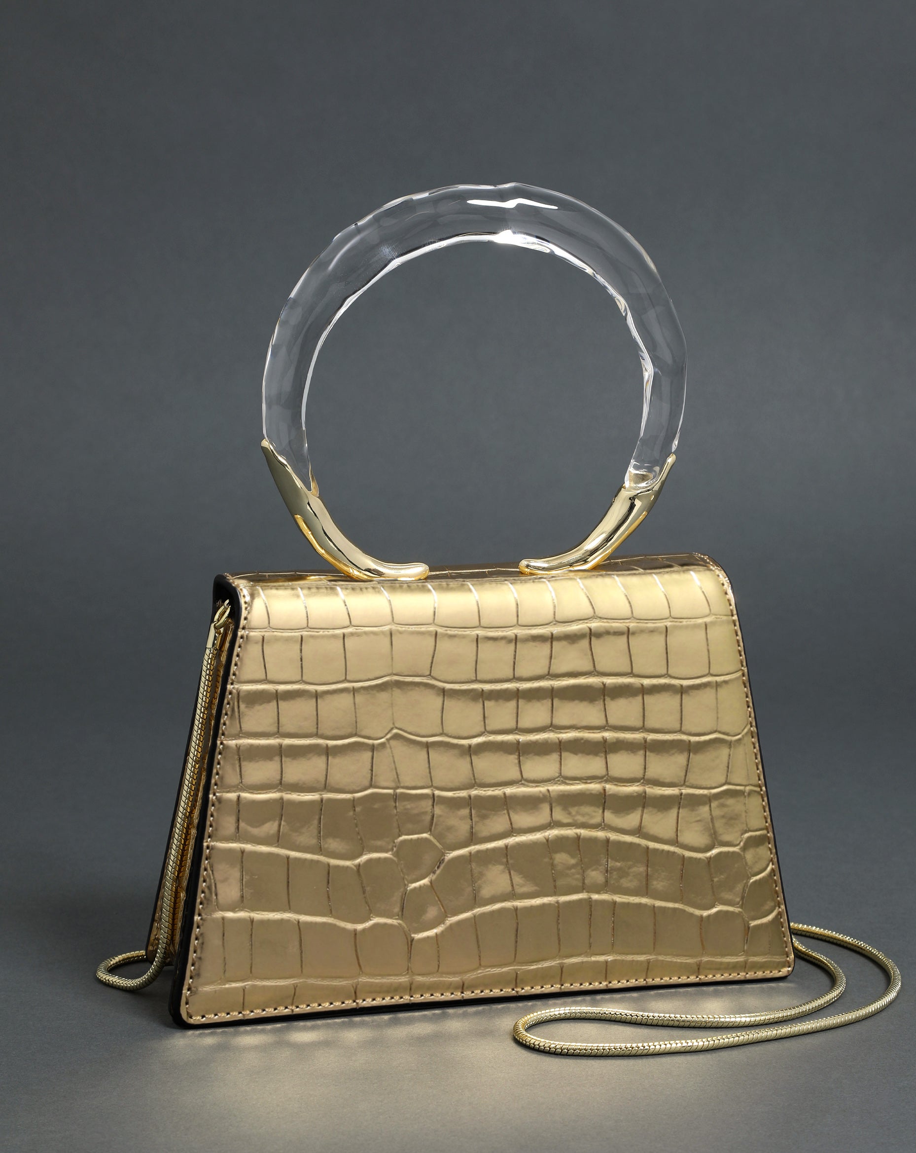 You can fit all of the essentials in this gold leather purse with a lucite handle. Carry your phone, wallet, lipstick for when you need to reapply, and a set of keys with room to spare.