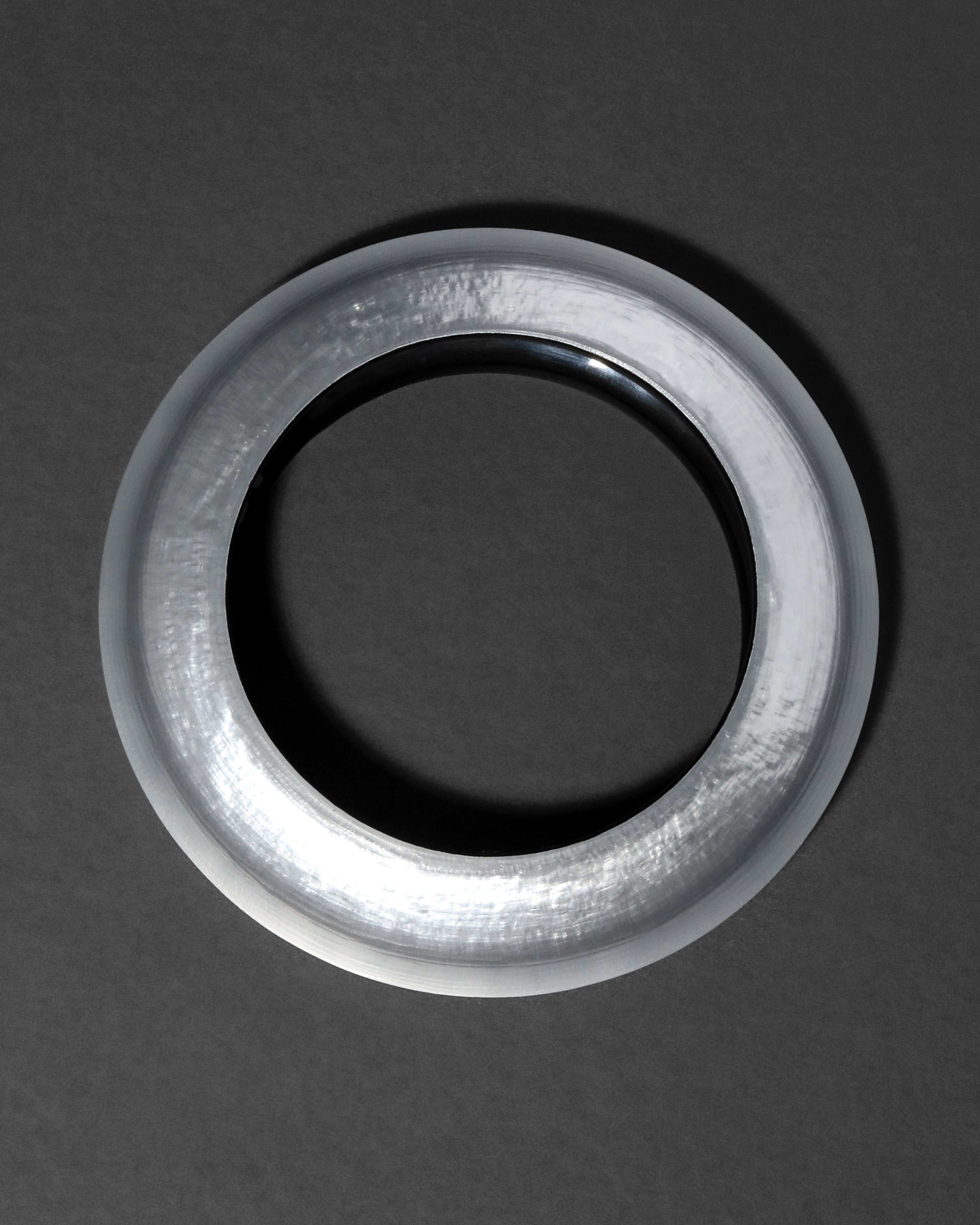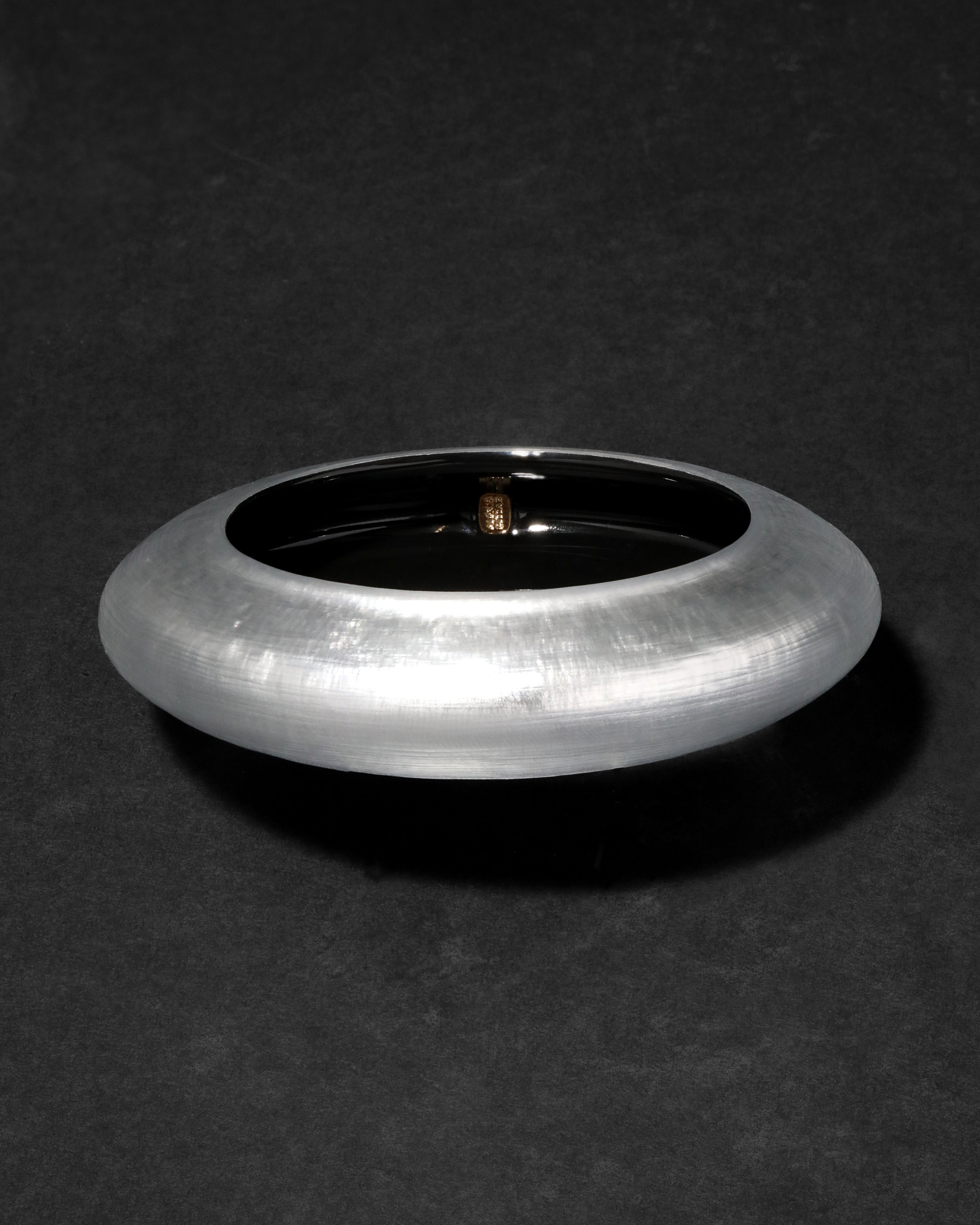 Hand-sculpted from a single block of Lucite, the Saucer bangle has a luminous hand-painted oblong silhouette that is both lightweight and wearable. Add an extraterrestrial glow to any bangle stack or wear alone for a more minimalist look.