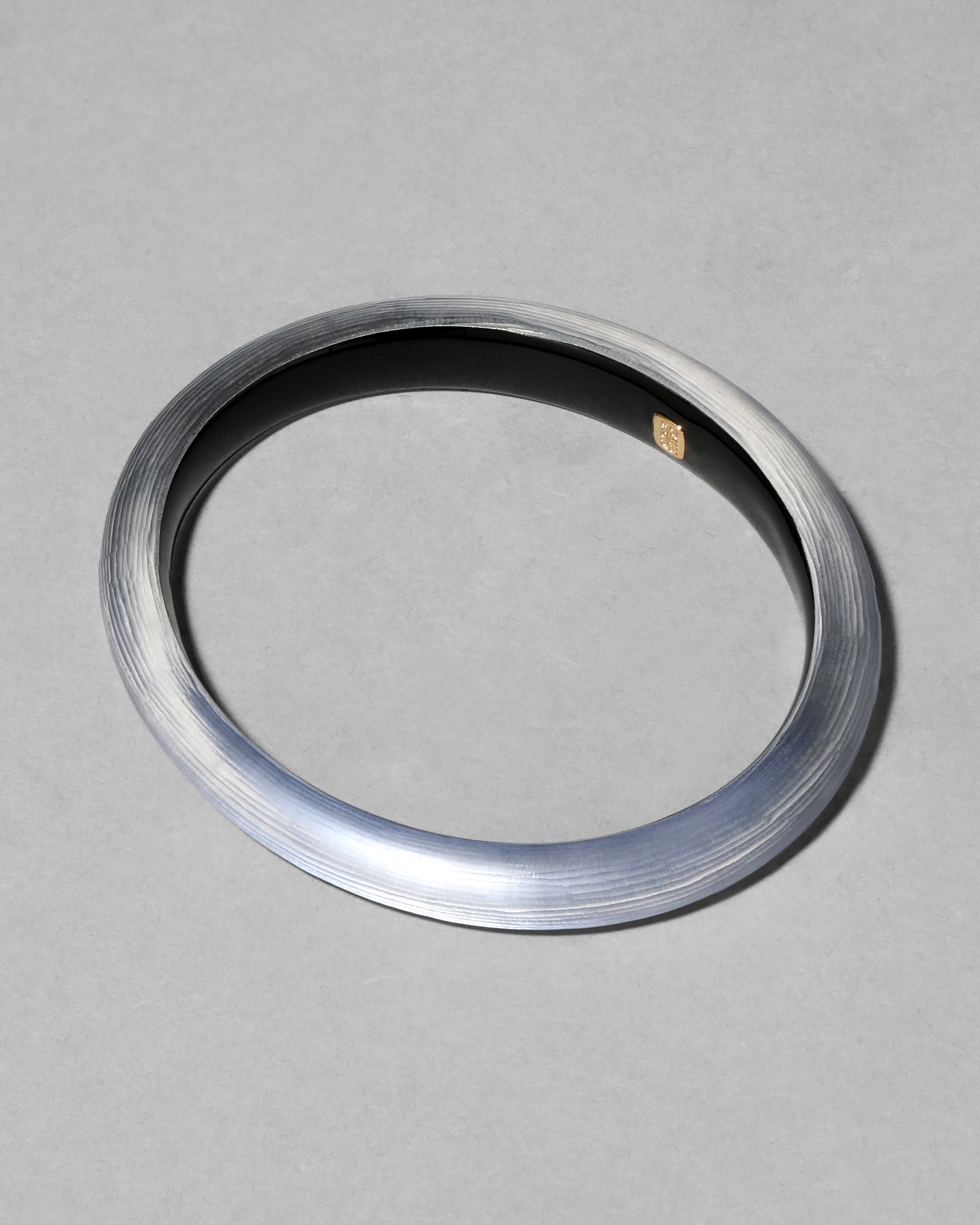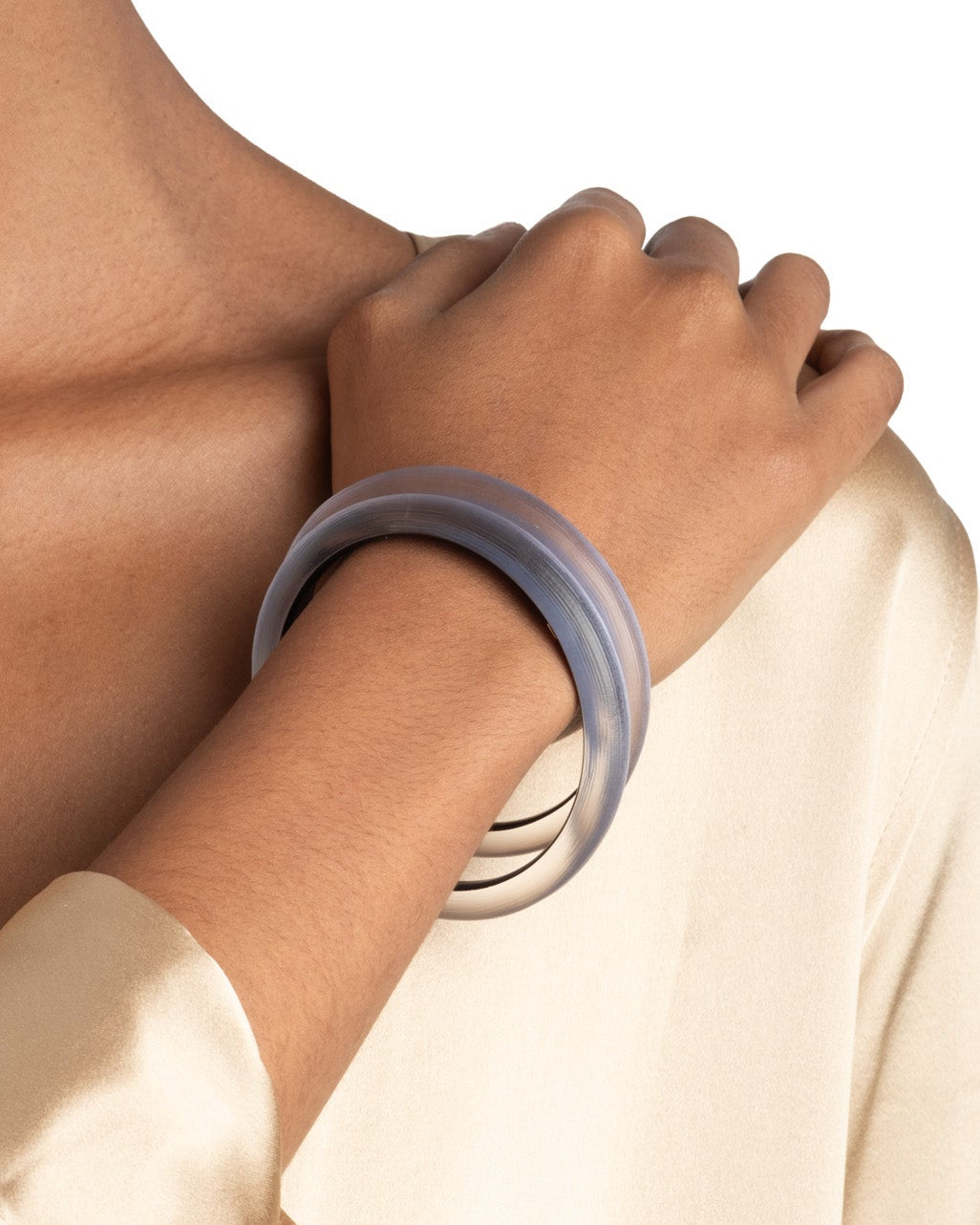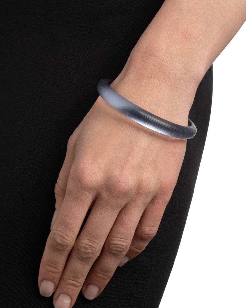 With a domed hand-carved oval silhouette that reflects light from its translucent curves, the luminous Lucite skinny bangle will add a pop of color to any bracelet stack or worn alone. Hand-painted in a versatile reflective steel blue hue.