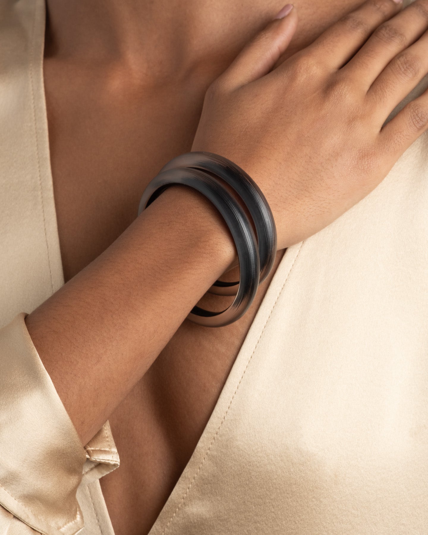 With a domed hand-carved oval silhouette that reflects light from its translucent curves, the luminous Lucite skinny bangle will add a pop of color to any bracelet stack or worn alone. Hand-painted in a classic matte black shade.