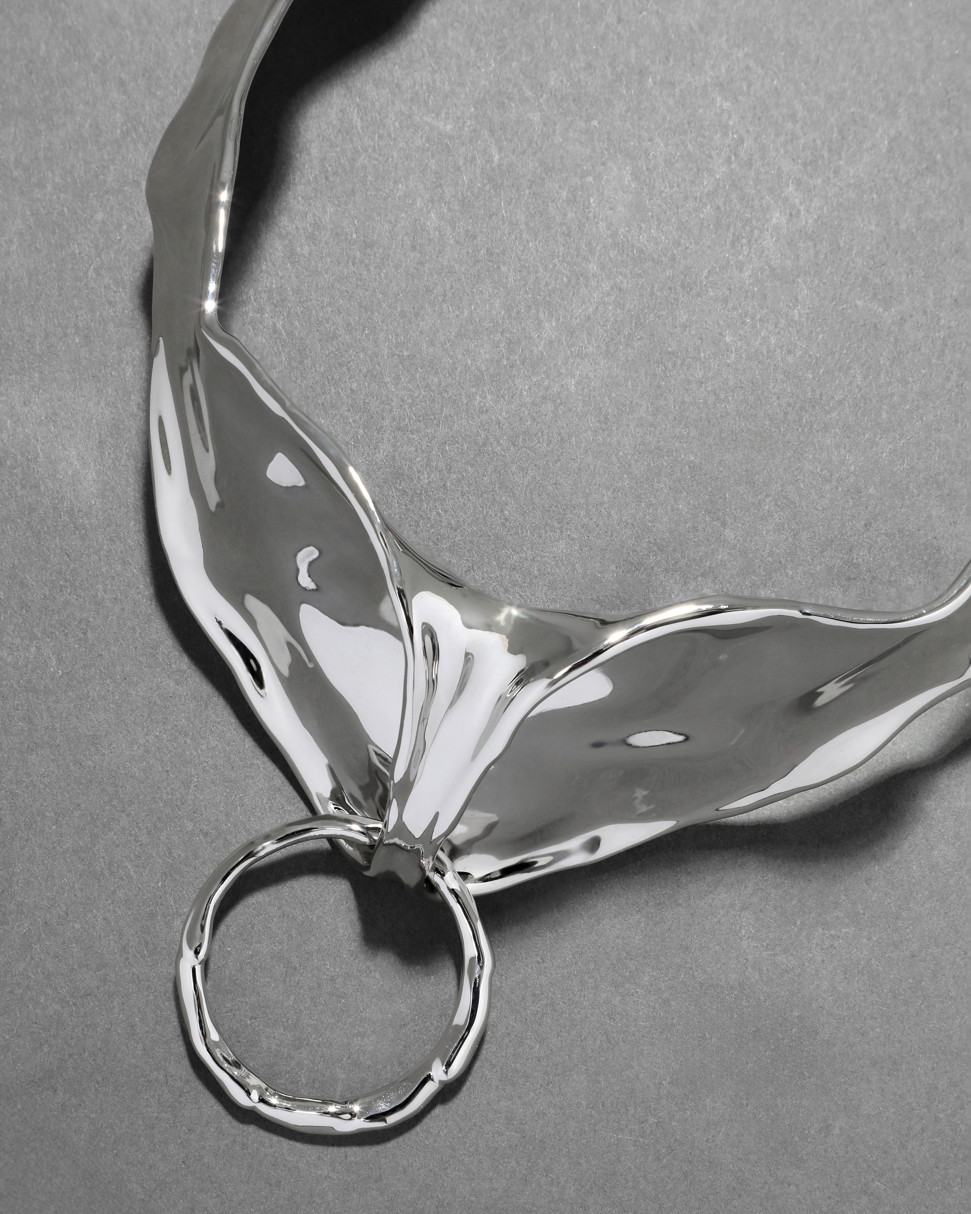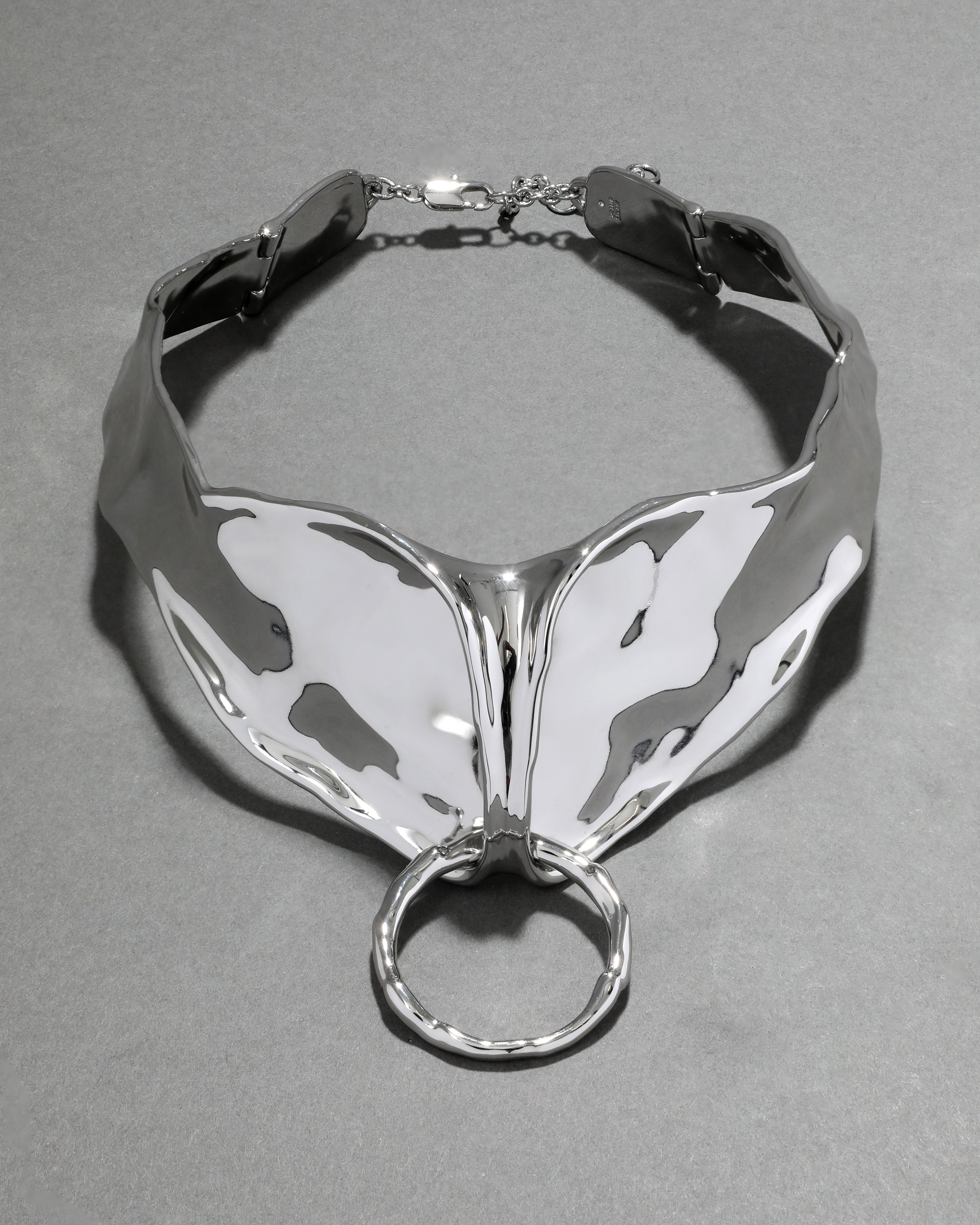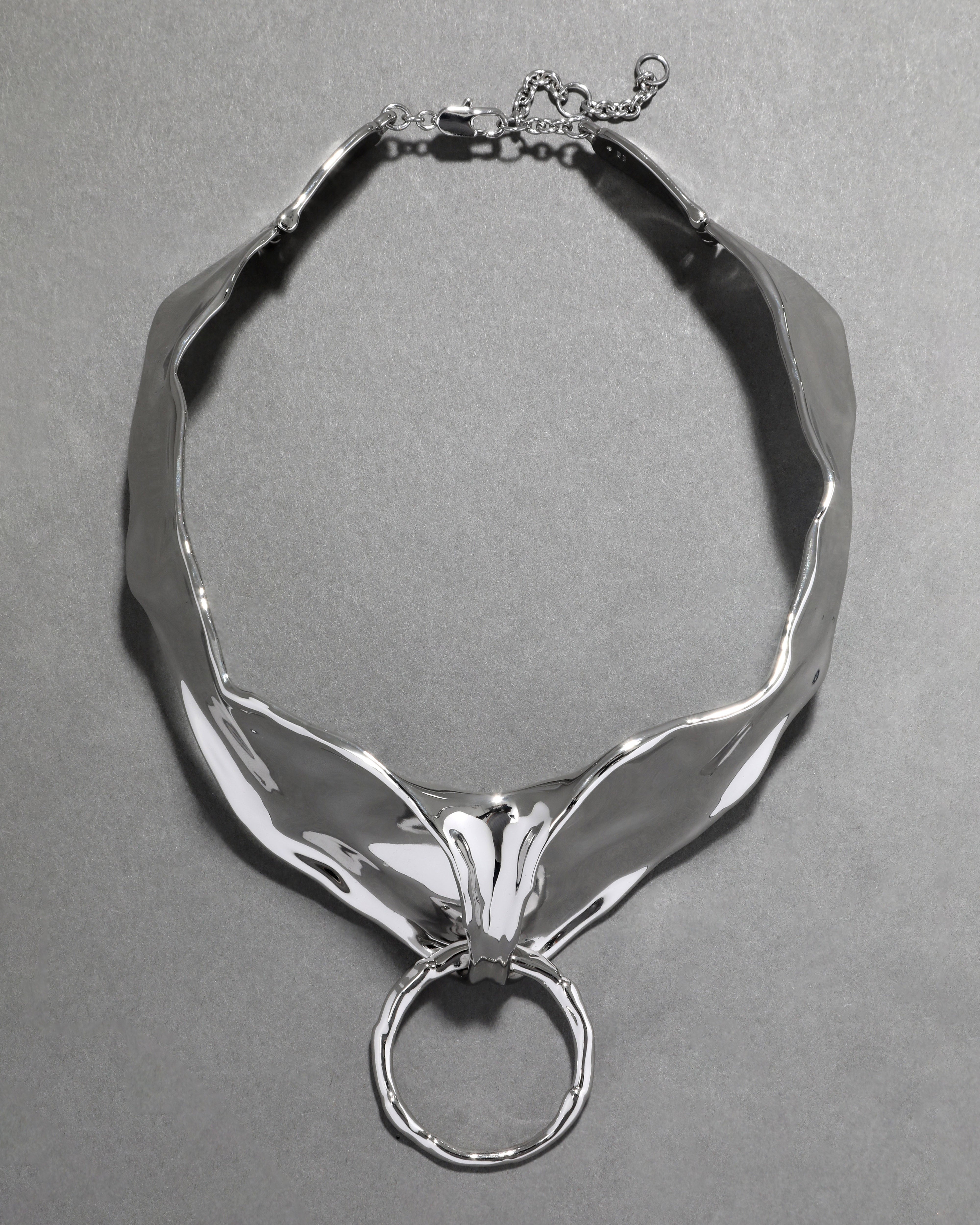 Melding sculptural liquid metalwork and 70's punk aesthetics. This high-shine gunmetal plated collar necklace suspends an oversized O-ring giving it an elevated bondage inspired silhouette. Hinged to wrap comfortably around the neck.