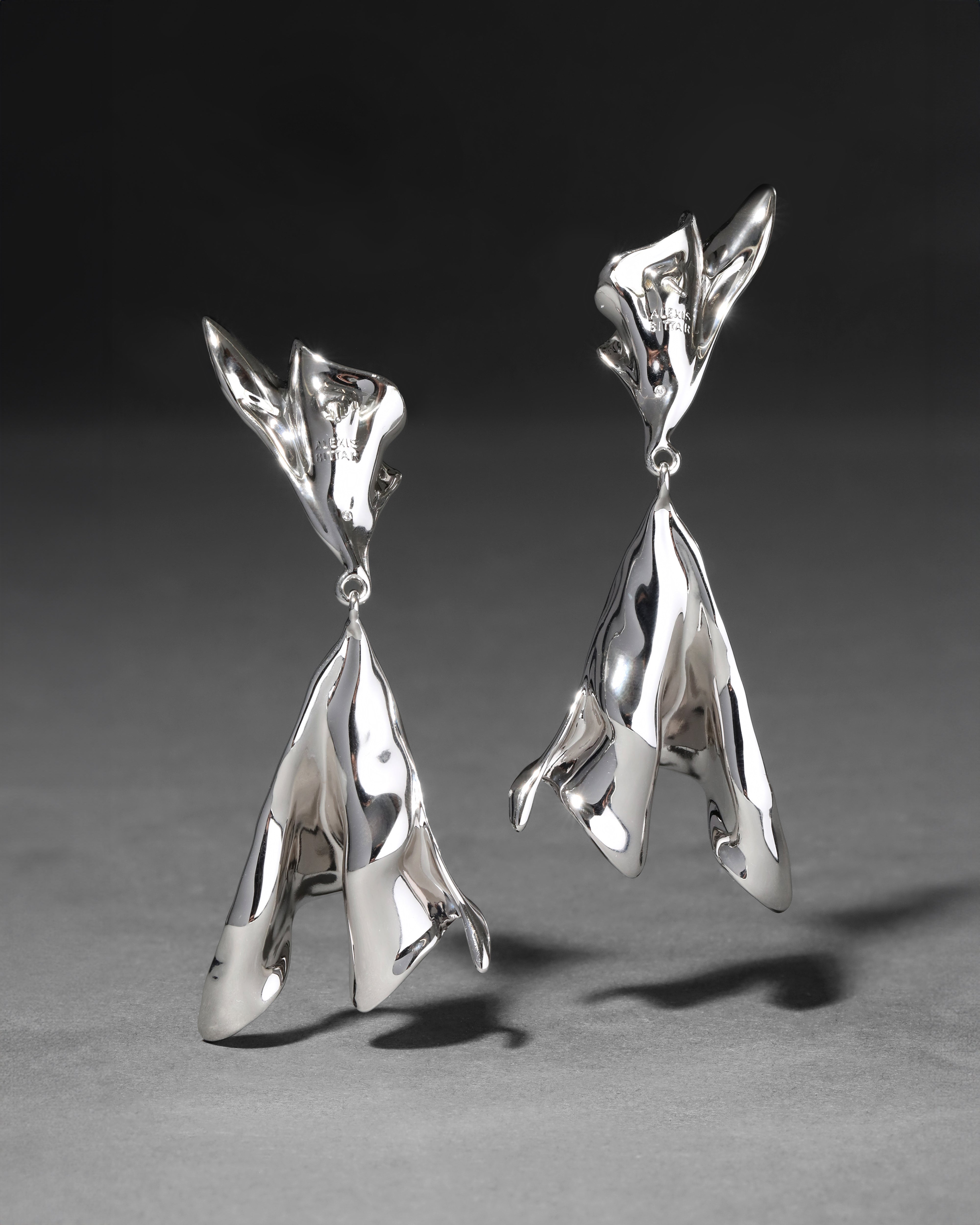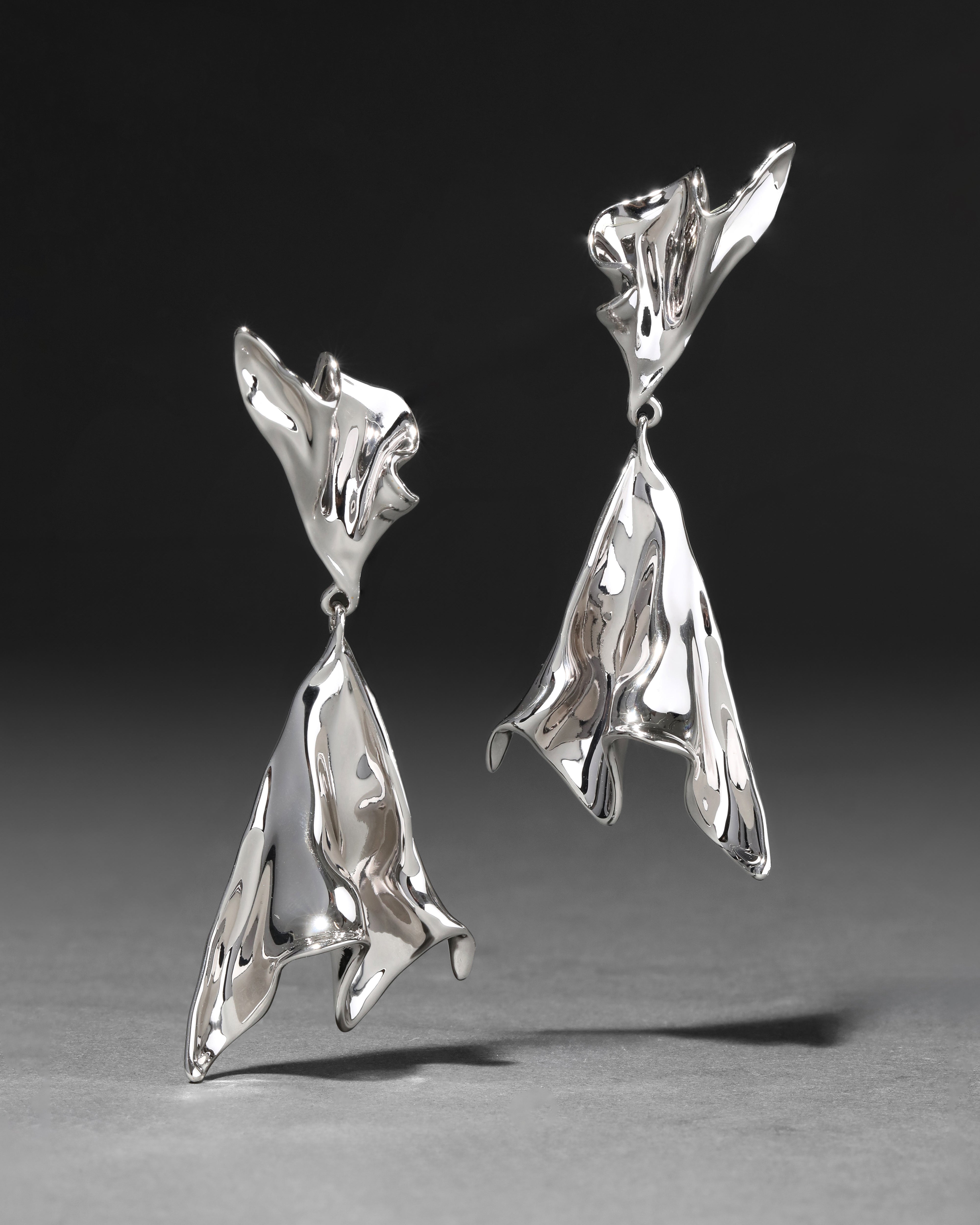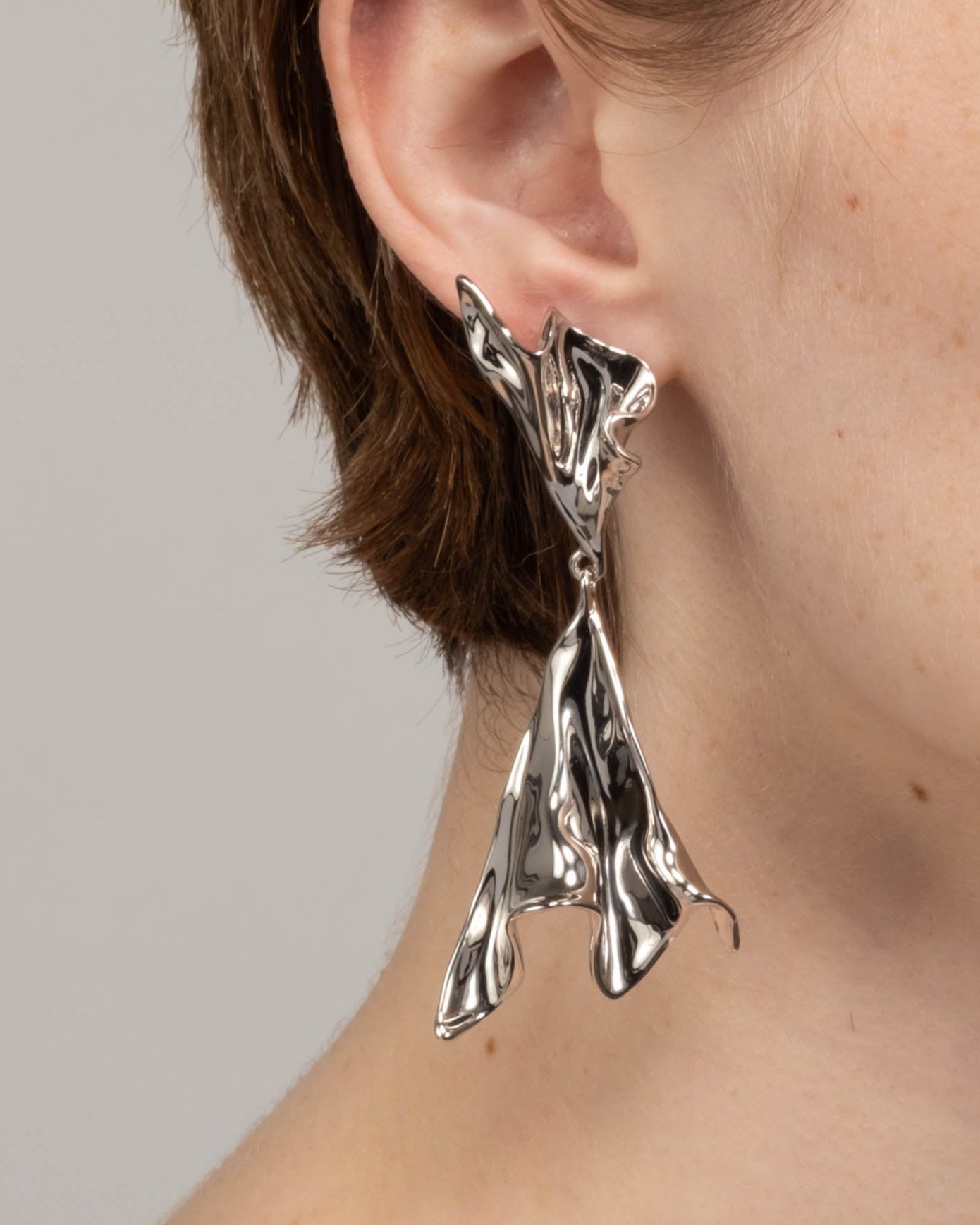 Sculptural silver tone plated drop earrings with a crumpled & flared high-shine silhouette, with fluid lines that reflects light from every angle. Sold as a pair.