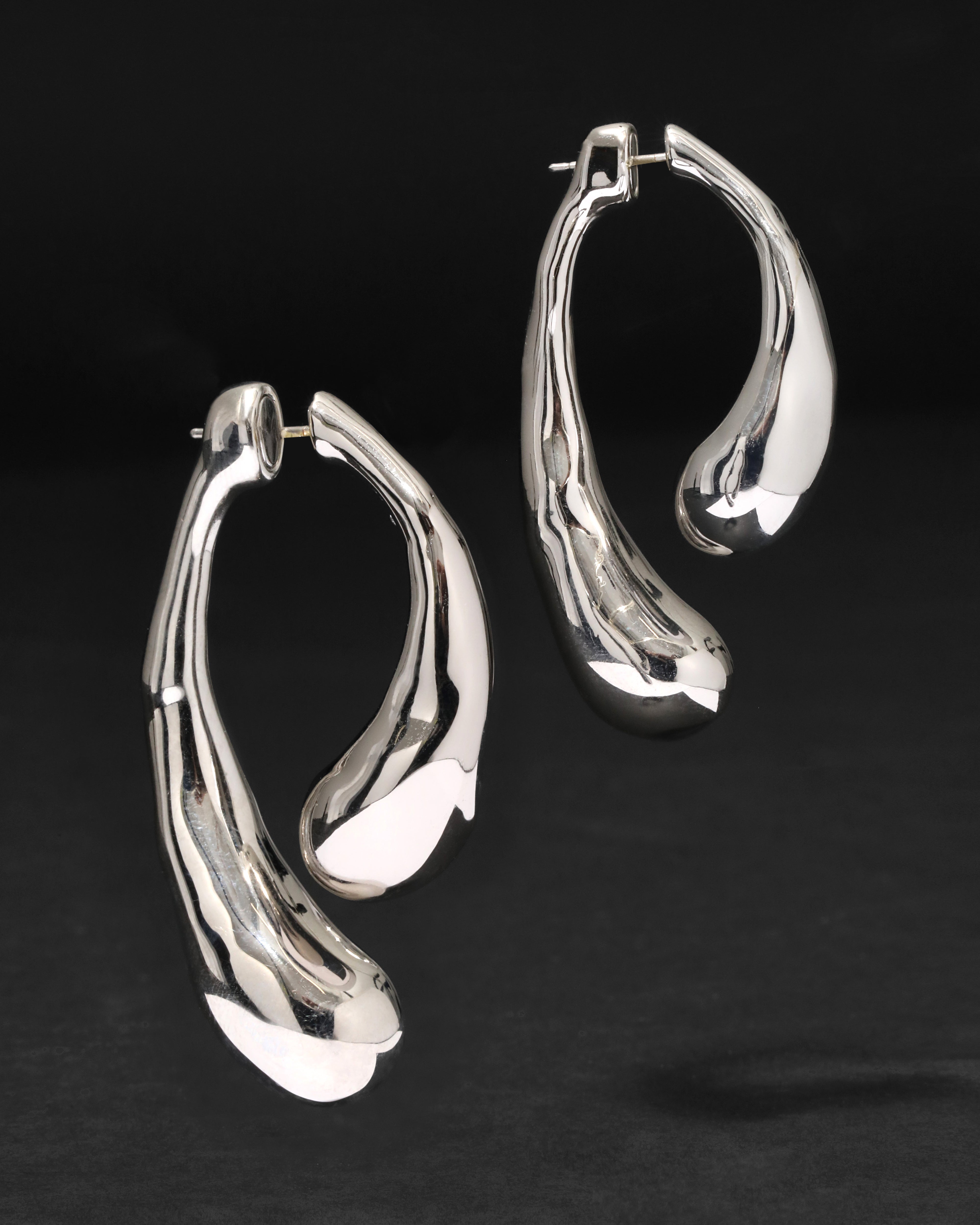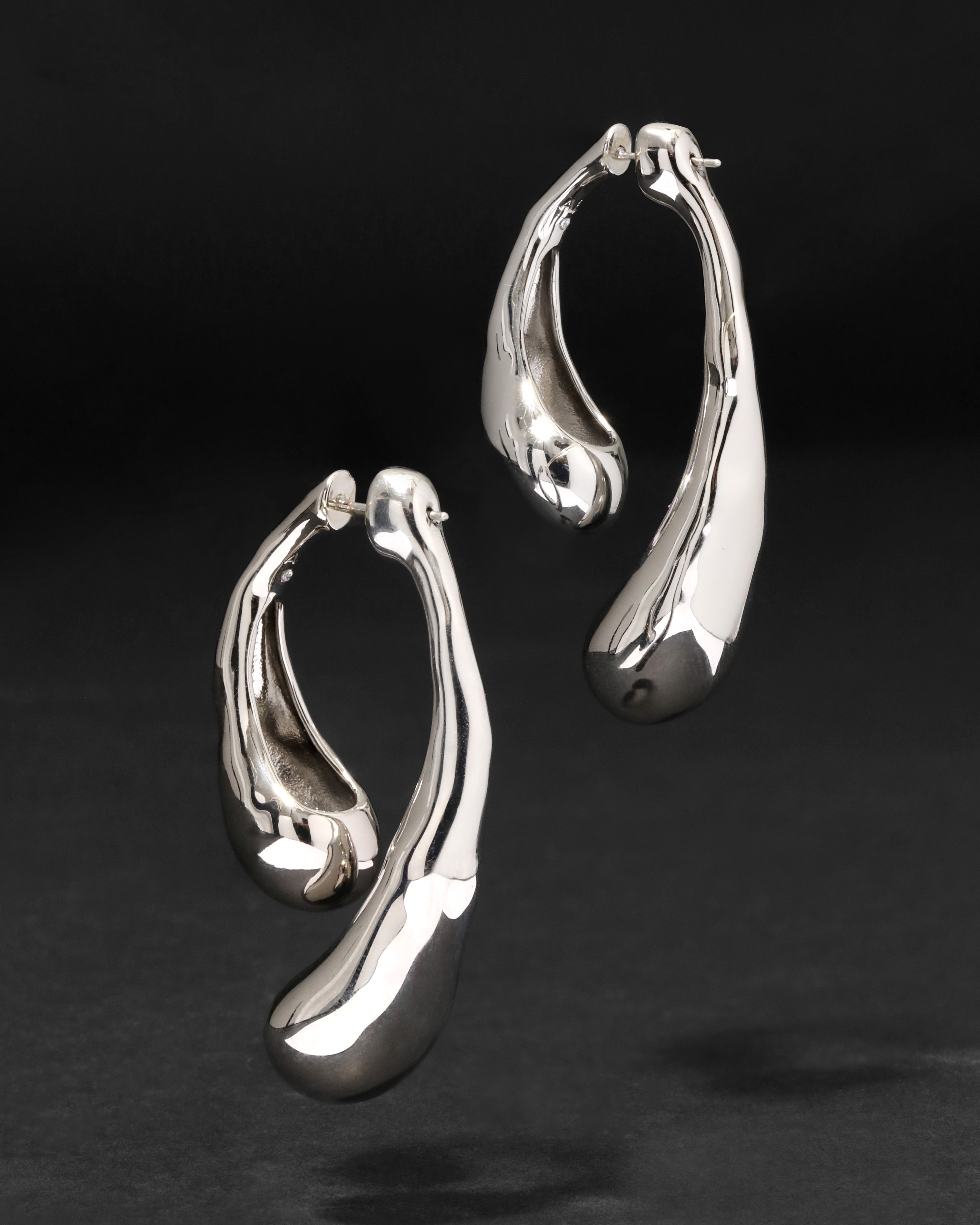 These sculptural front back post earrings feature a molten silver tone plated scoop silhouette on each side, for a strikingly modern silhouette.