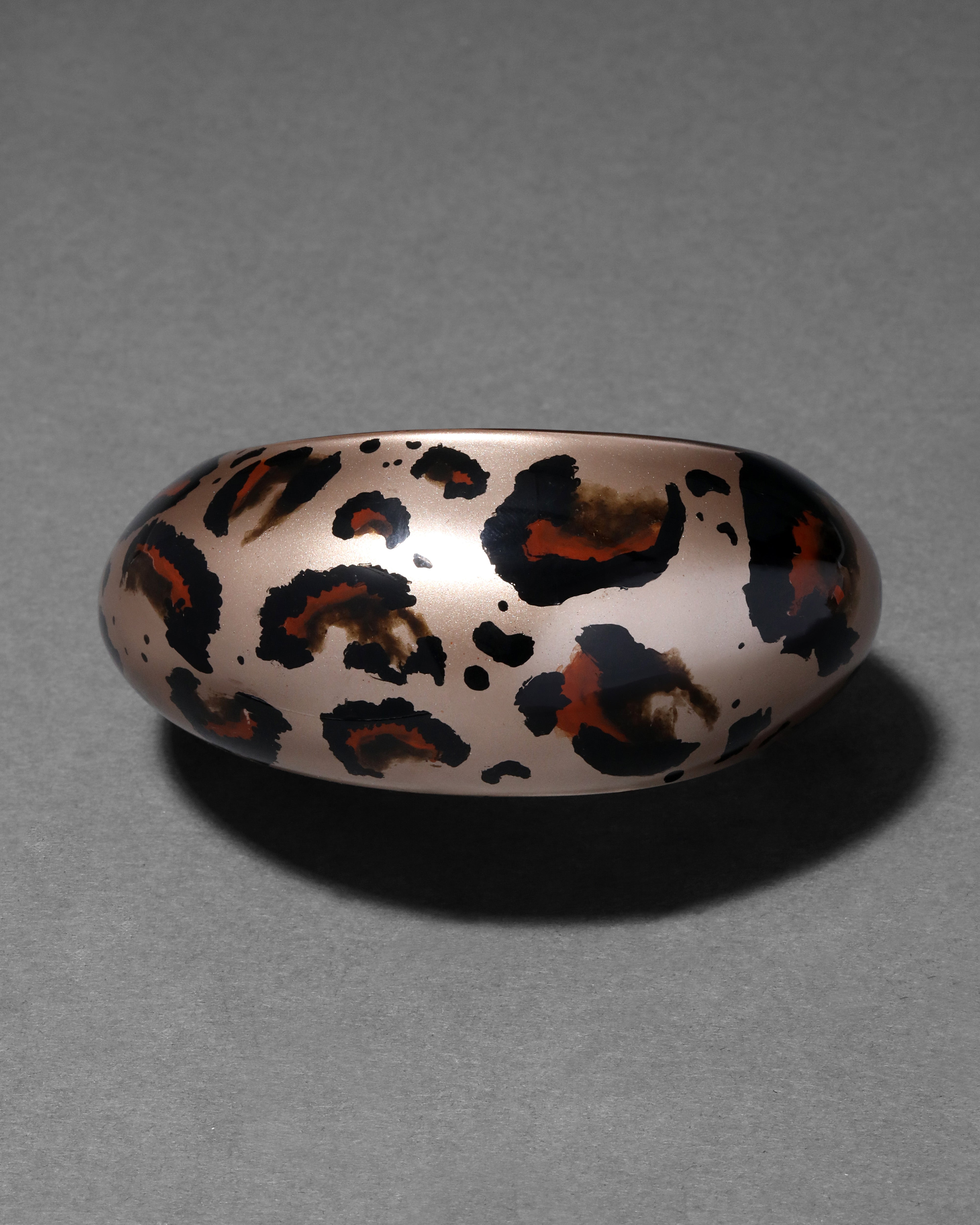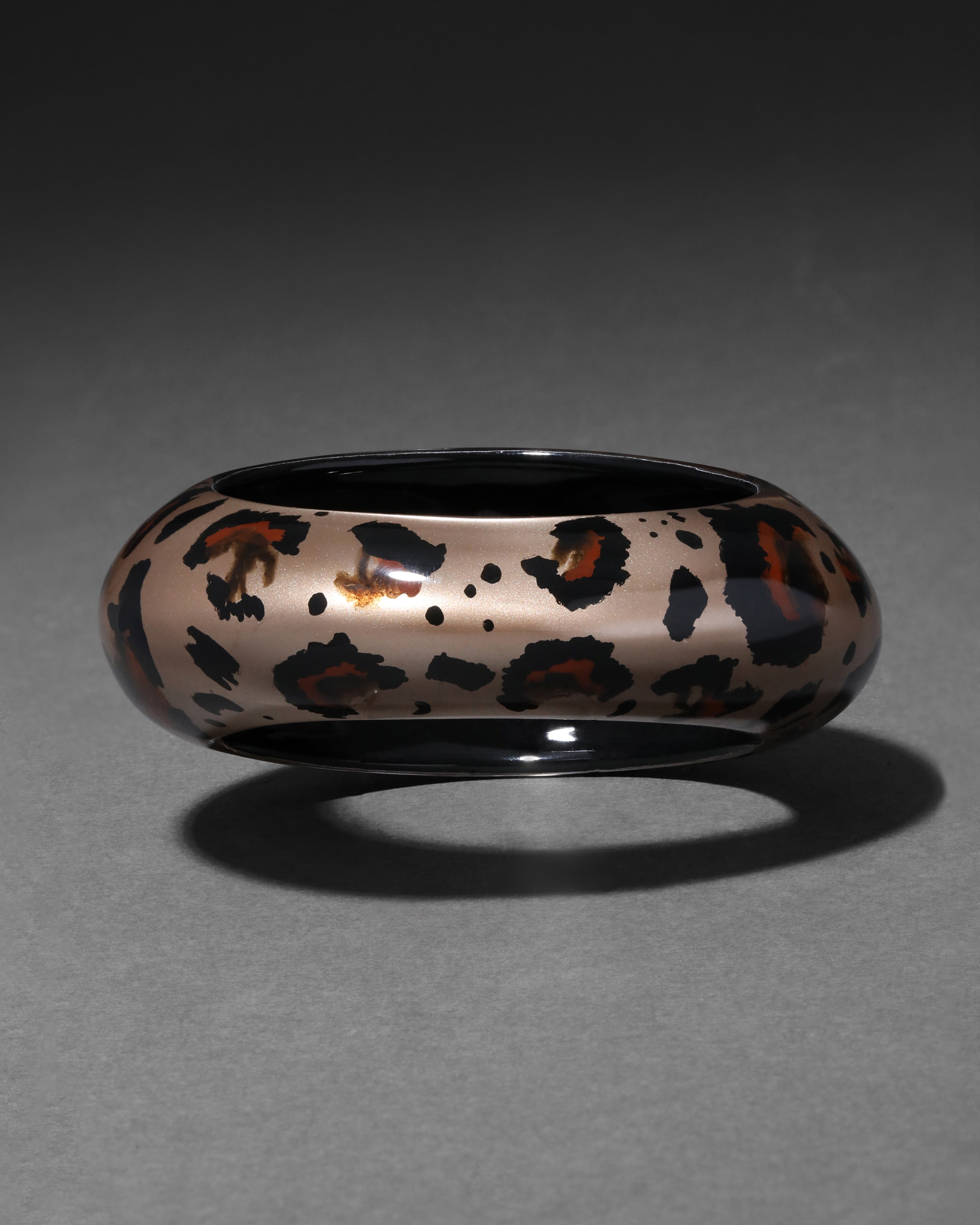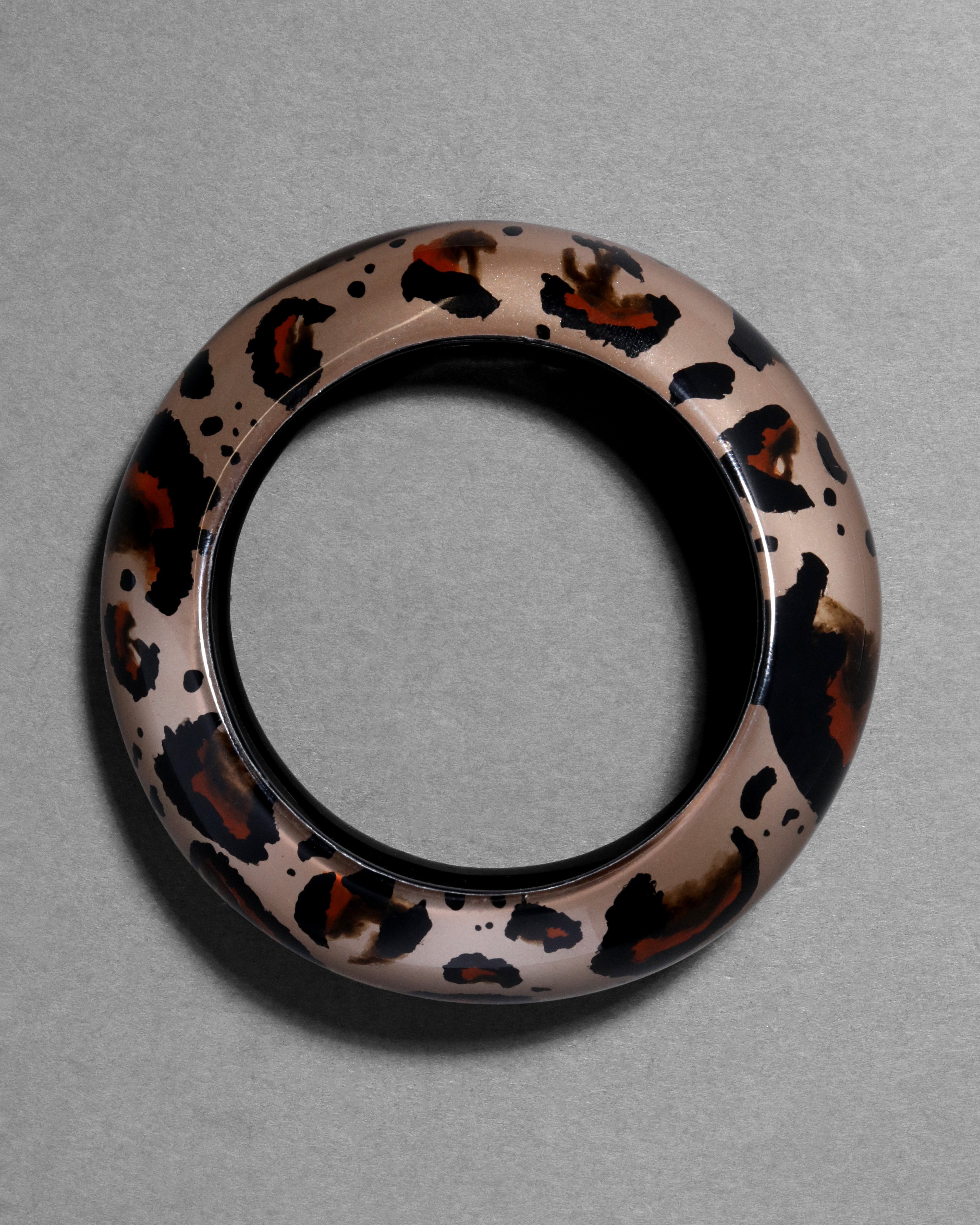 The hand-sculpted Tapered Puffy Lucite bangle is a bold reinterpretation of a version originally designed in 2007. Hand-painted in a one of a kind leopard print and hand-carved in our signature Lucite both inside and out to create a lightweight, domed and tapered silhouette.
