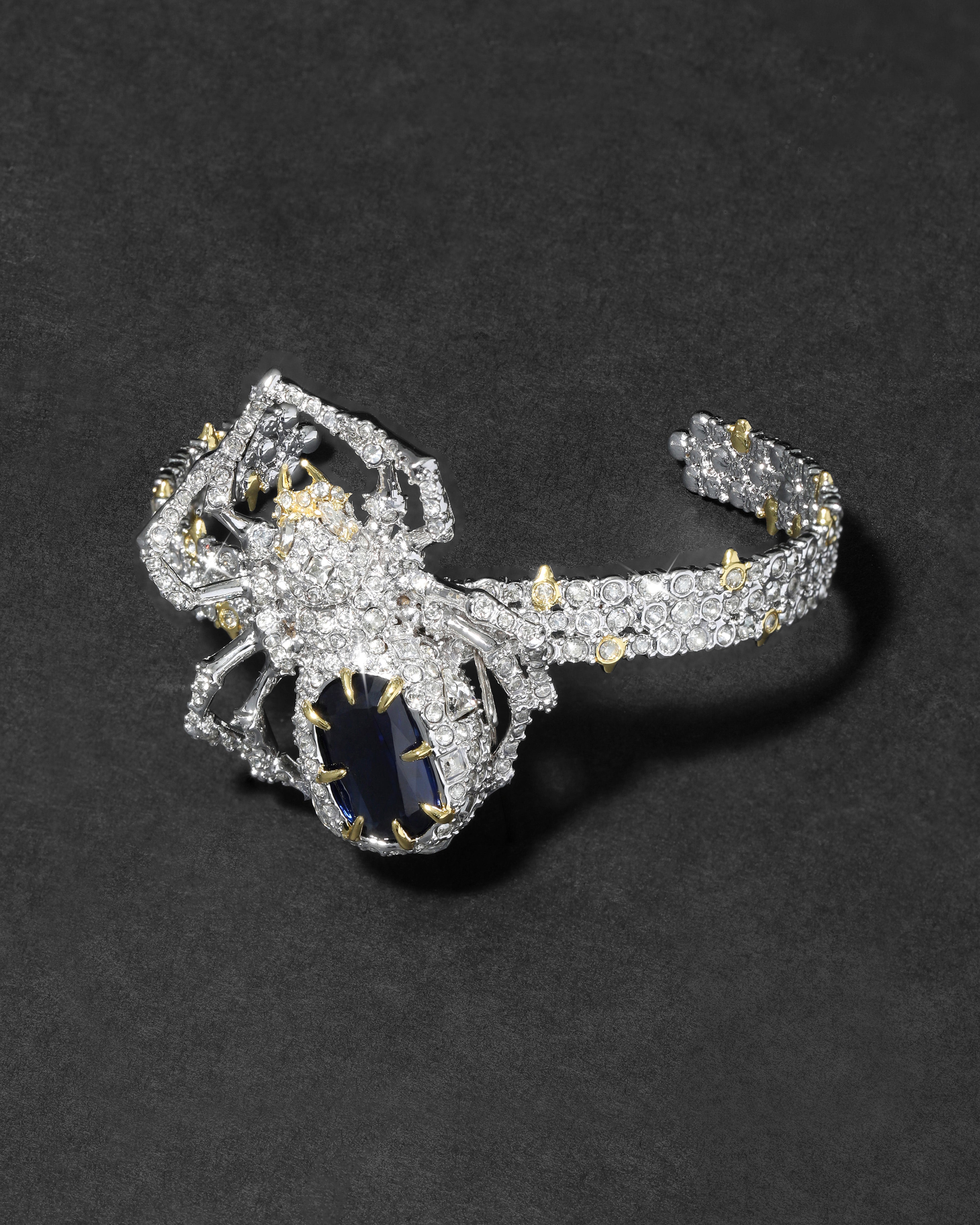 A large pavé crystal encrusted spider, with a dark sapphire crystal studded back, perches atop this stunning silver tone plated pavé crystal cuff with 14k gold plated spike accents.