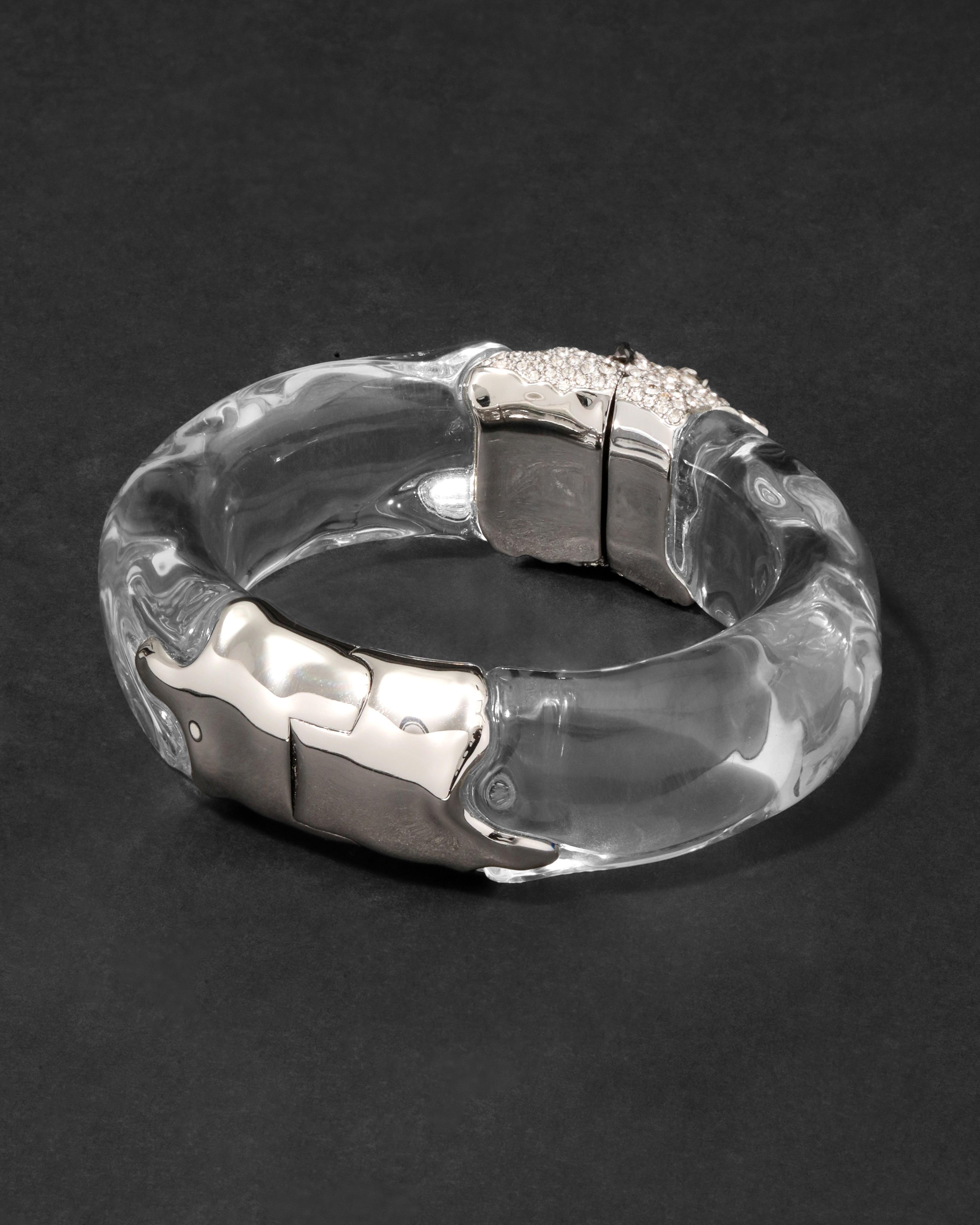 Our signature hand-sculpted liquid Lucite is hand-polished to create a watery organic silhouette on this hinged bracelet. Accented with crystal pavé set in silver tone plating for an icy, high glamour finish.