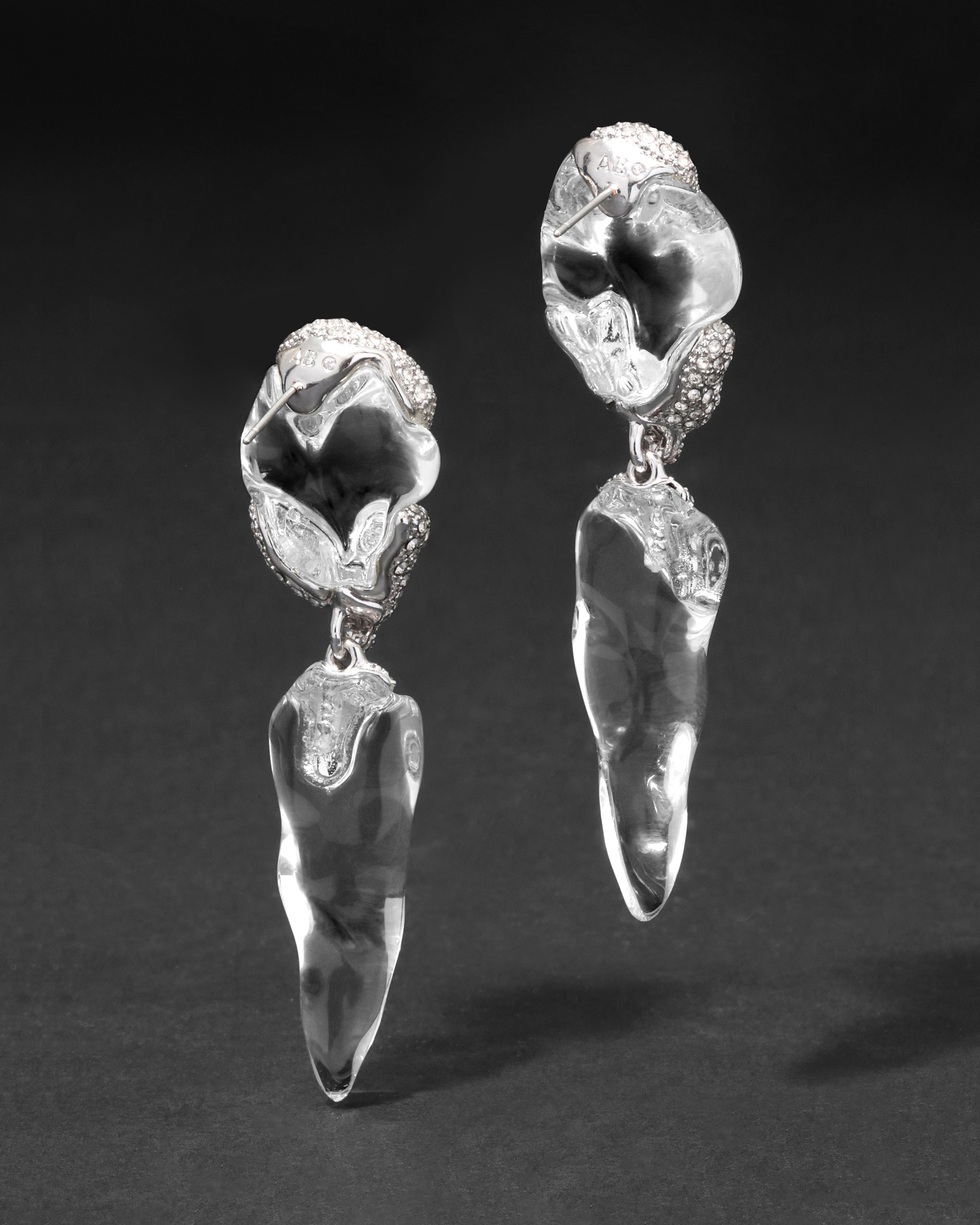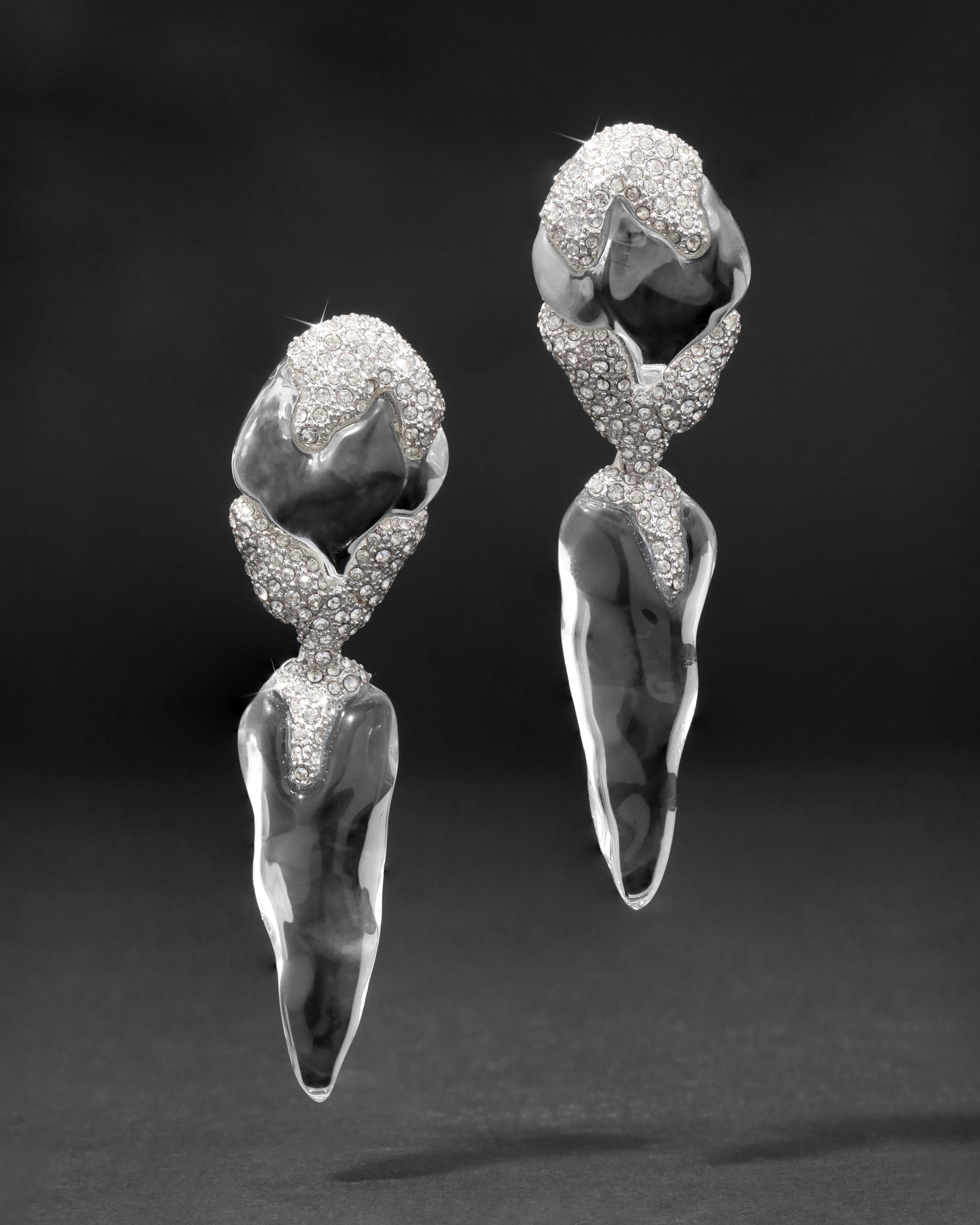 Glacial liquid Lucite post earrings are hand-sculpted and hand-polished with a watery silhouette that catch light from every ripple. Capped with dripping crystal pavé in silver tone plated settings, for an opulent finish.