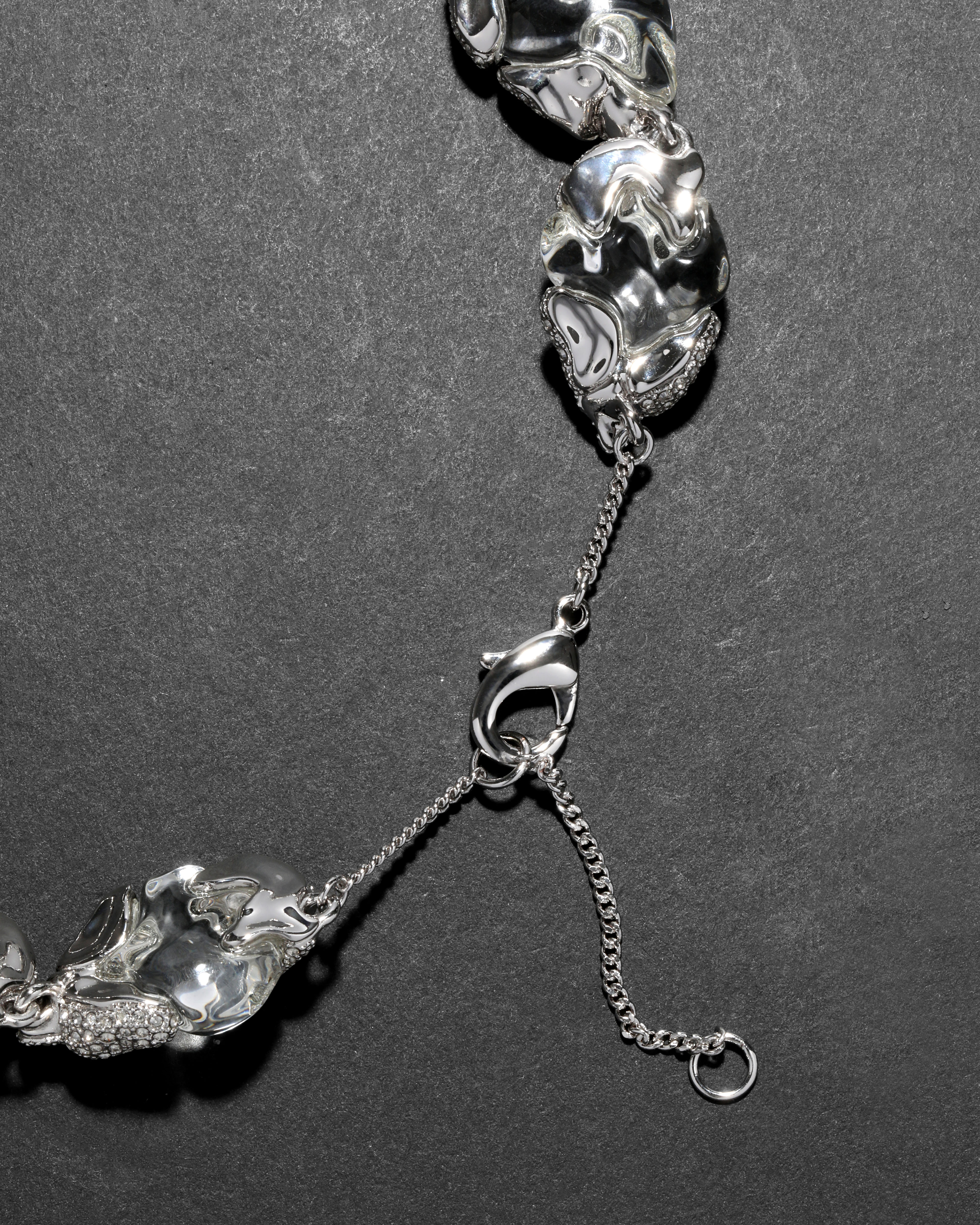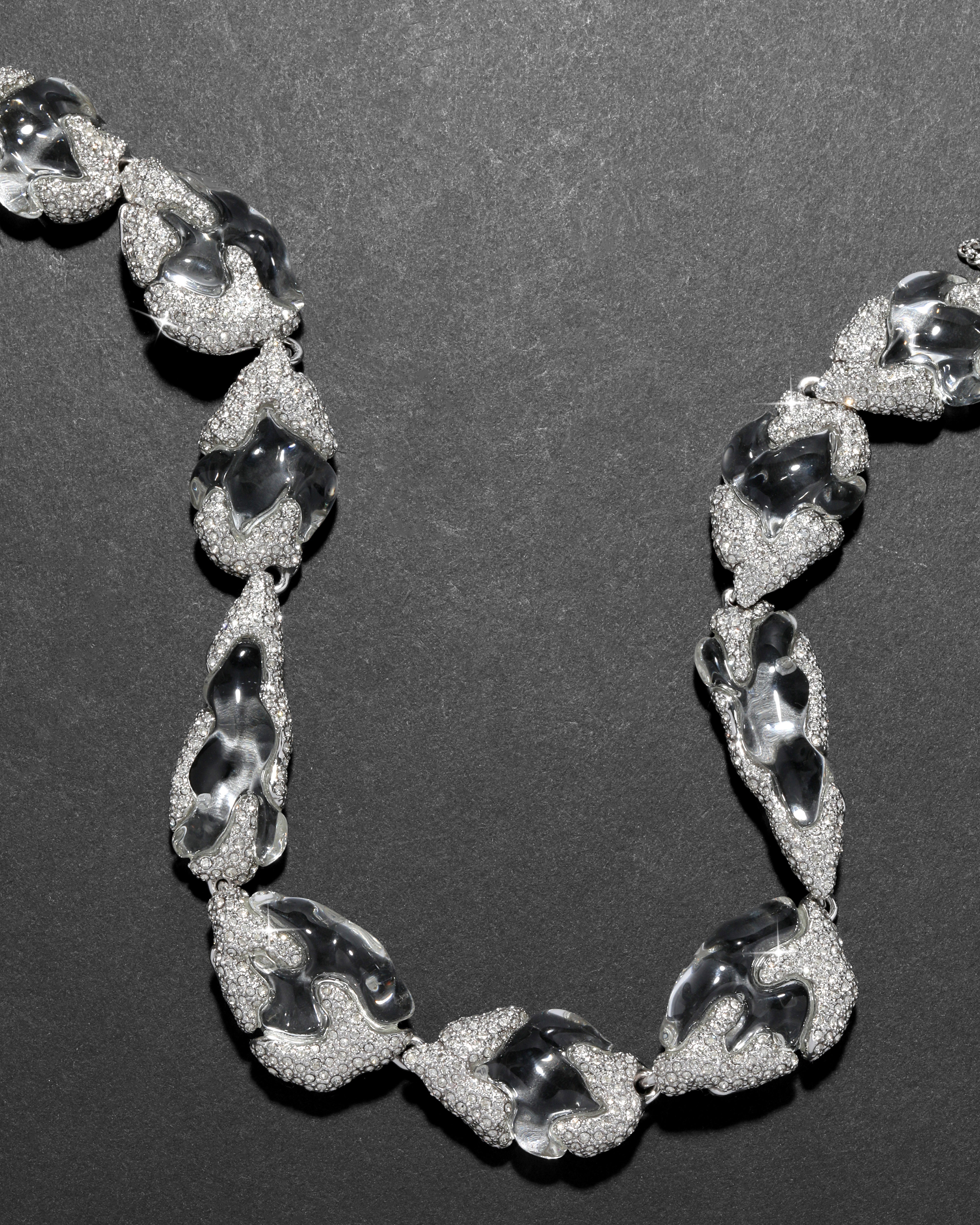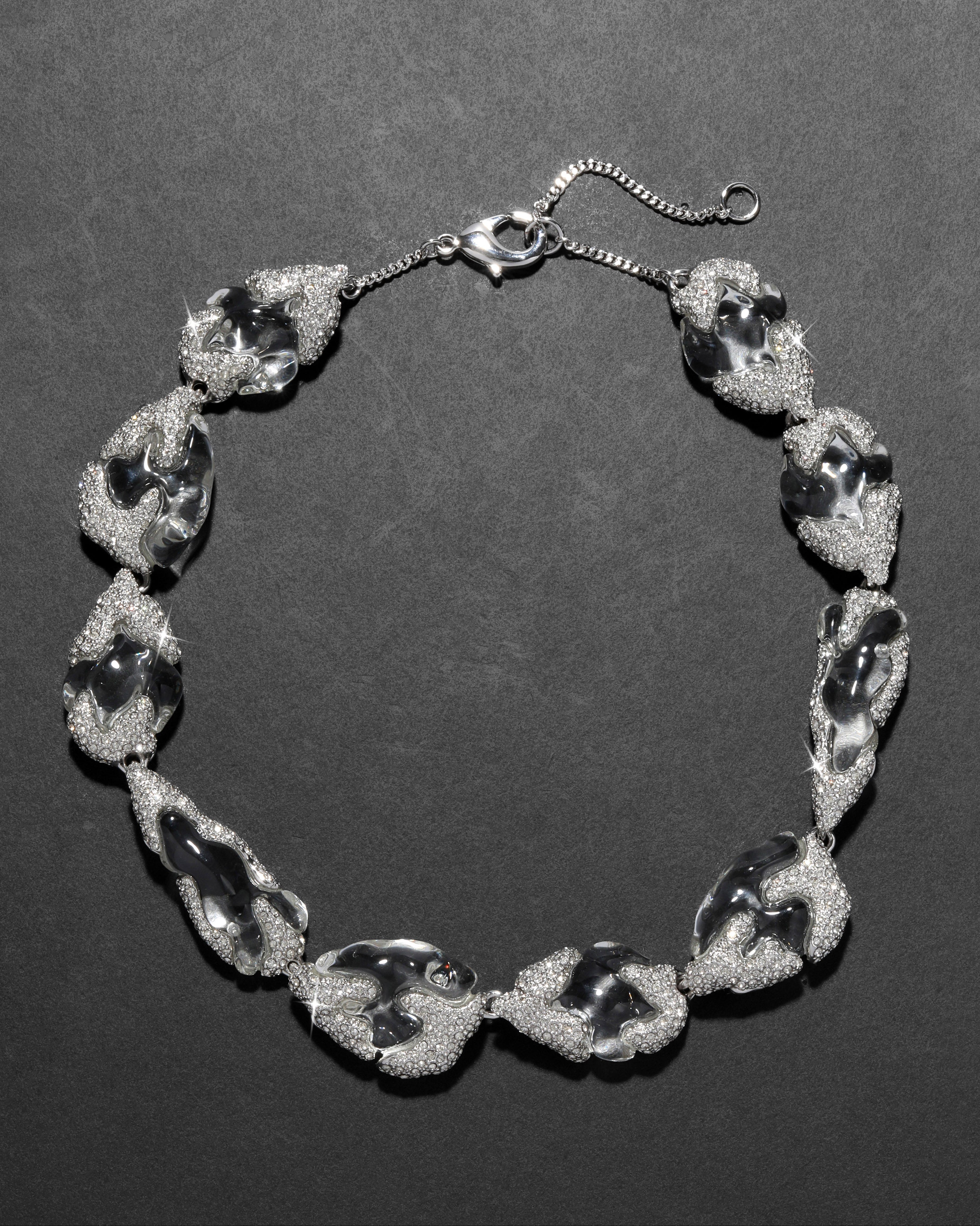Watery pebbles of hand-polished liquid clear Lucite drop along the neckline on this glacial, hand-sculpted riviera style necklace. Accented with glistening crystal pavé set in silver tone plated metalwork for a luxe finish.