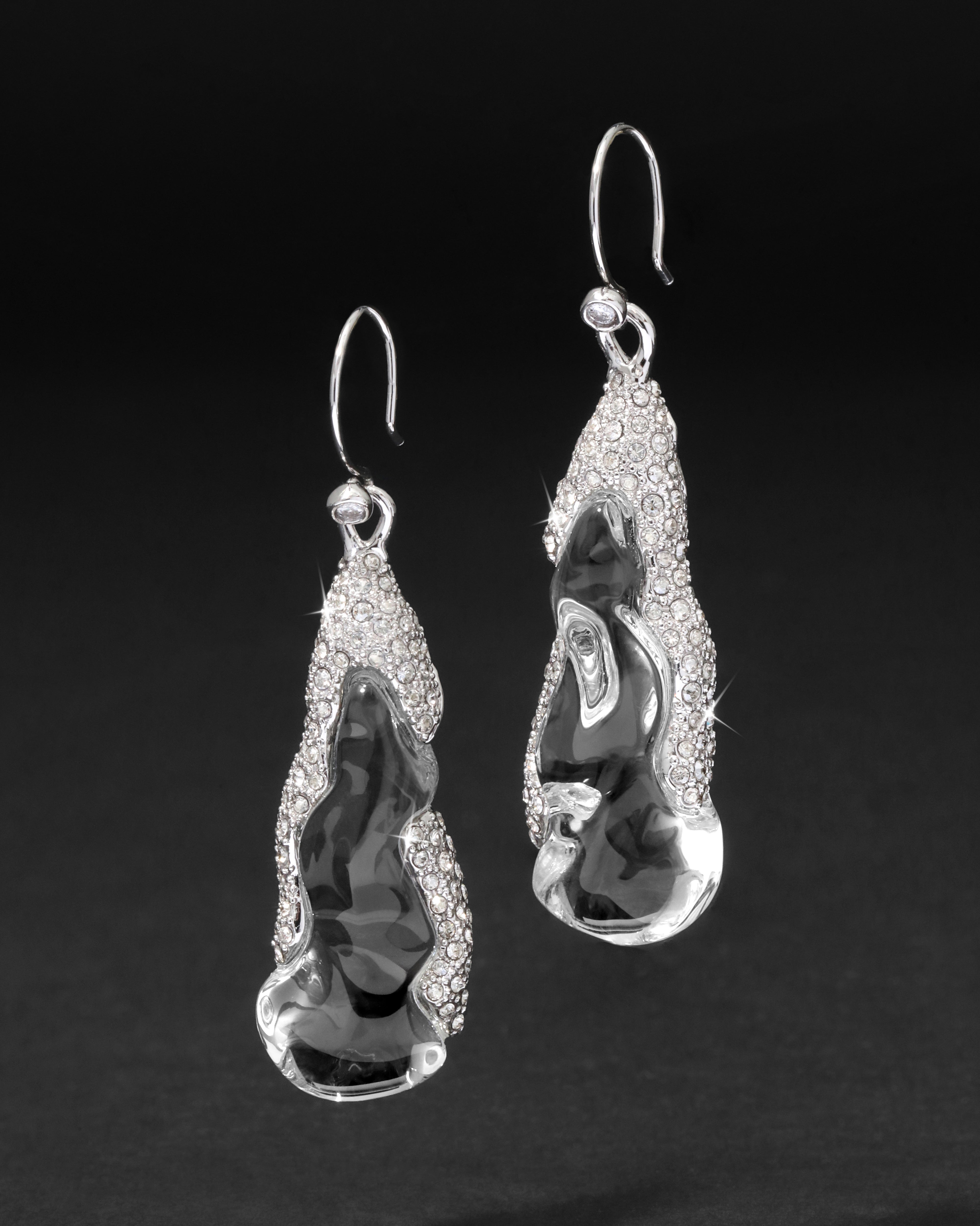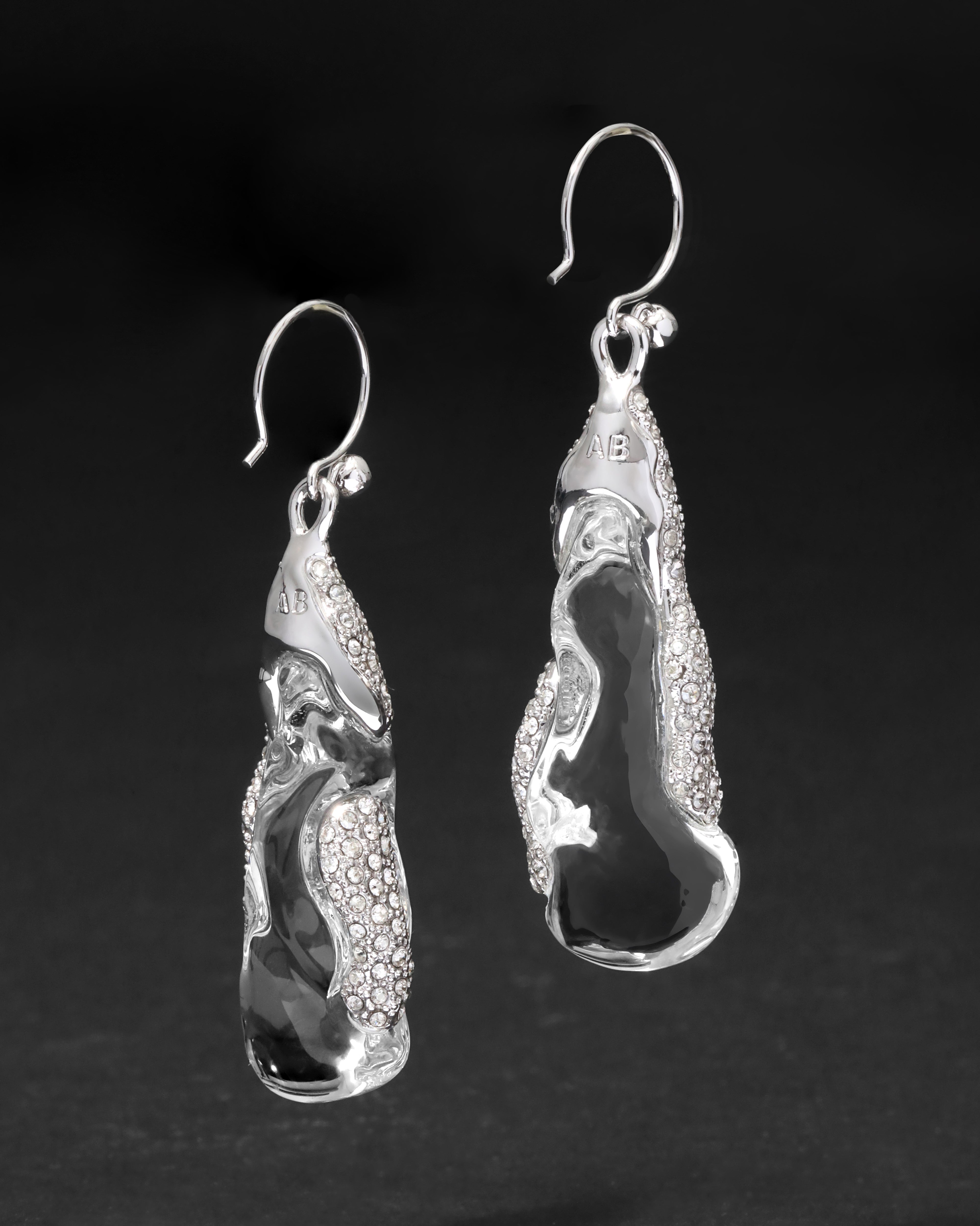 Dripping in glistening crystal pavé, these hand-sculpted liquid clear Lucite wire drop earrings catch light from every ripple. Like water in motion.