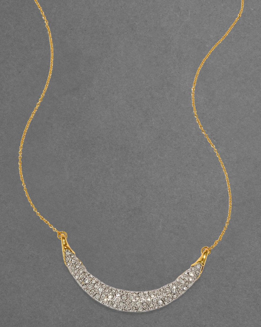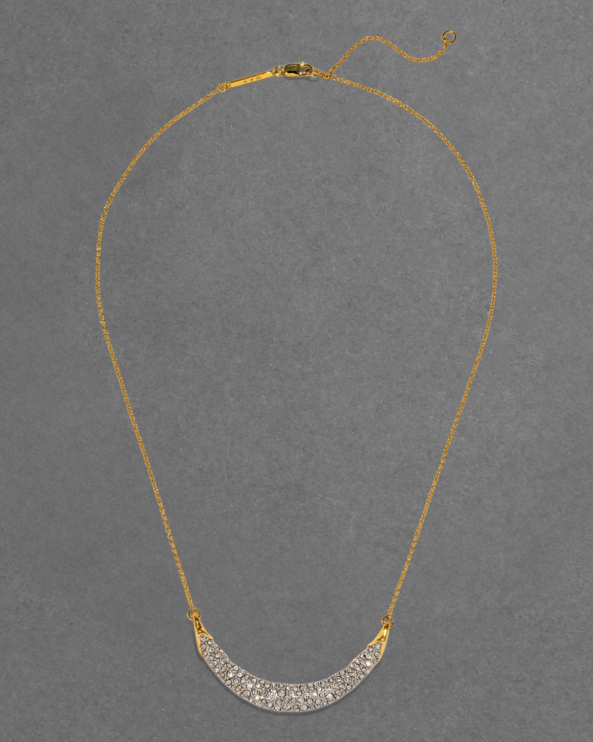 Custom cut inlaid pavé crystals merge together with molten 14k gold plated metalwork. Forming this sculptural crescent pendant necklace that perfectly catches light along the neckline.
