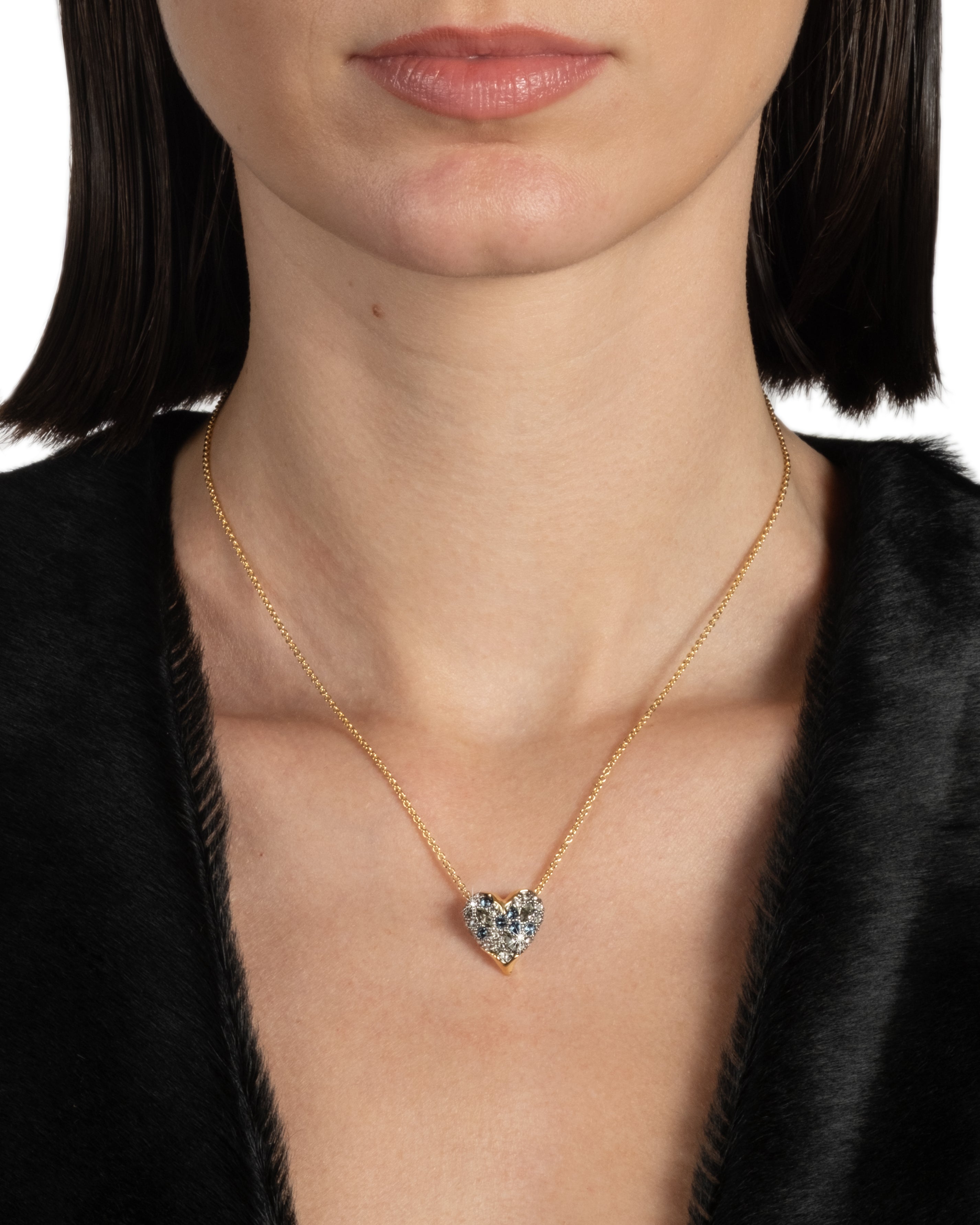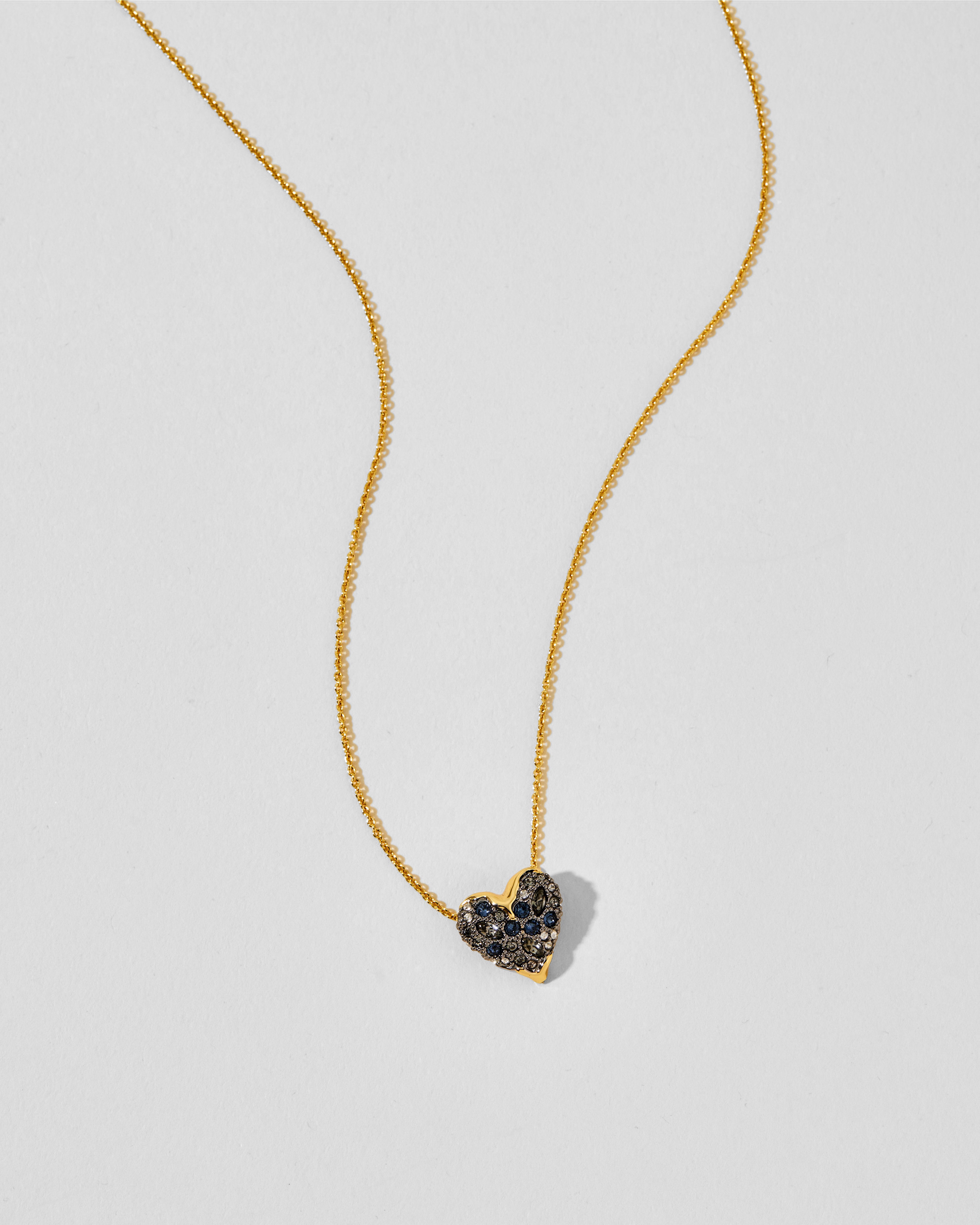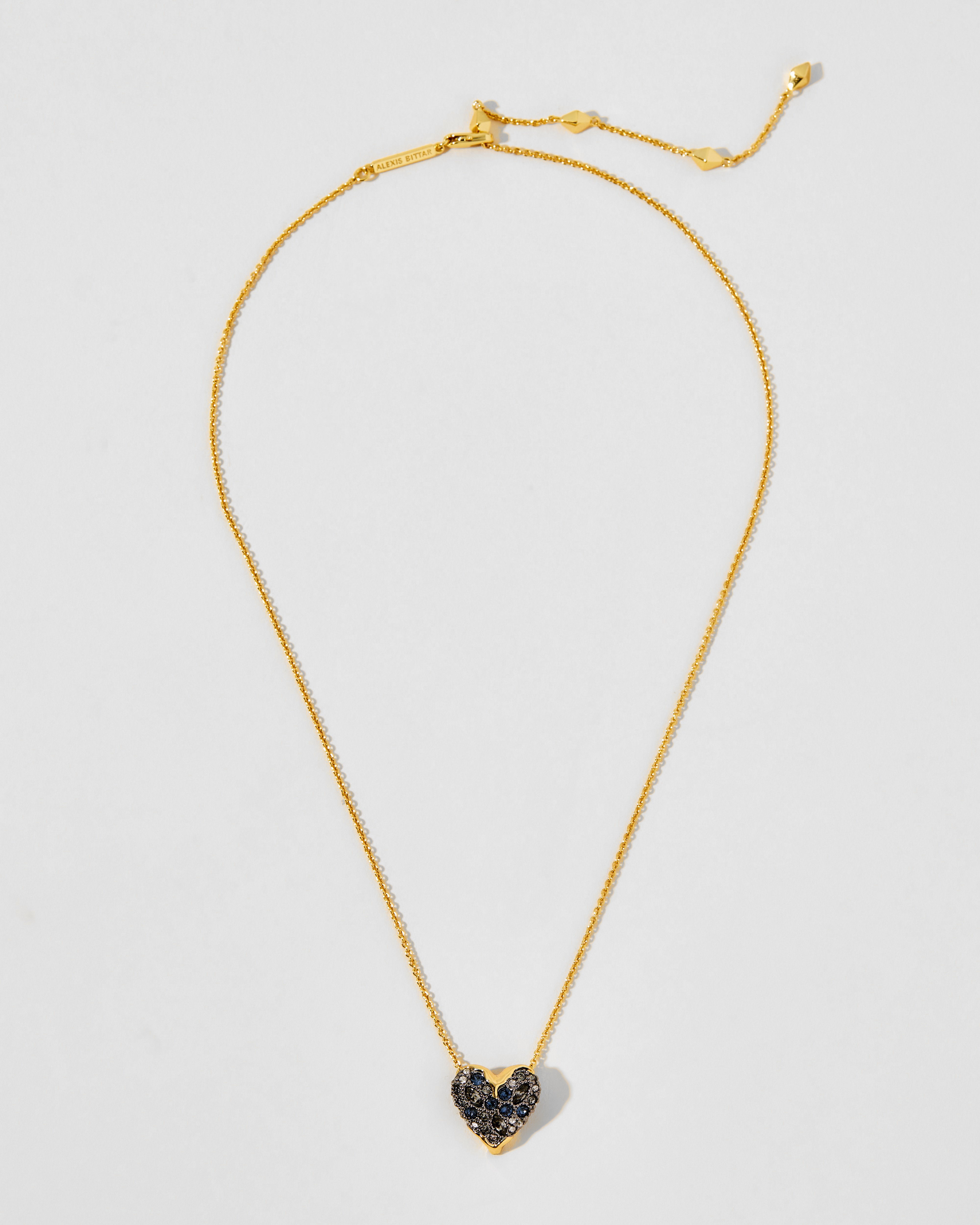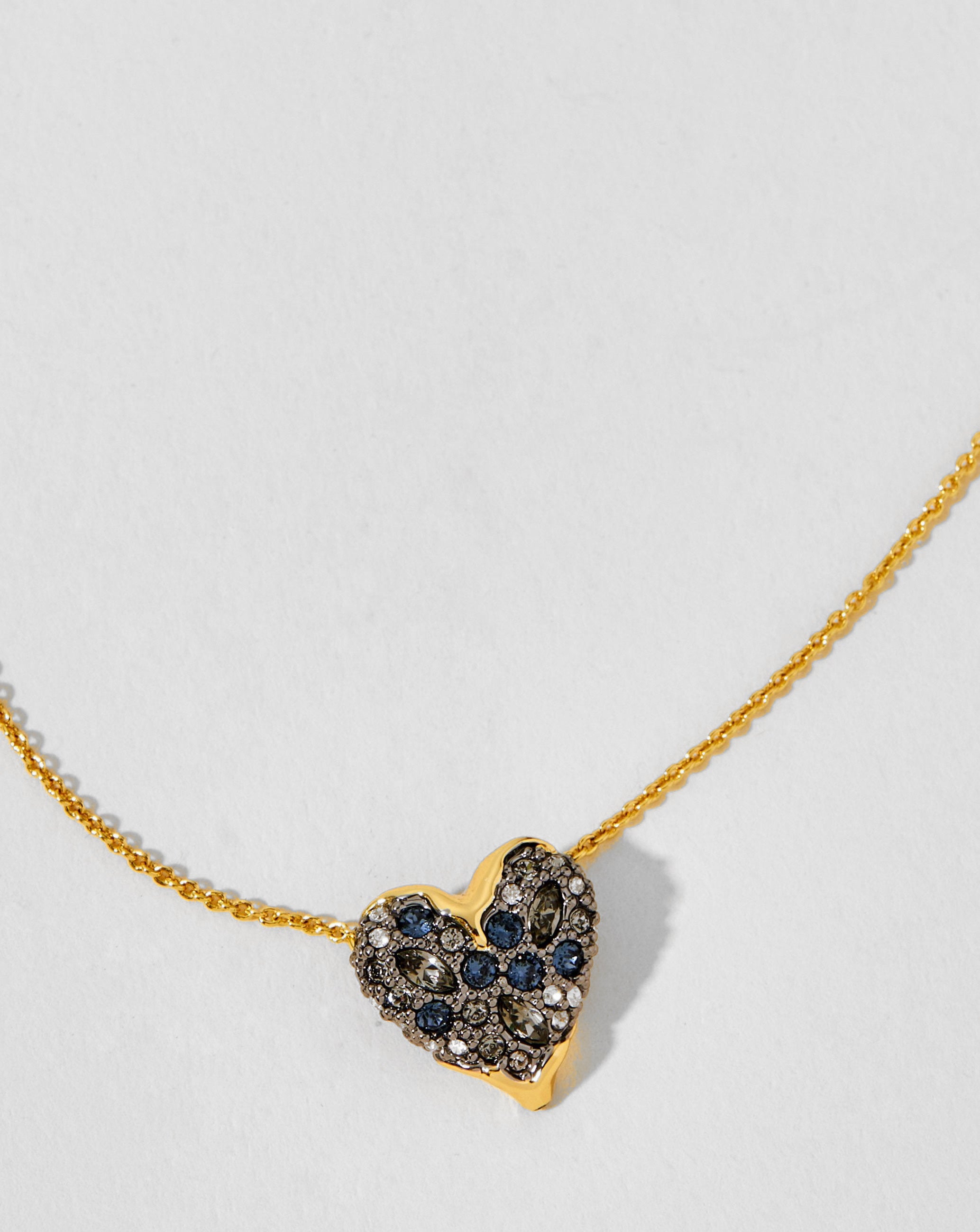 Antiqued rhodium metalwork in the shape of a heart is encrusted with an ombre of midnight blue and steel grey pave crystal, accented with 14k gold plated detailing.