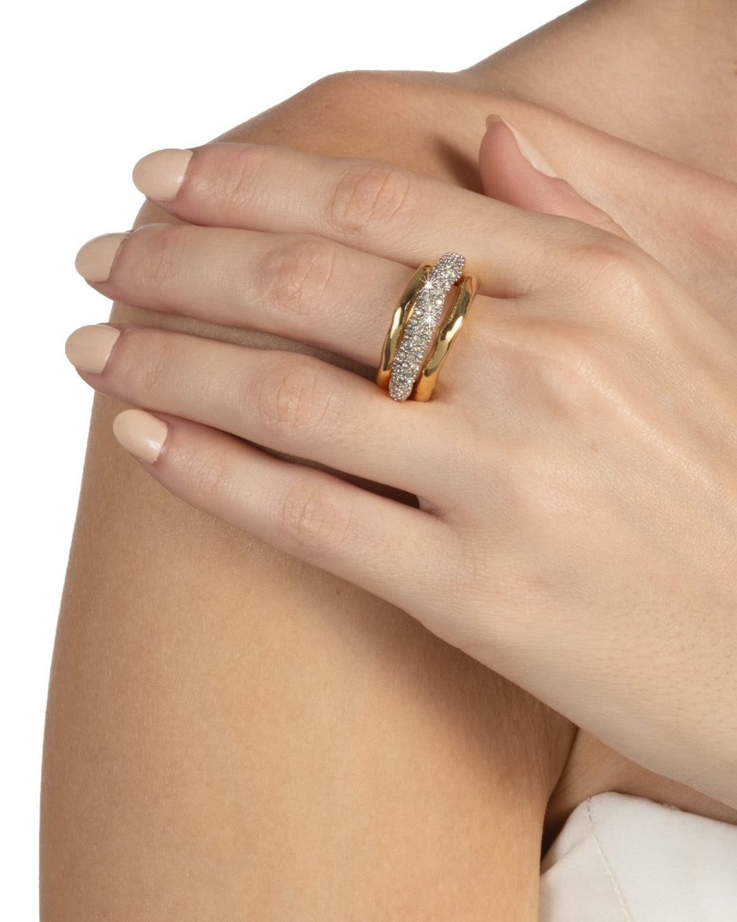 gold and crystal orbiting ring are signature materials of the Alexis Bittar jewelry collection. Combinations of crystals and custom metalwork encapsulate this gold statement ring to create a hand-sculpted design with intricate craftsmanship.