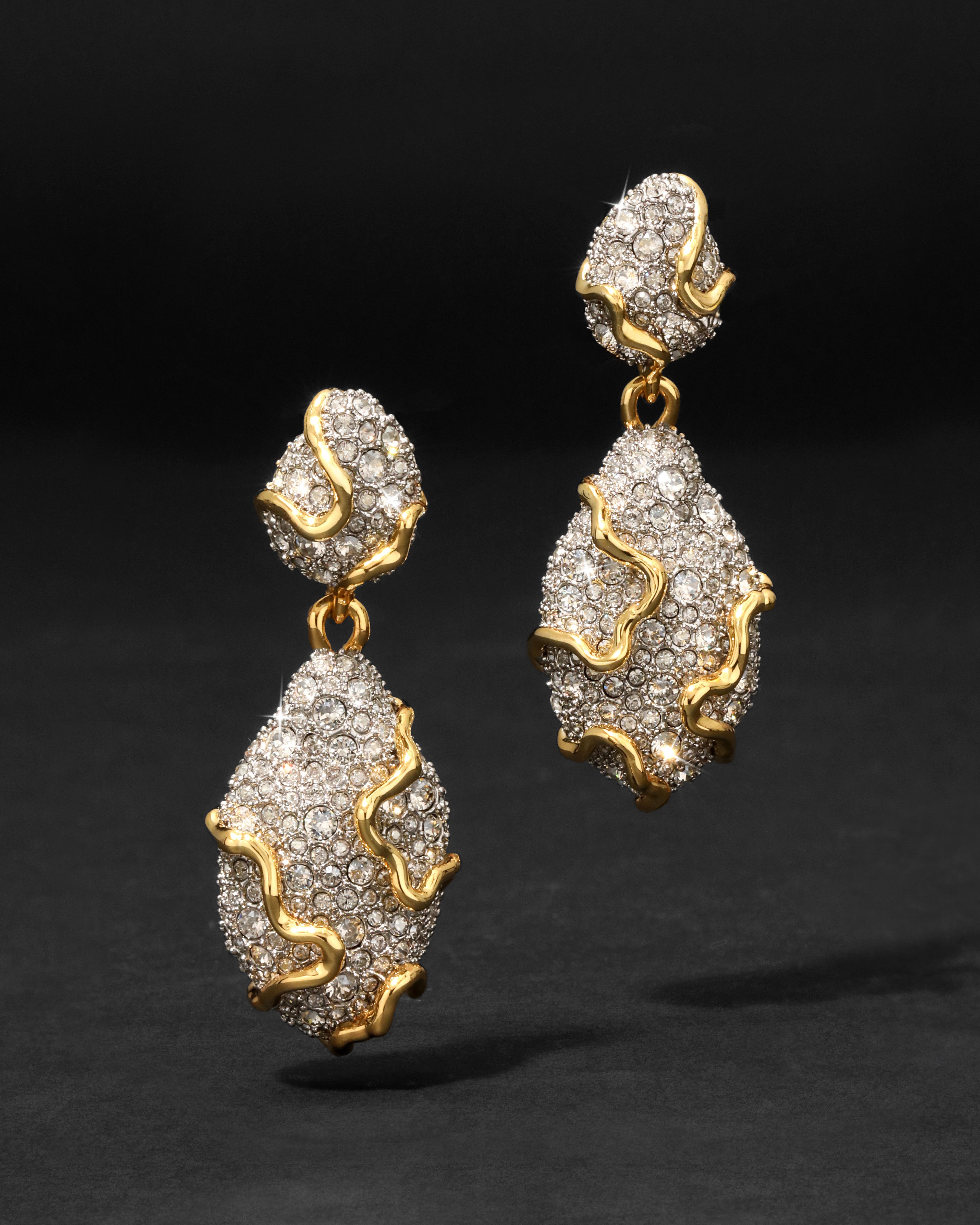Rich strands of molten 14k gold plated metalwork wrap to hold two graduated crystal pavé milgrain pebbles on these double drop earrings. Crystals are set in silver tone plating for a luxe contrast.