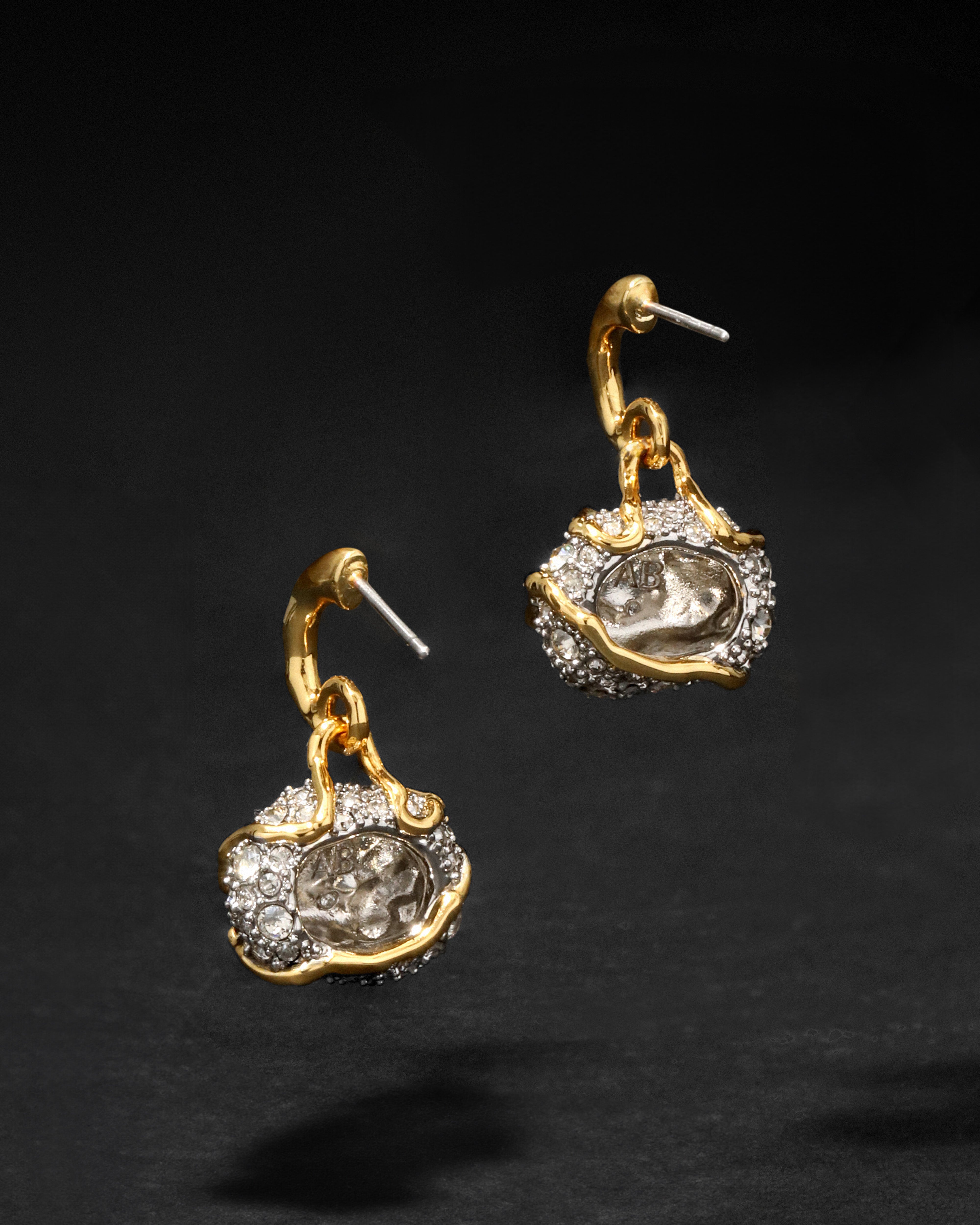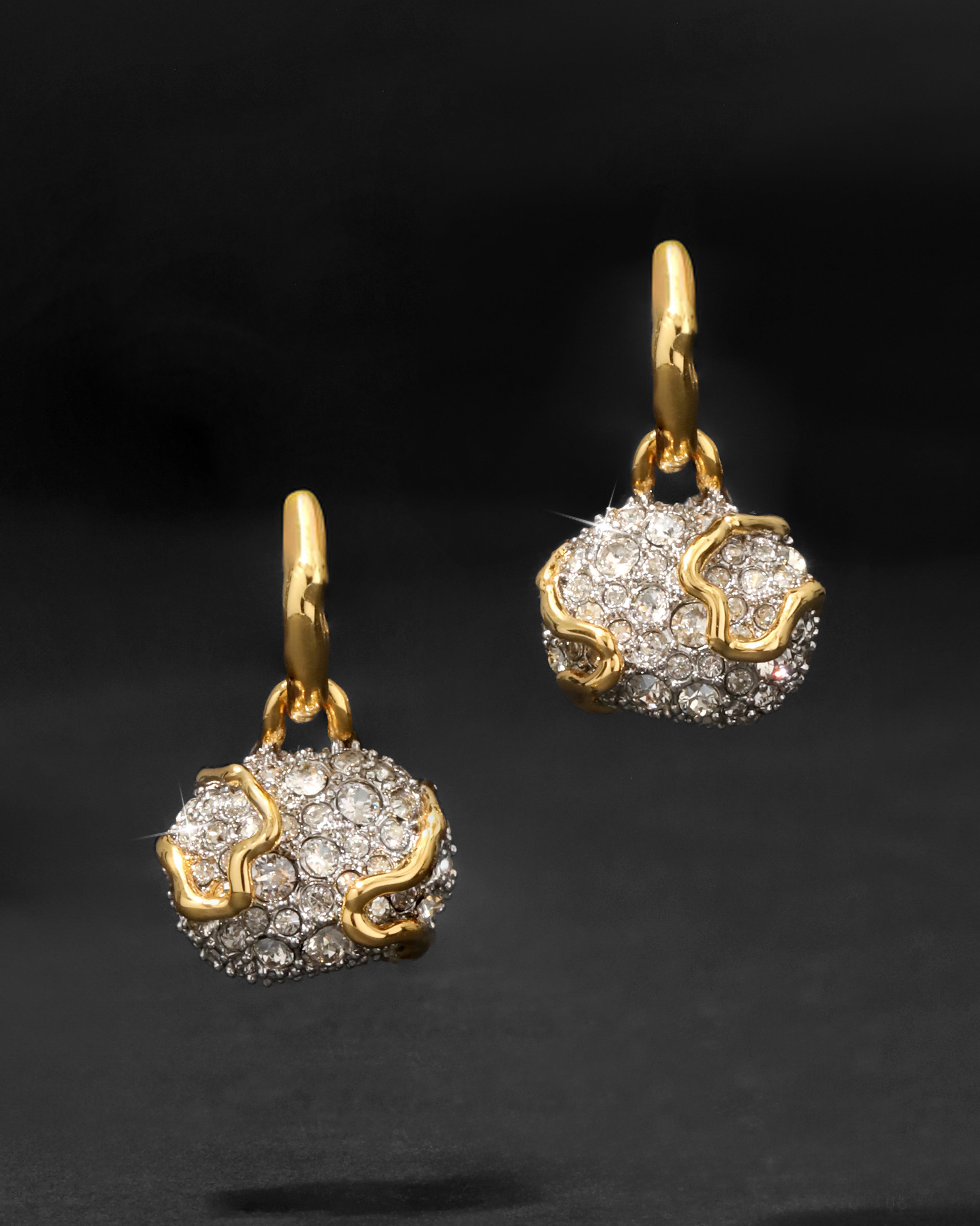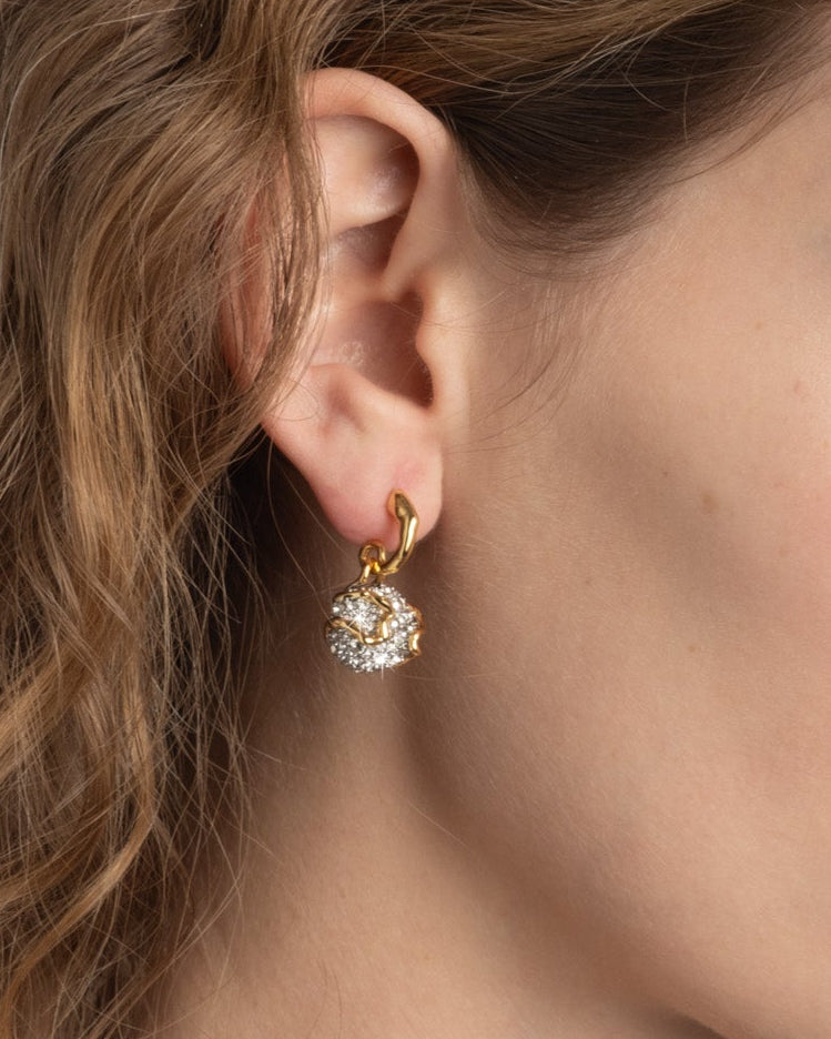 Rich 14k gold plated metalwork winds across crystal pavé milgrain pebbles that swing with movement from these petite hoop earrings.