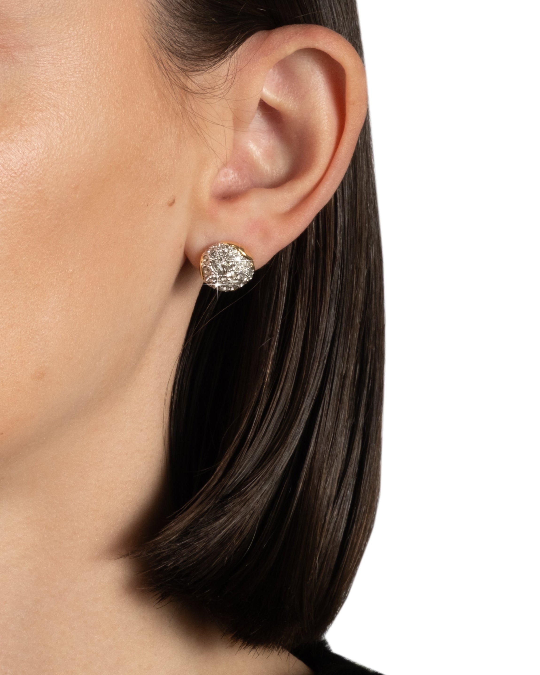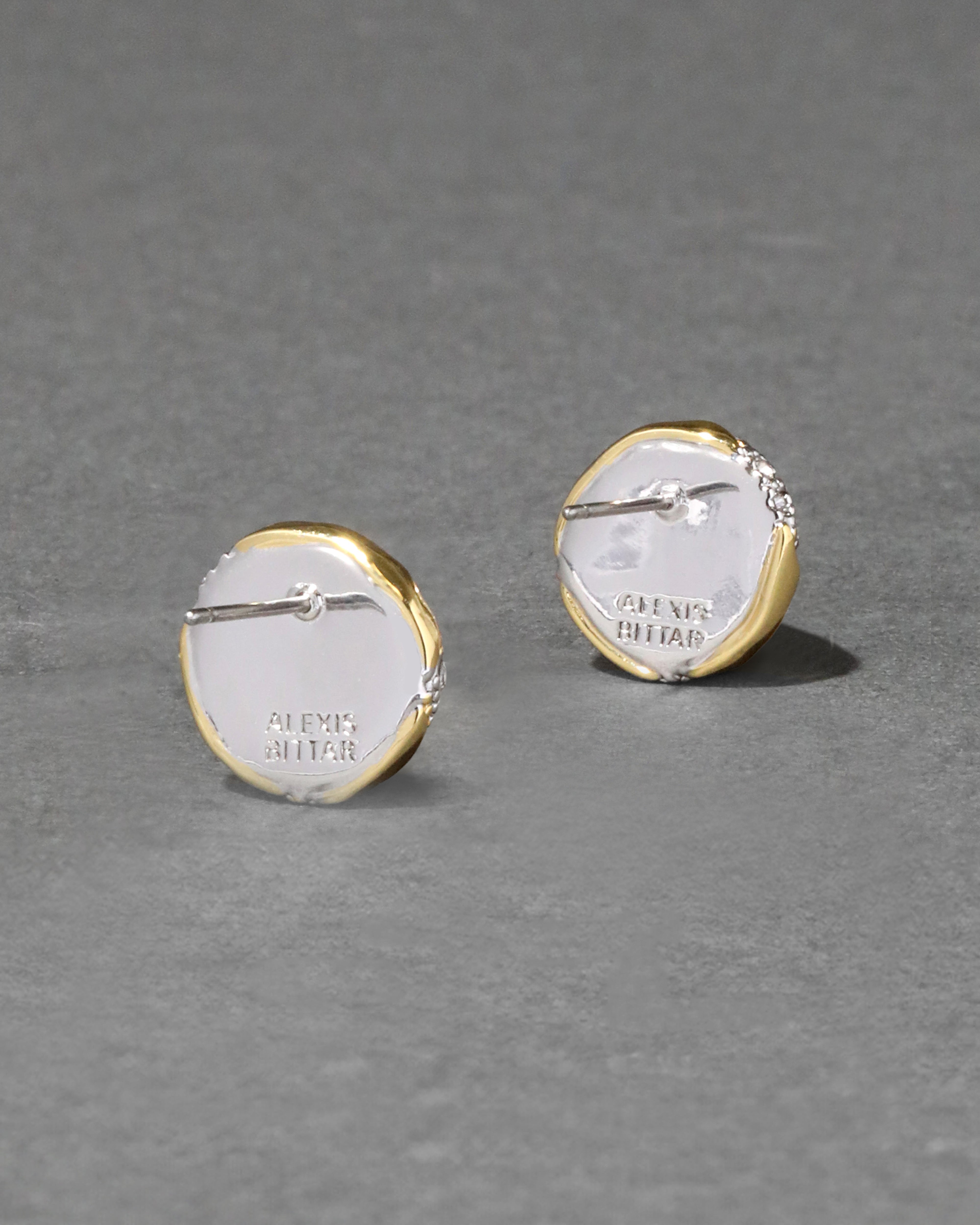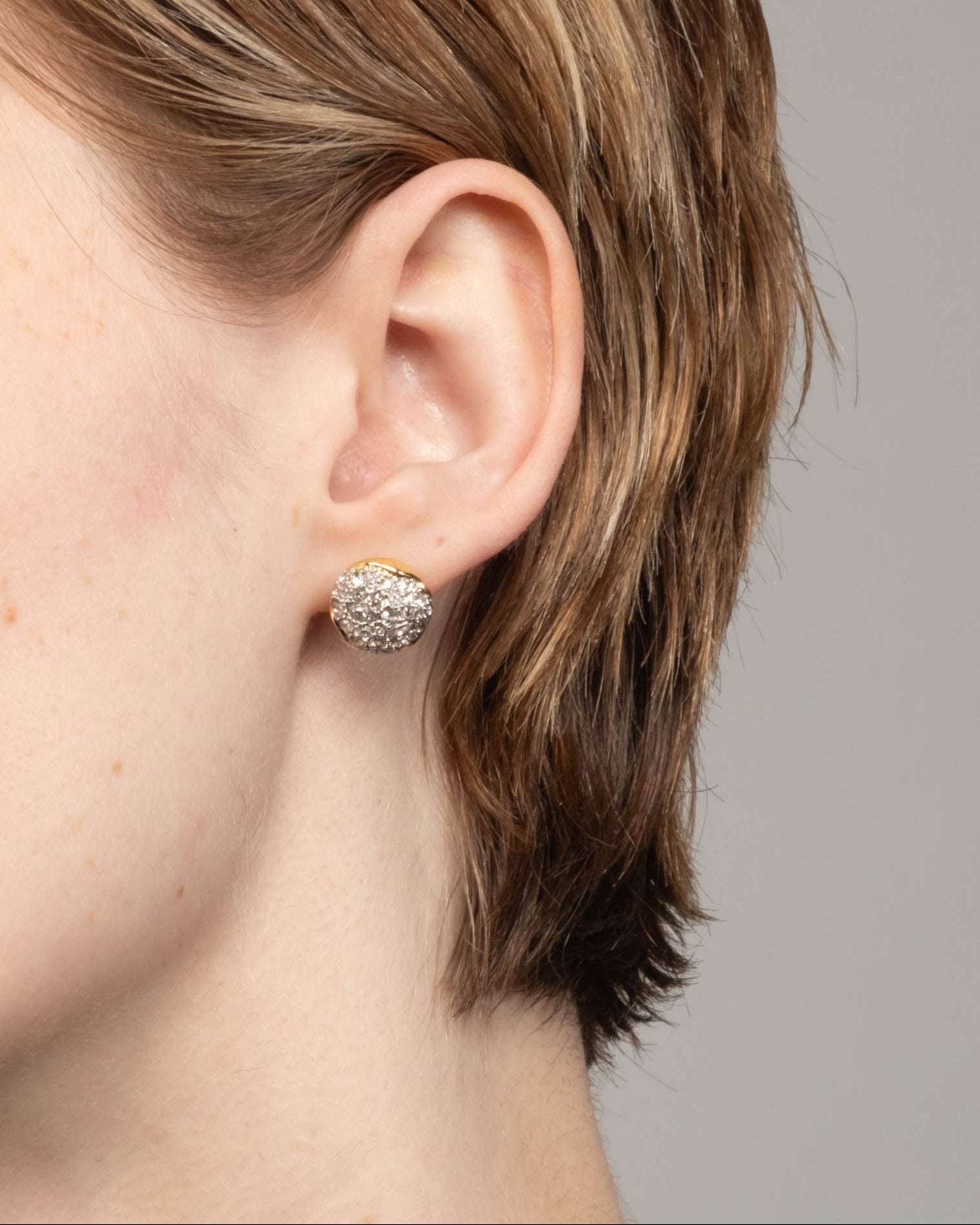 Timeless organic circle stud earrings with 14k liquid gold plated edges surrounding a dazzling pavé crystal encrusted silver tone plated center. Sold as a pair.