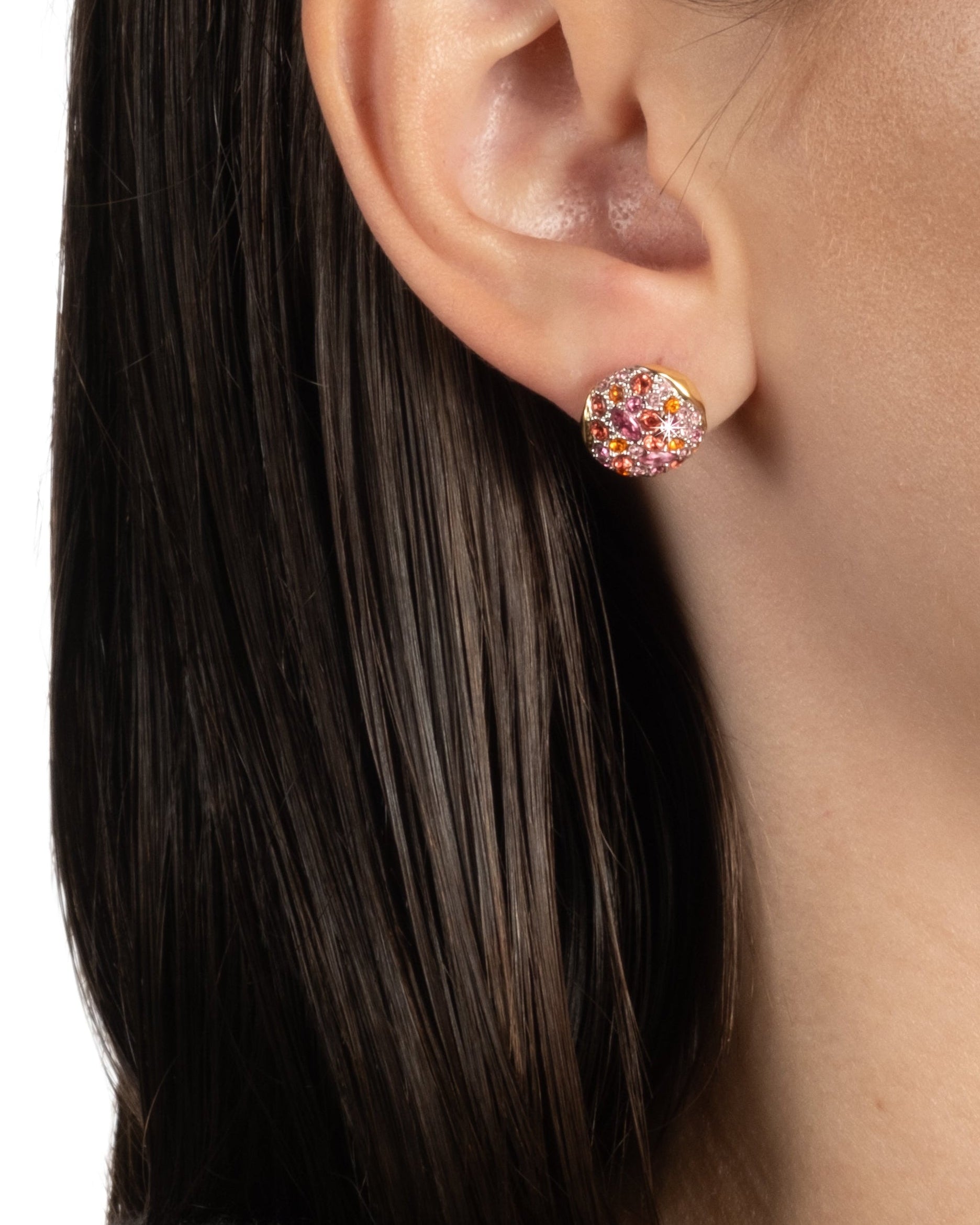 Soft organic circle stud earrings with a 14k liquid gold plated rim surrounding an ombre of vibrant pink, fiery orange and soft white pavé crystals. Sold as a pair.