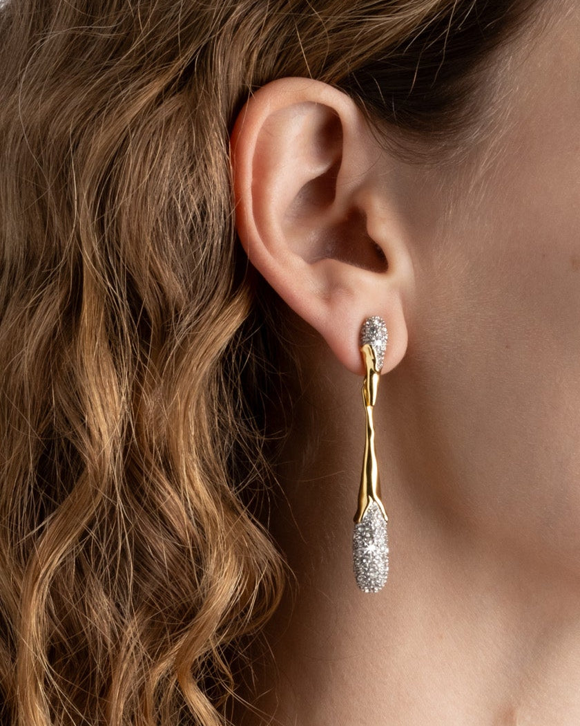 Molten 14k gold plated teardrop earrings with a sleek, linear silhouette that's hinged for movement. Dripping pavé crystal set in silver tone metalwork caps each end.