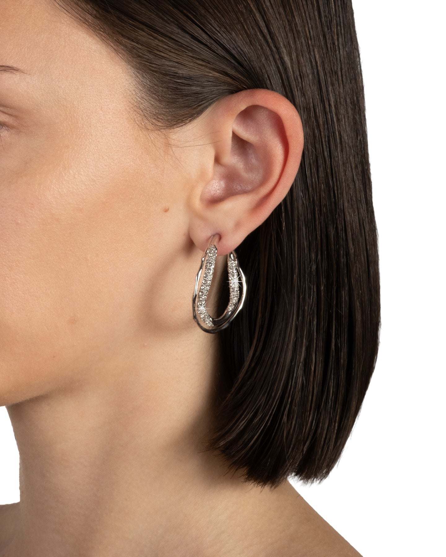 Delicate silver tone plated metalwork twist and layer with dazzling crystal pavé to form these versatile hoop earrings with a sculptural twist. Sold as a pair.