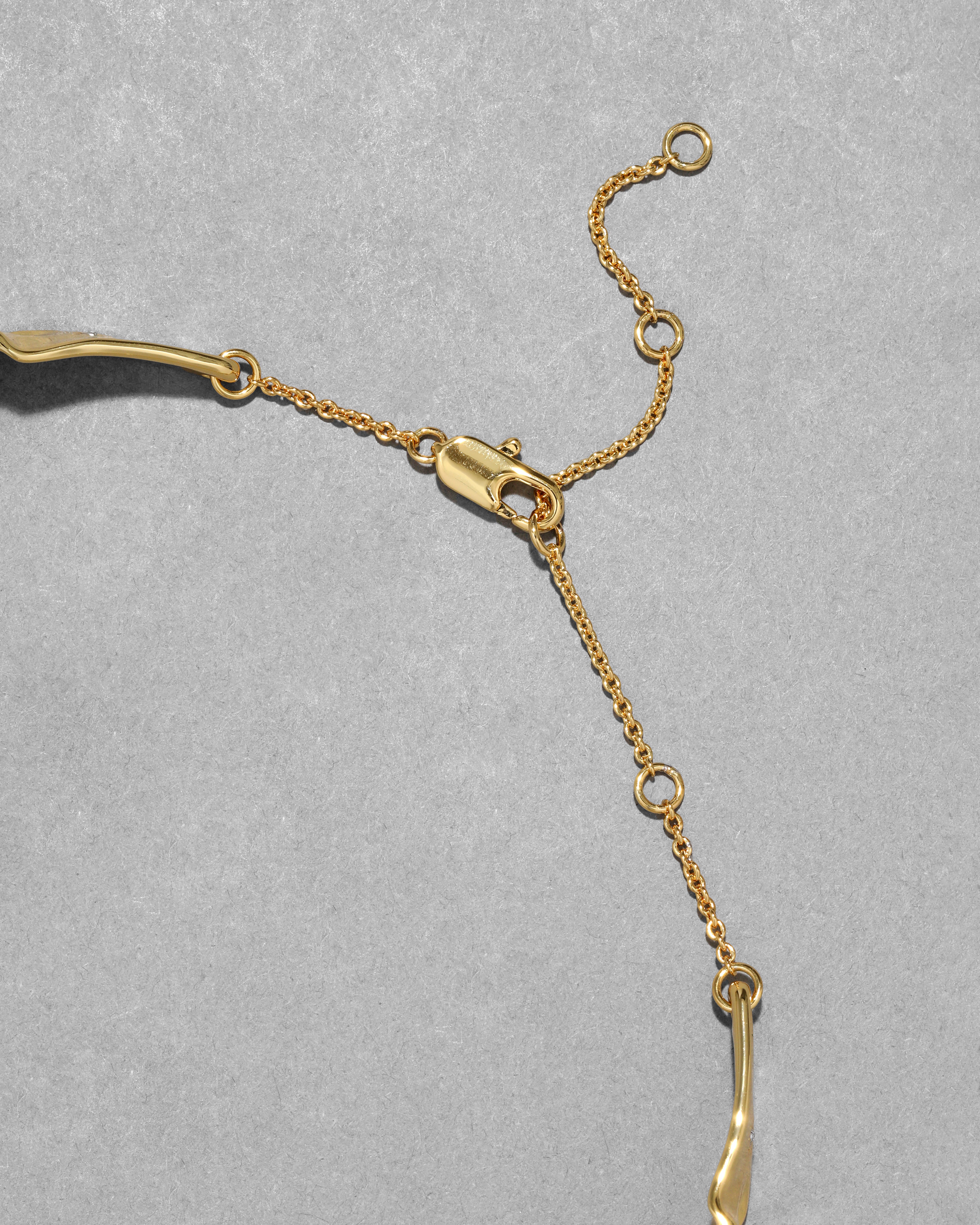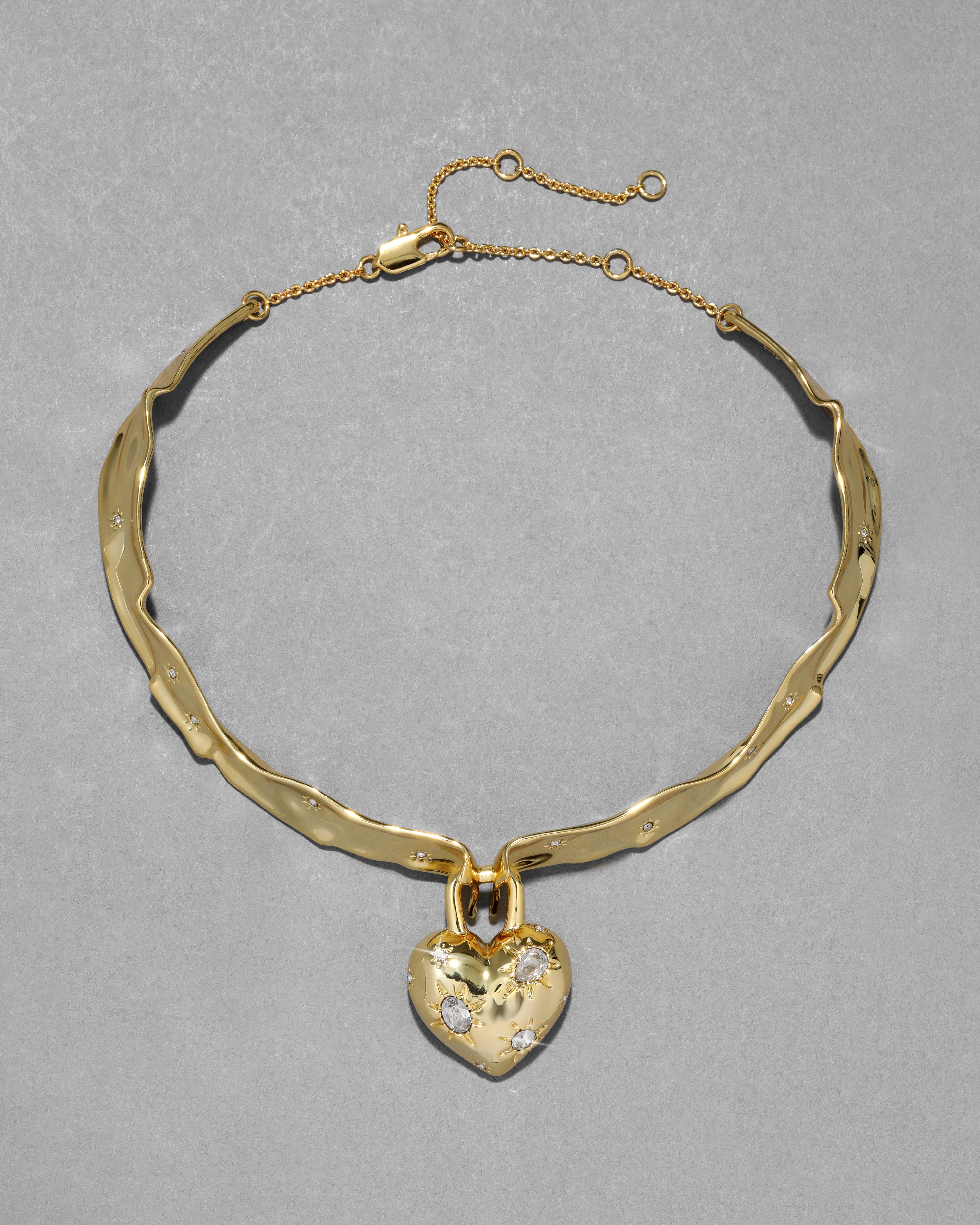 A modern starburst crystal accented 14k gold plated collar necklace gets a retro twist with a crystal accented puffy heart pendant at center.