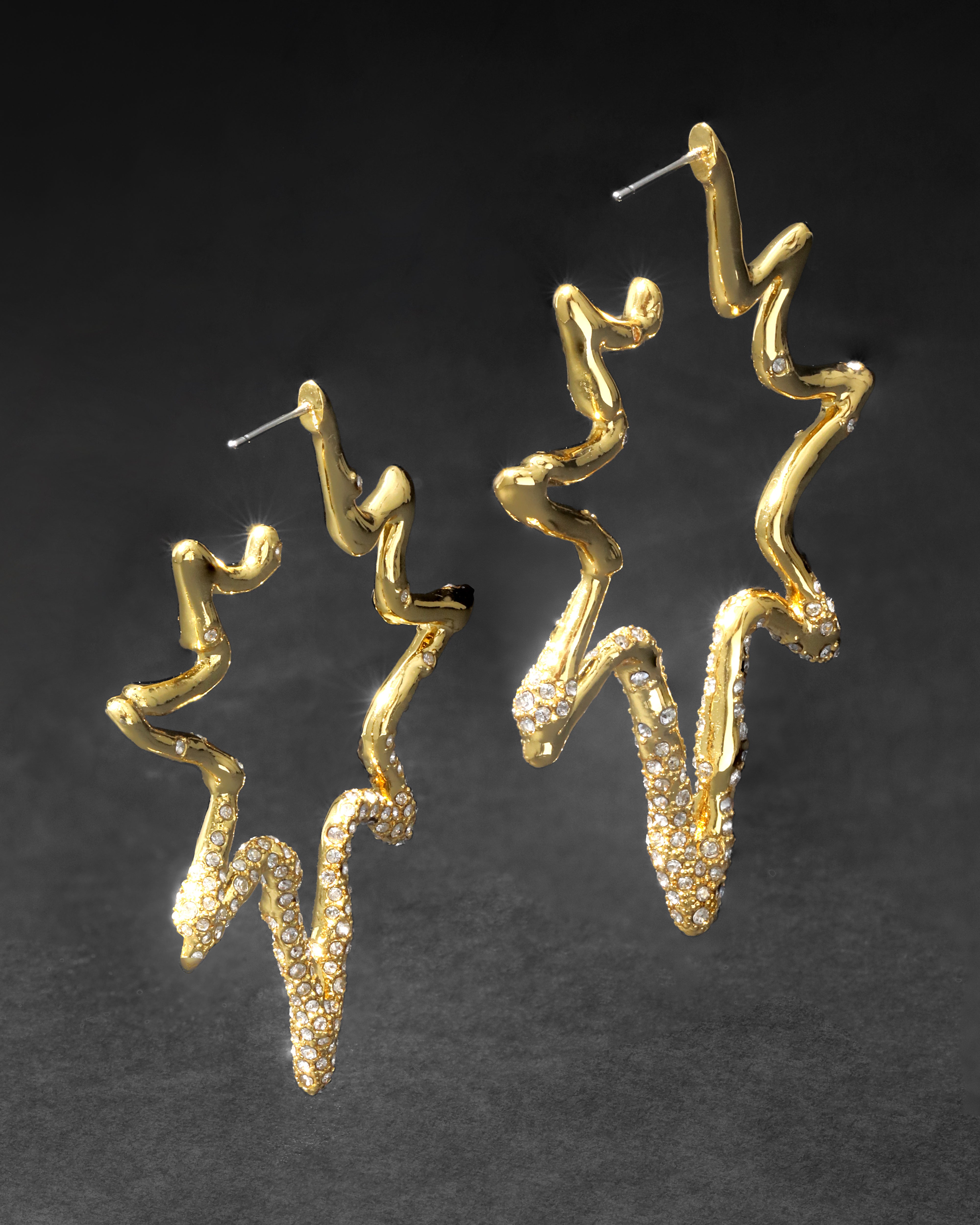 Glistening crystal pavé accents these molten 14k gold plated hoop earrings, with a playful sculptural open starburst silhouette.