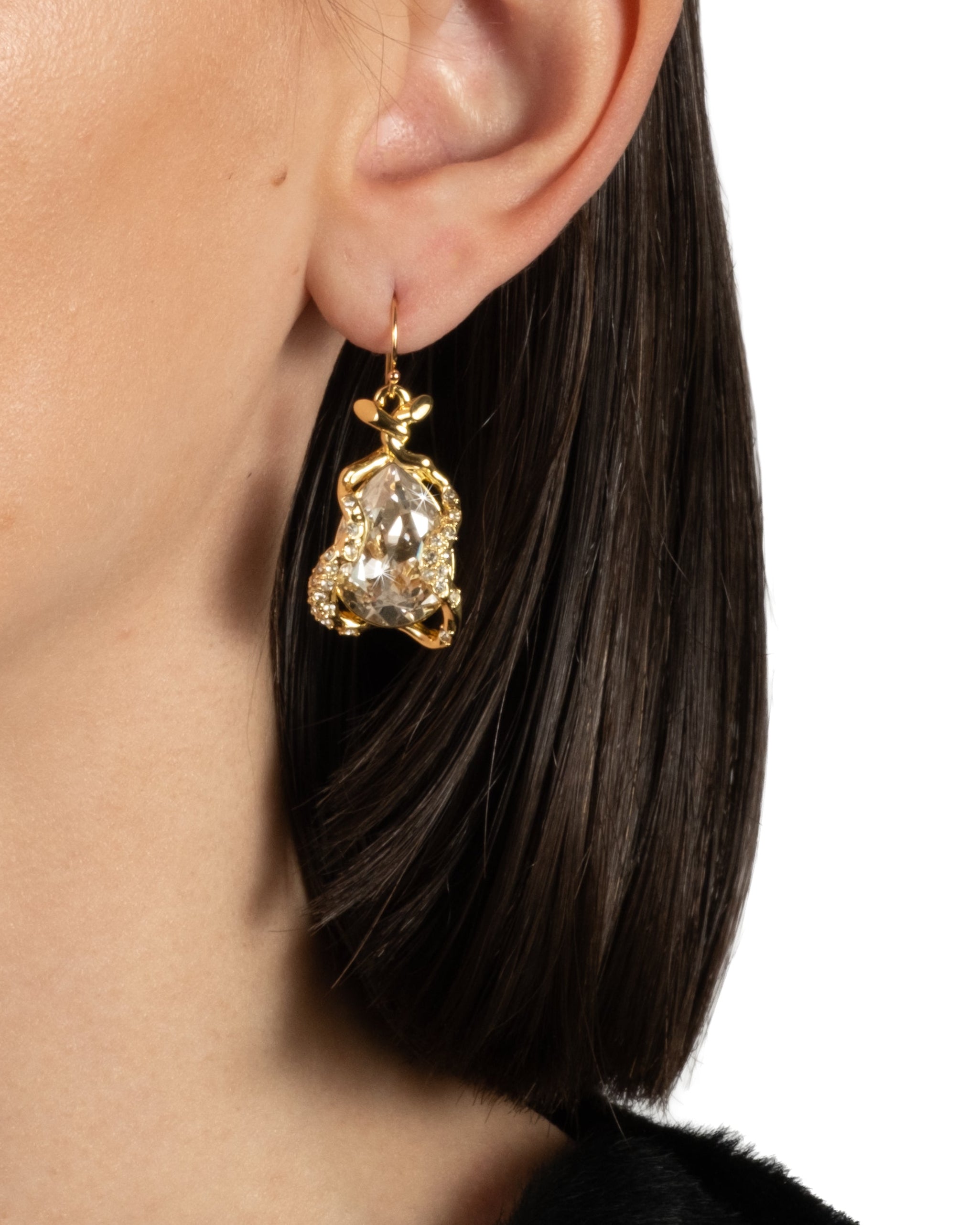 Custom cut dazzling crystals are nestled in sinuous crystal accented 14k gold plated metalwork, on these timeless wire earrings. Sold as a pair.
