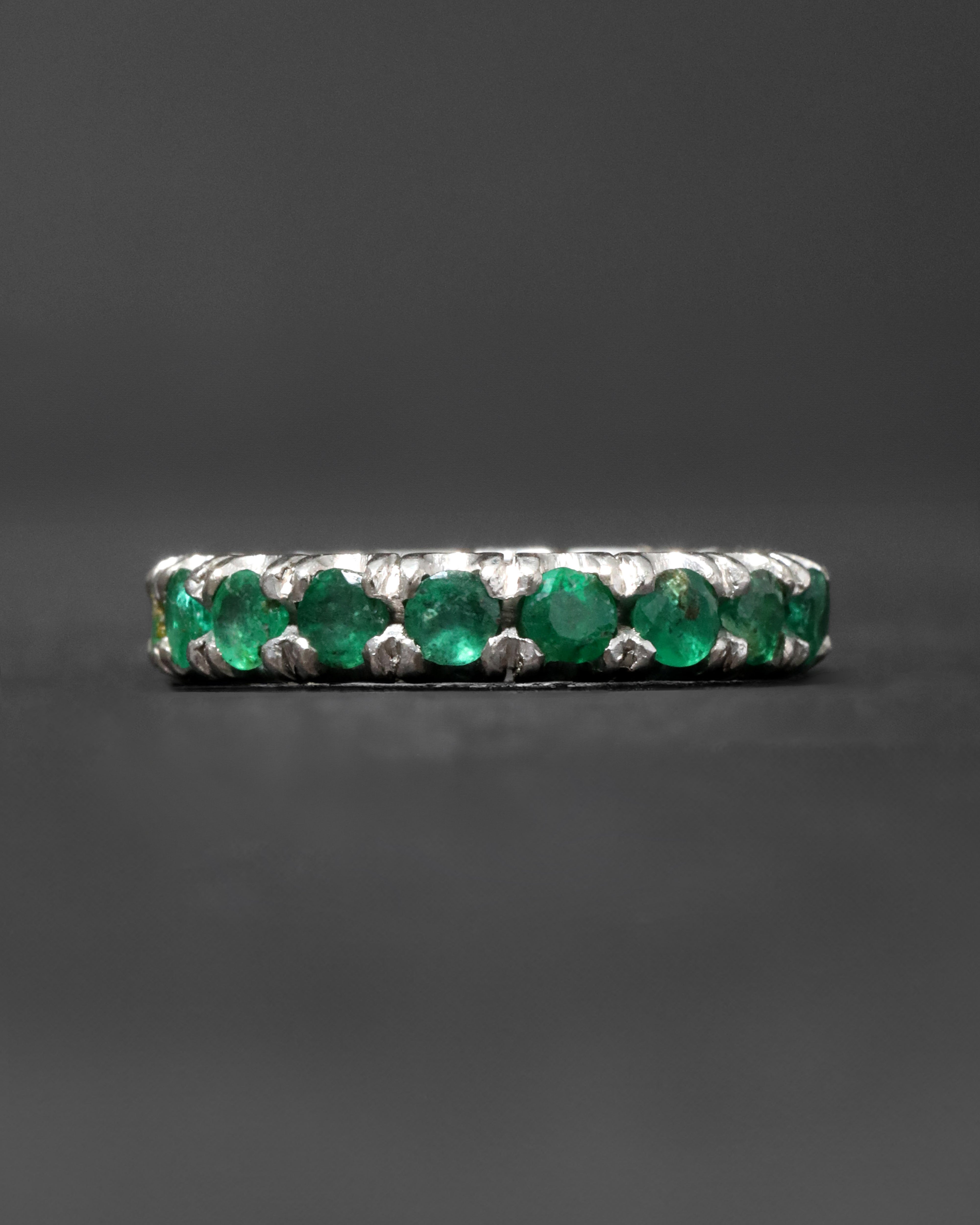 This timeless 14k gold vintage eternity band ring has vibrant emeralds prong set all around. Perfect for stacking or wearing as a solo glamorous statement.
