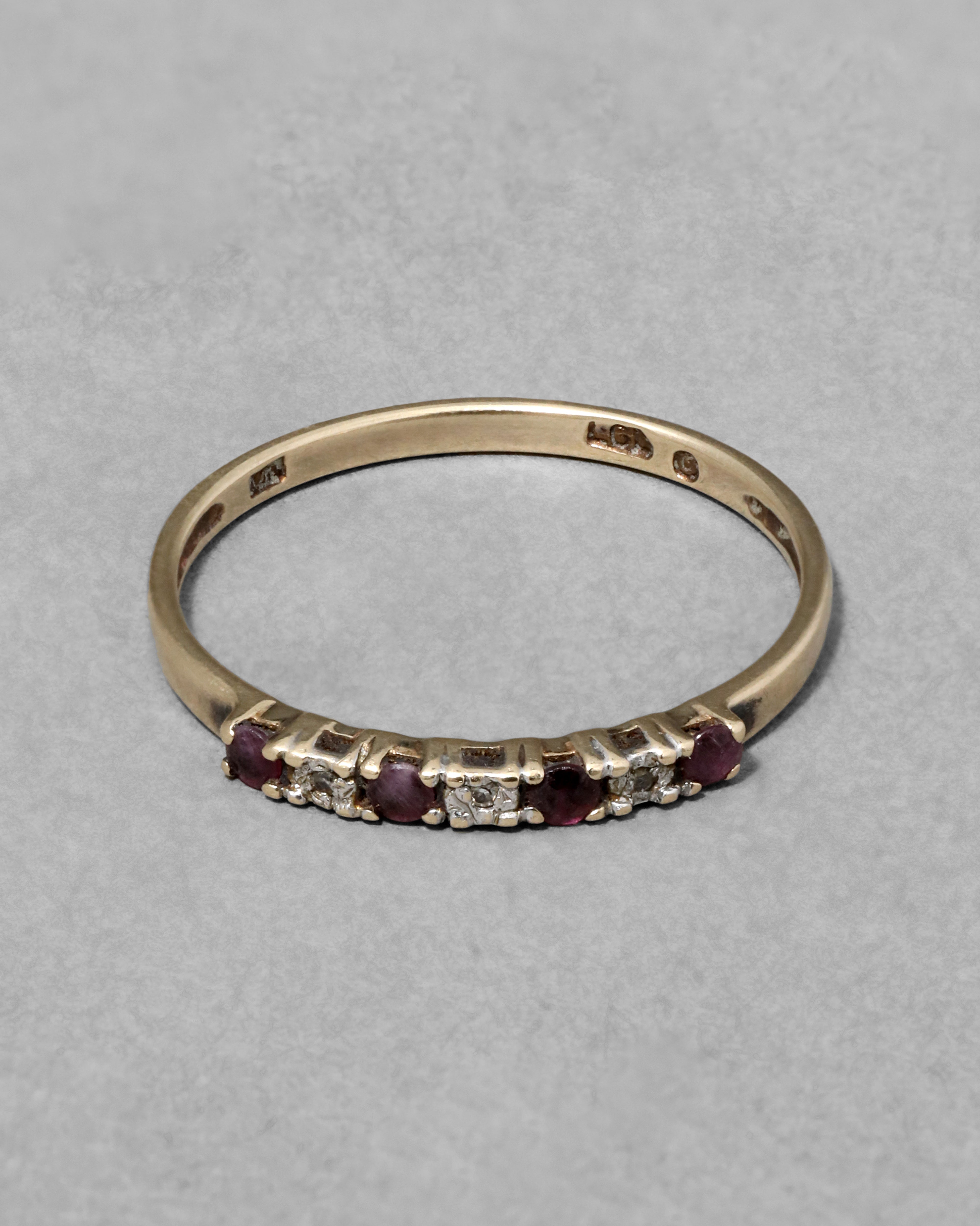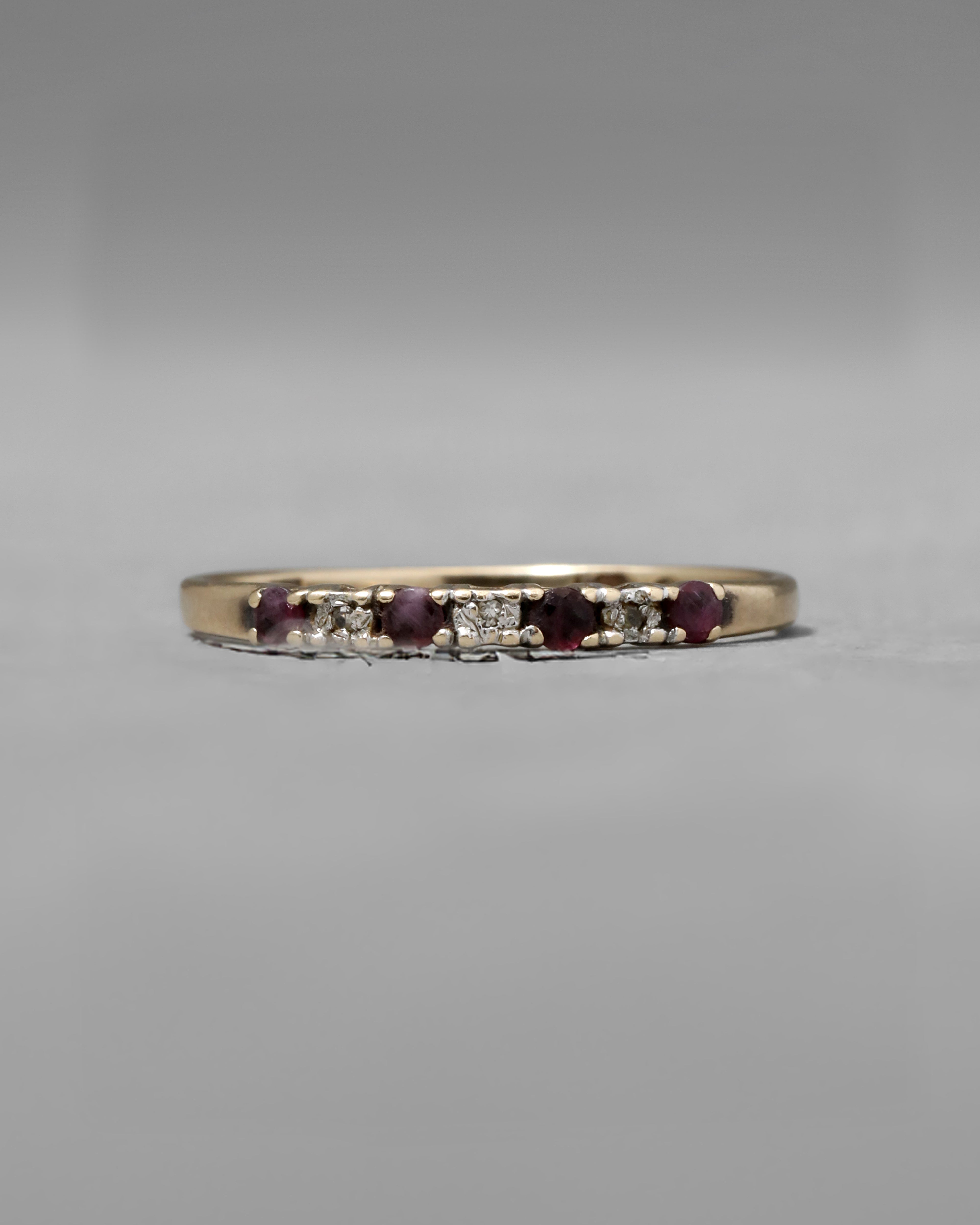 Timeless 10k white gold ring from the 1930s, with prong set contrasting glistening diamonds and rich garnets.