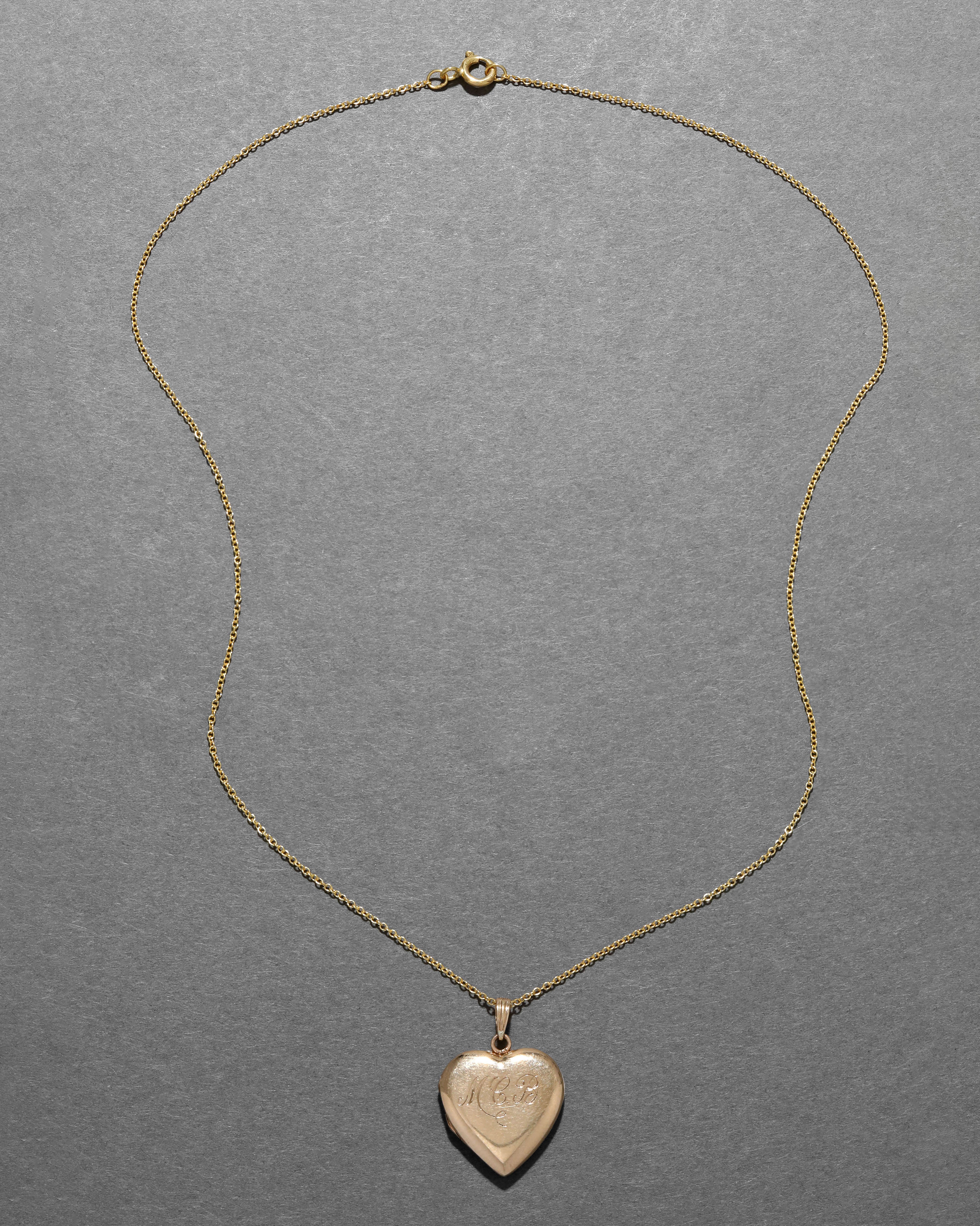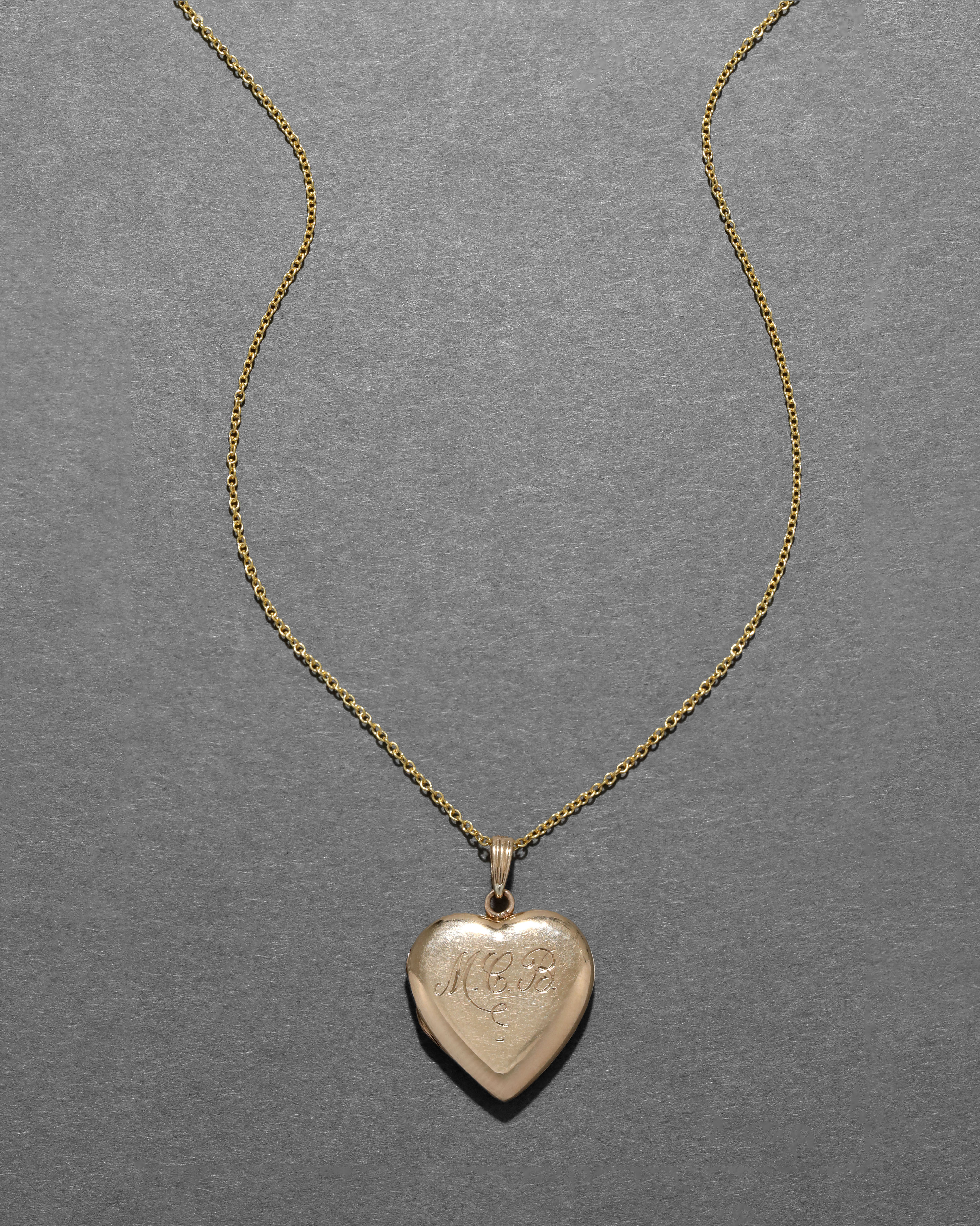 Dating from the 1930s, this 14k gold fill locket has the monogram "MCB" engraved across the front of its classic puffy silhouette. Strung on a 14k gold fill chain.