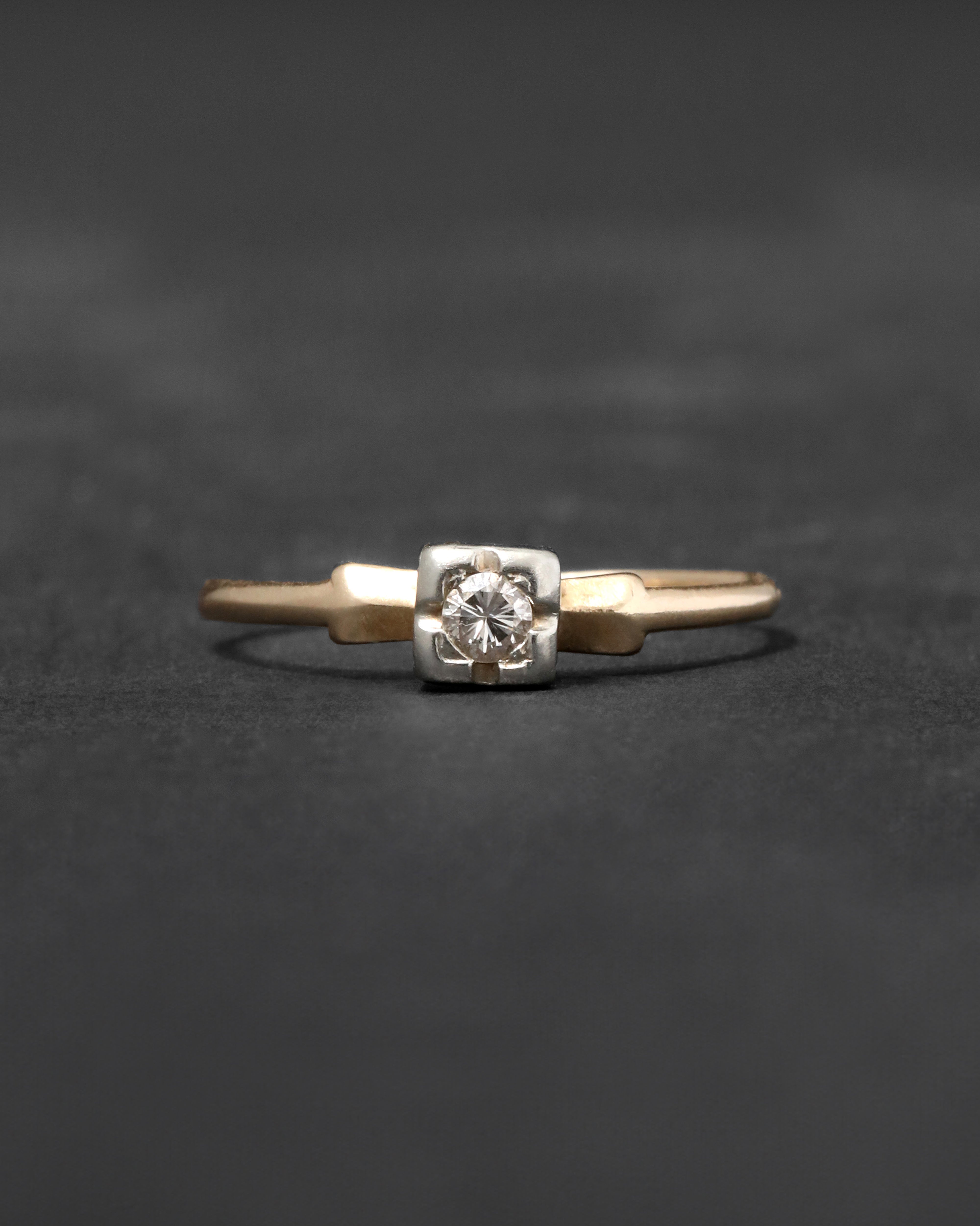 From the Art Deco 1930s, a glistening diamond is set into a raised white gold head setting on this 14k gold ring with a classic Deco design silhouette.