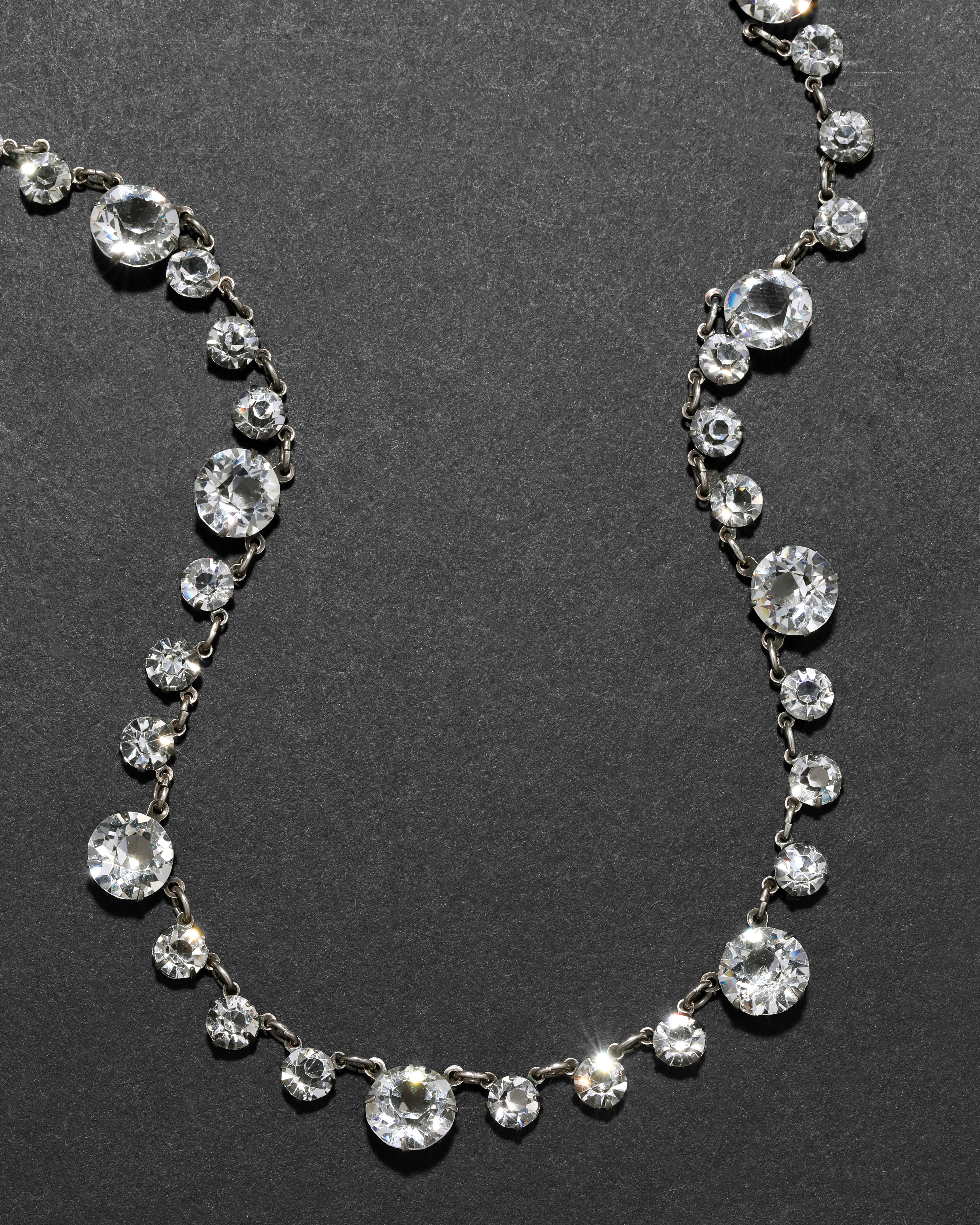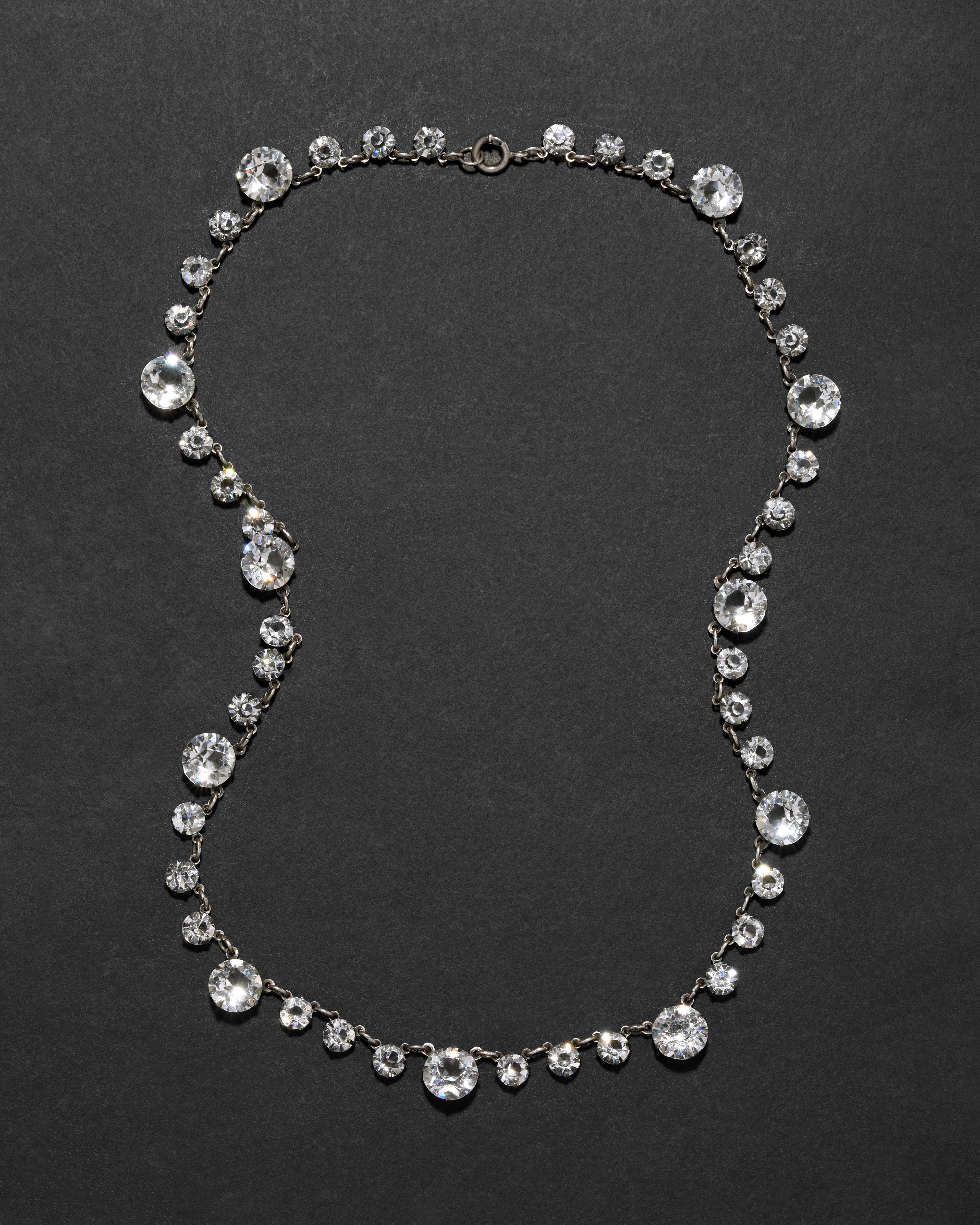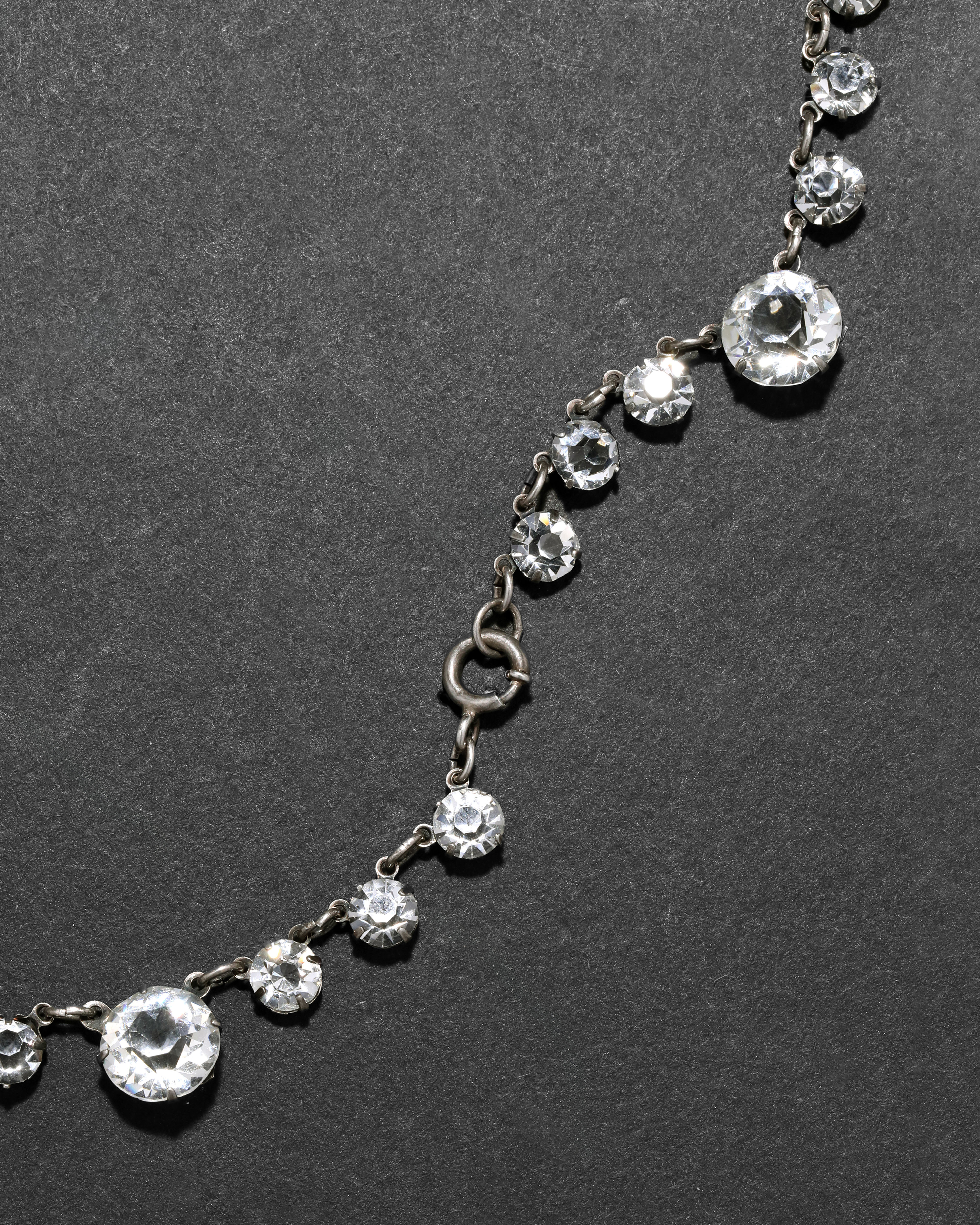 From the glitzy 1930s, this opulent sterling silver riviera necklace has an array of faceted cut quartz linked throughout.