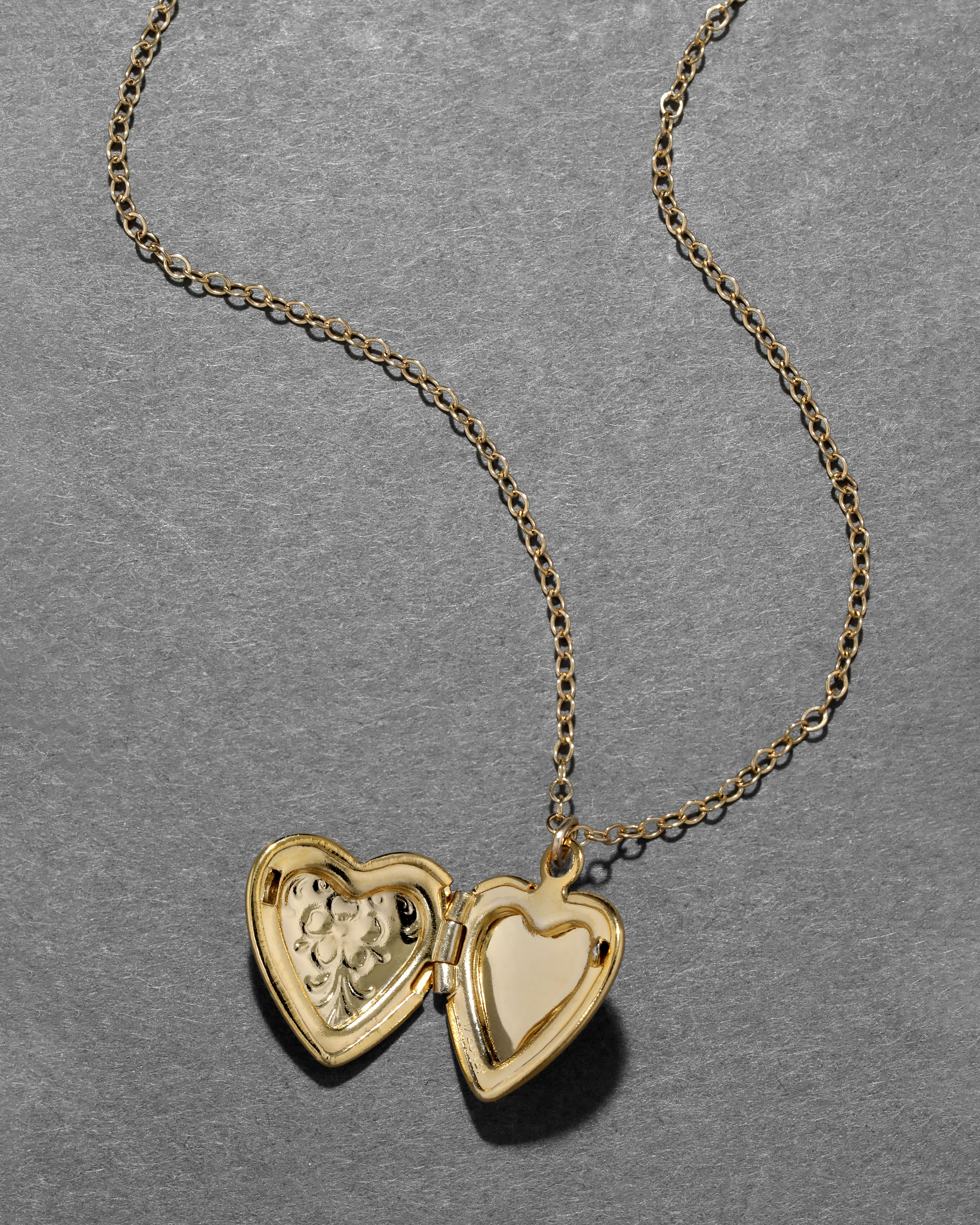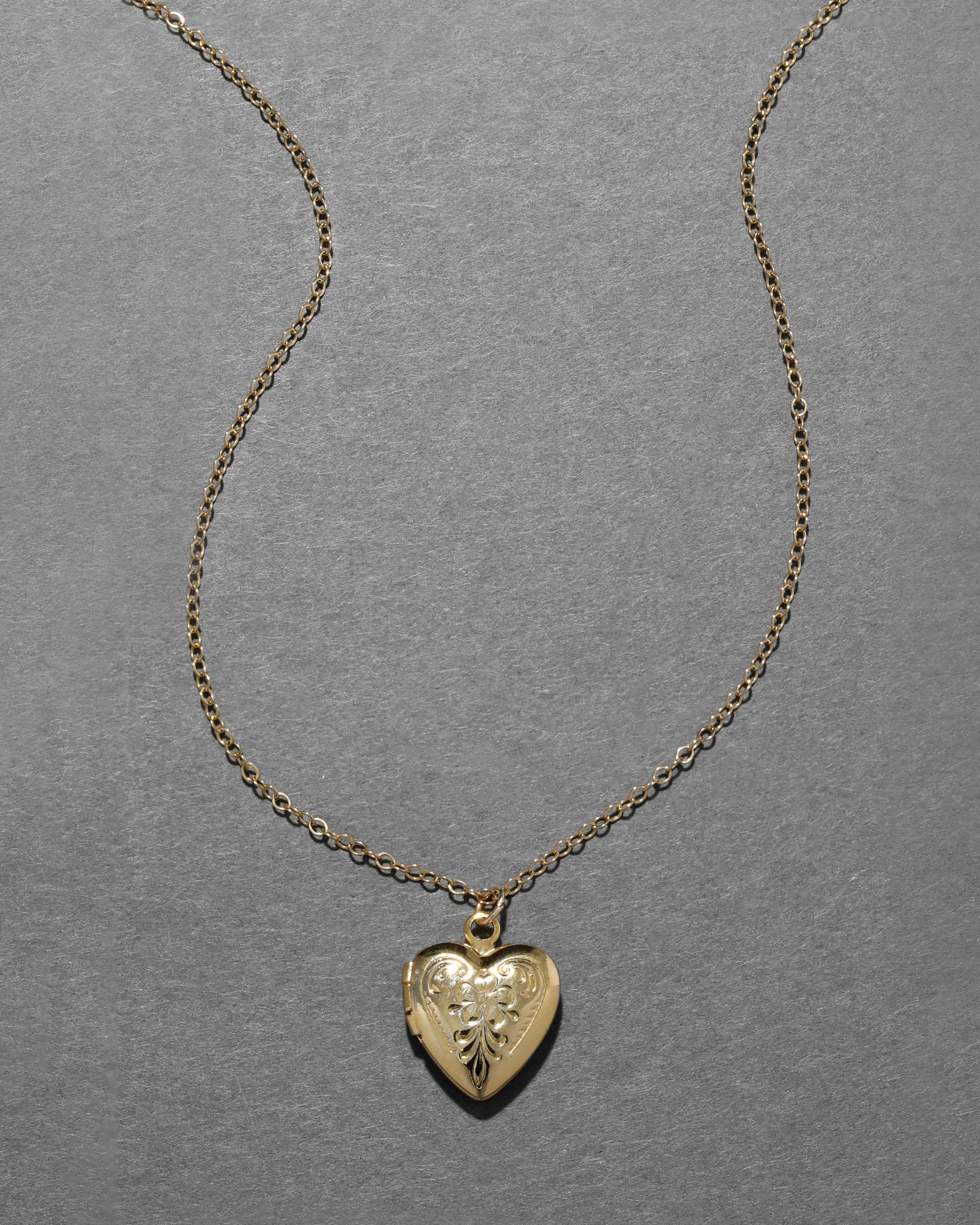 Dainty 12k gold fill small puffy heart locket from the 1940s, with a lovely filigree motif engraved on the face of its lustrous silhouette. Strung from a 14k gold fill chain.
