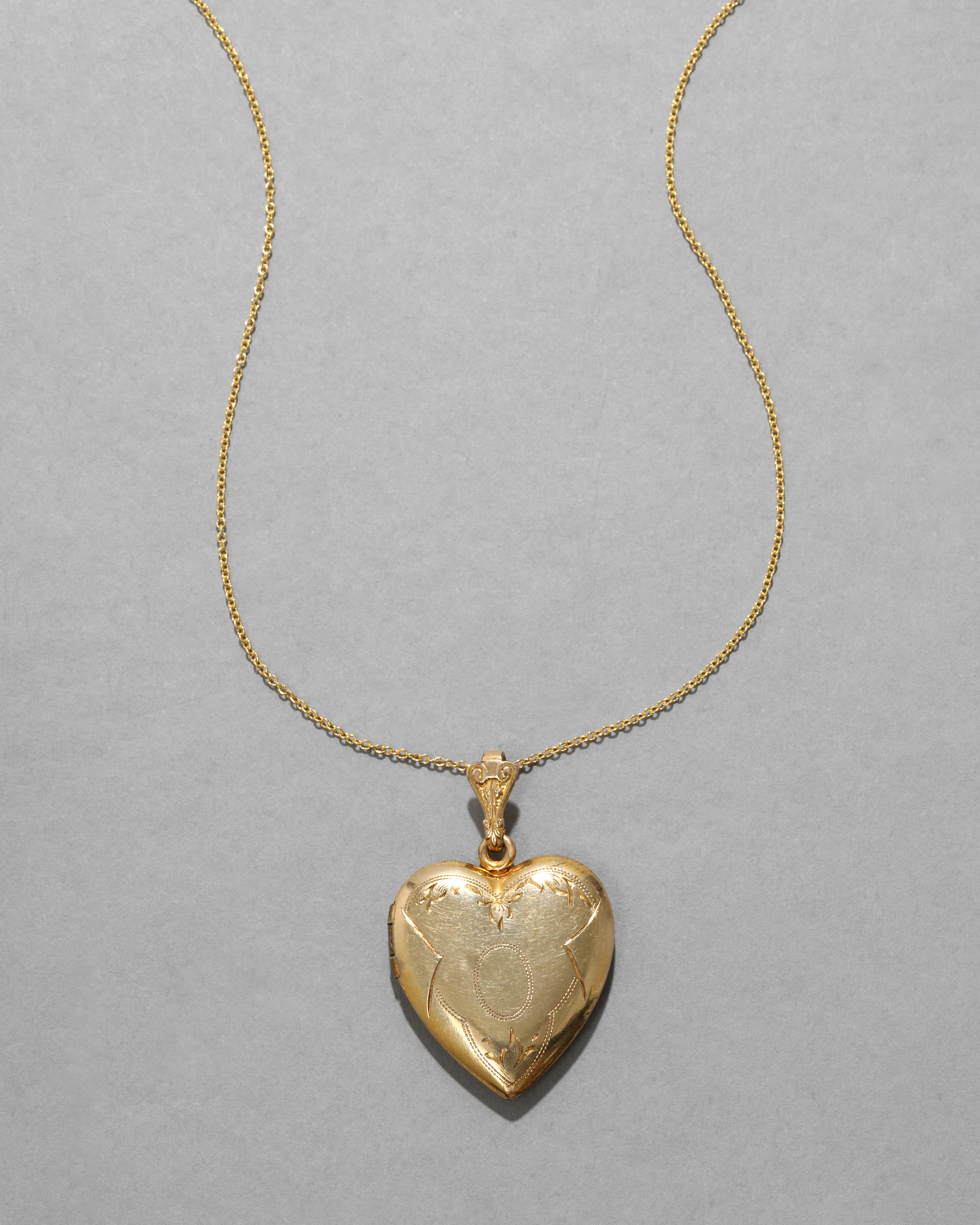 Dating from the 1940s, this petite 12k gold filled locket has a geometric and floral design hand-etched onto its heart shaped silhouette, on a 14k gold filled chain.