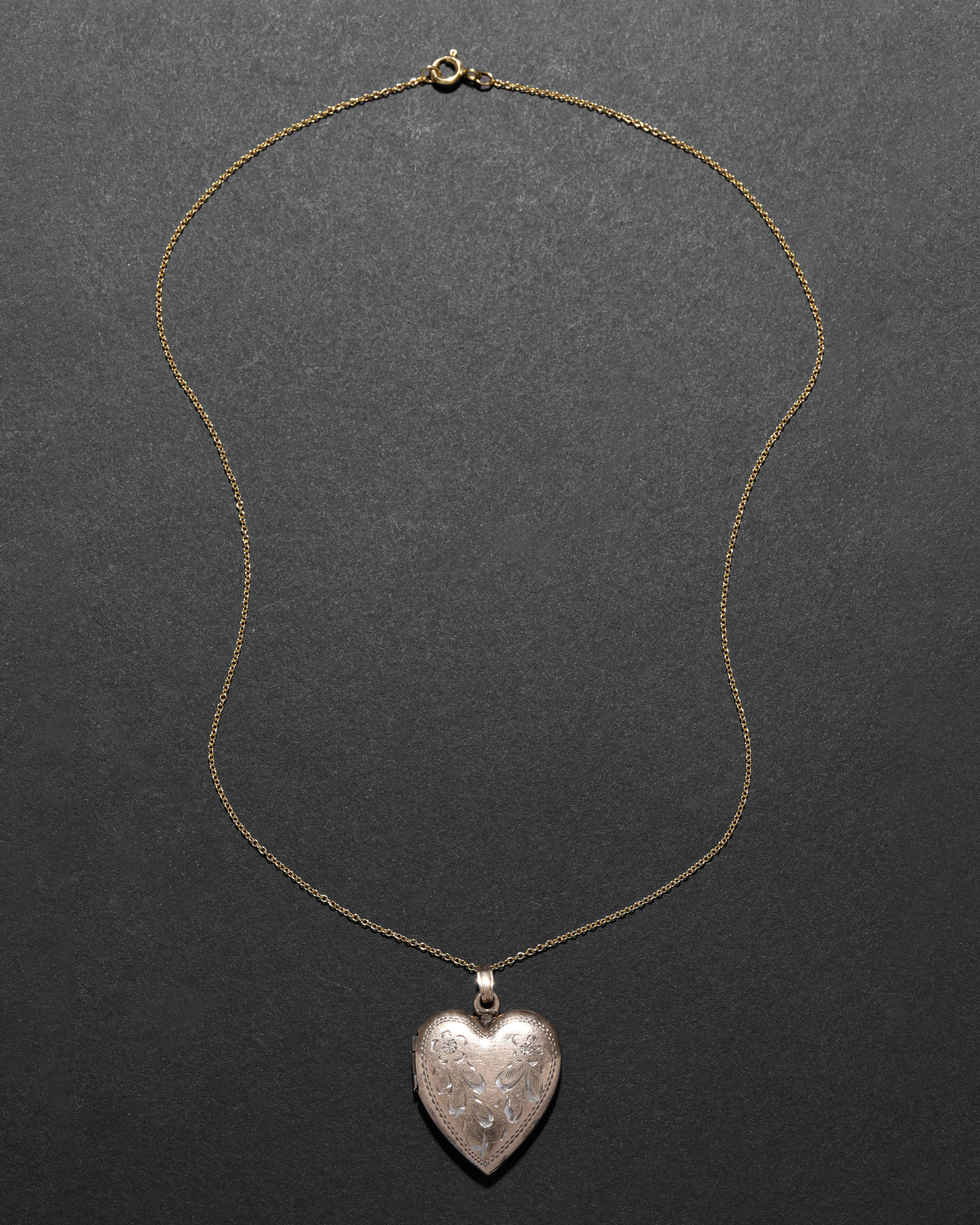 This heart locket from the 1940s has a puffy silhouette of 12k gold fill over silver, with a floral motif etched onto its surface reflecting sparks of contrasting silver in the design. Strung on a 14k gold filled chain.