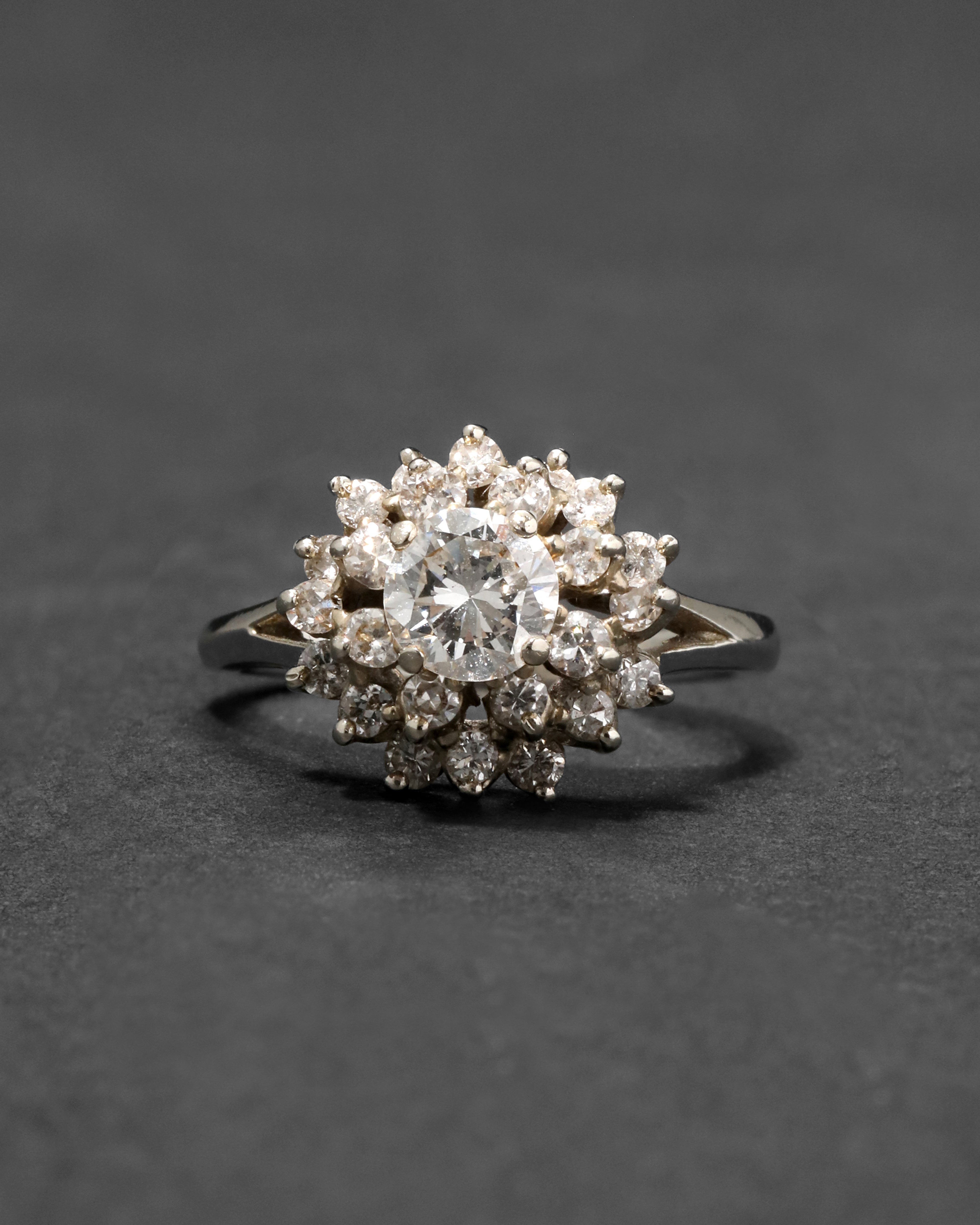 From the 1950s, this 18k white gold princess ring has a gorgeous stacked halo silhouette of individually set diamonds.