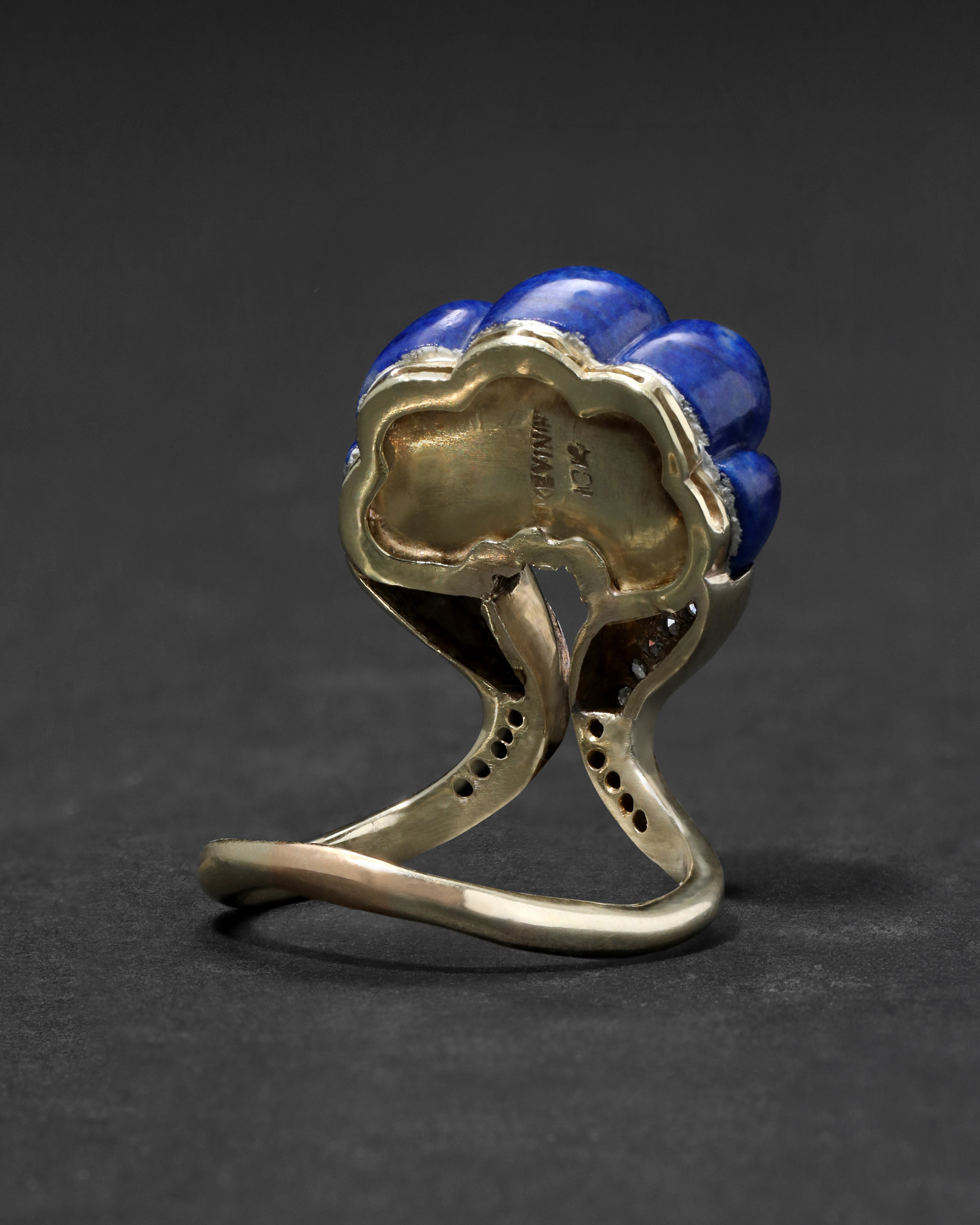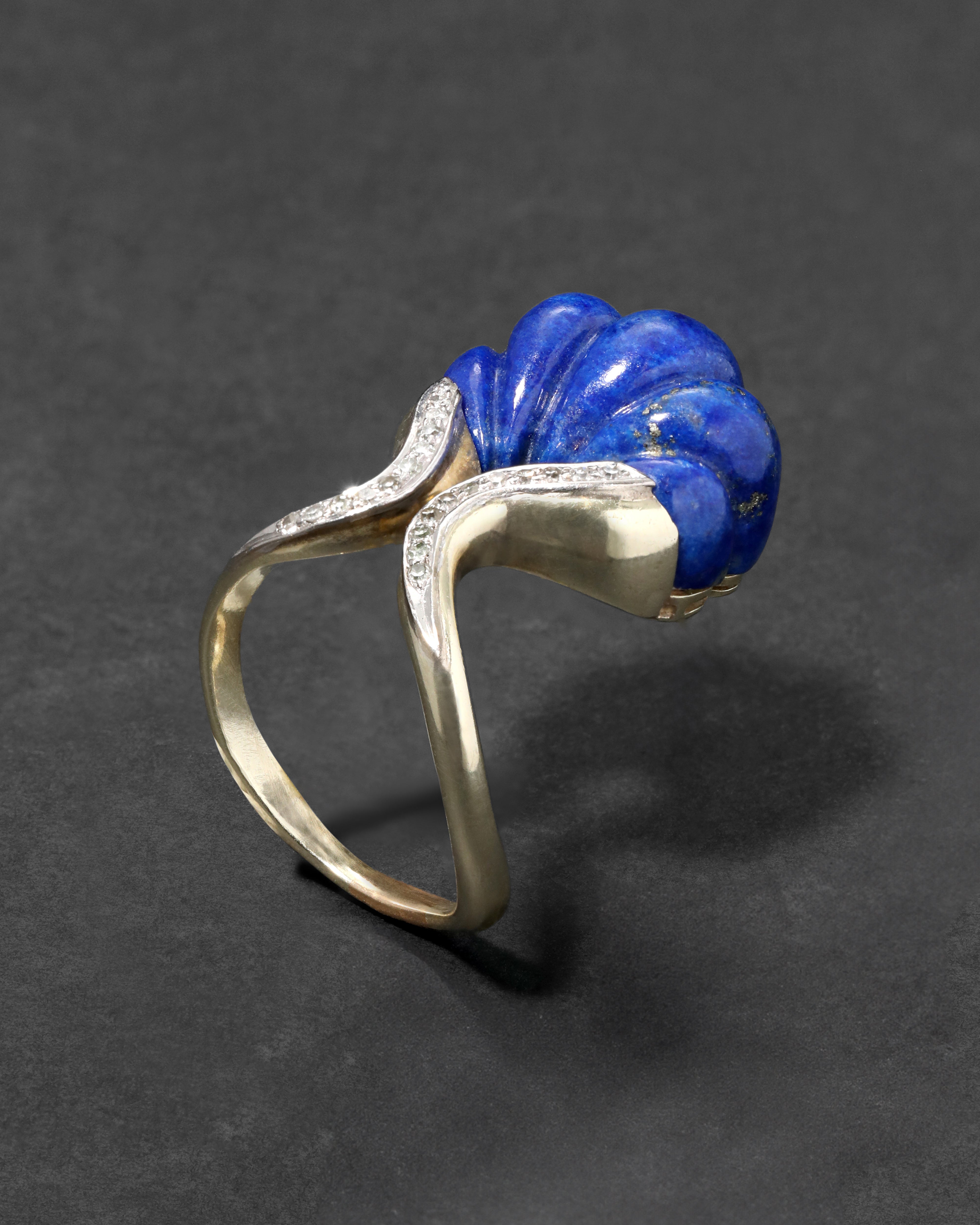Luxe 18k gold ring from the 1960s with a sinuously sculptural silhouette, accented with glistening diamond pavé in white gold settings, and topped with a scalloped hand carved lapis lazuli.
