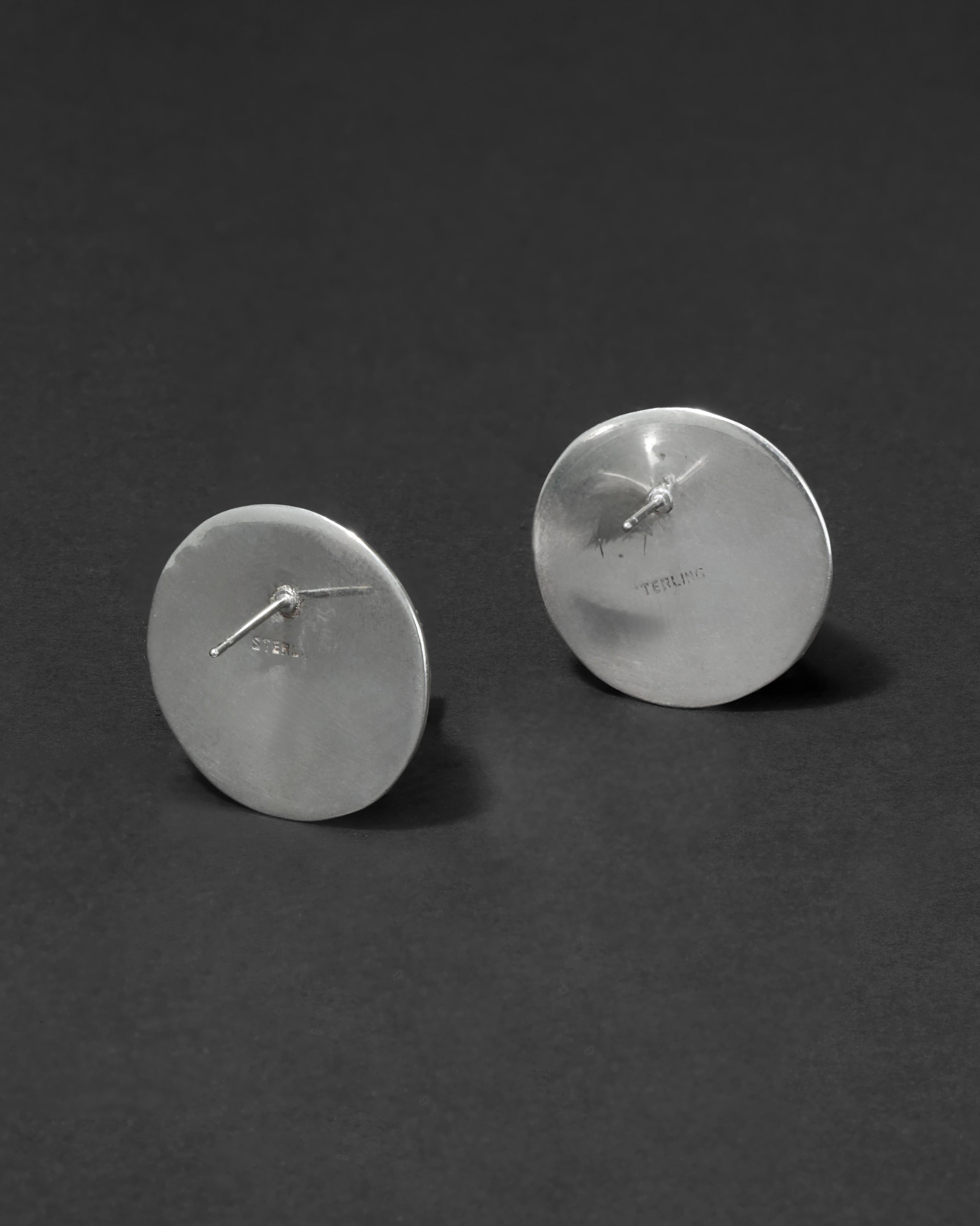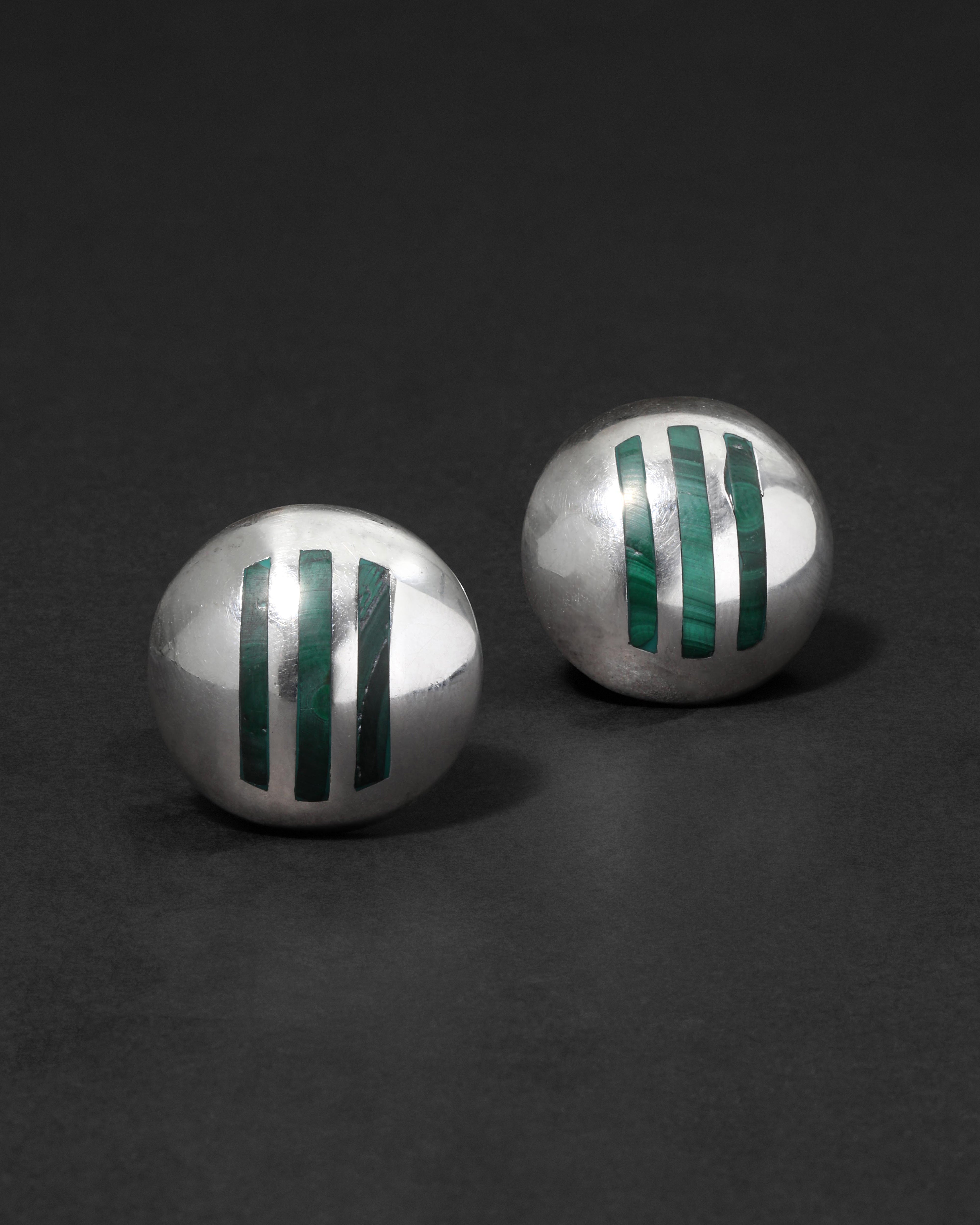 Sleek sterling silver post earrings with a Modernist domed silhouette, accented with bands of vibrant malachite inset with a striped motif.